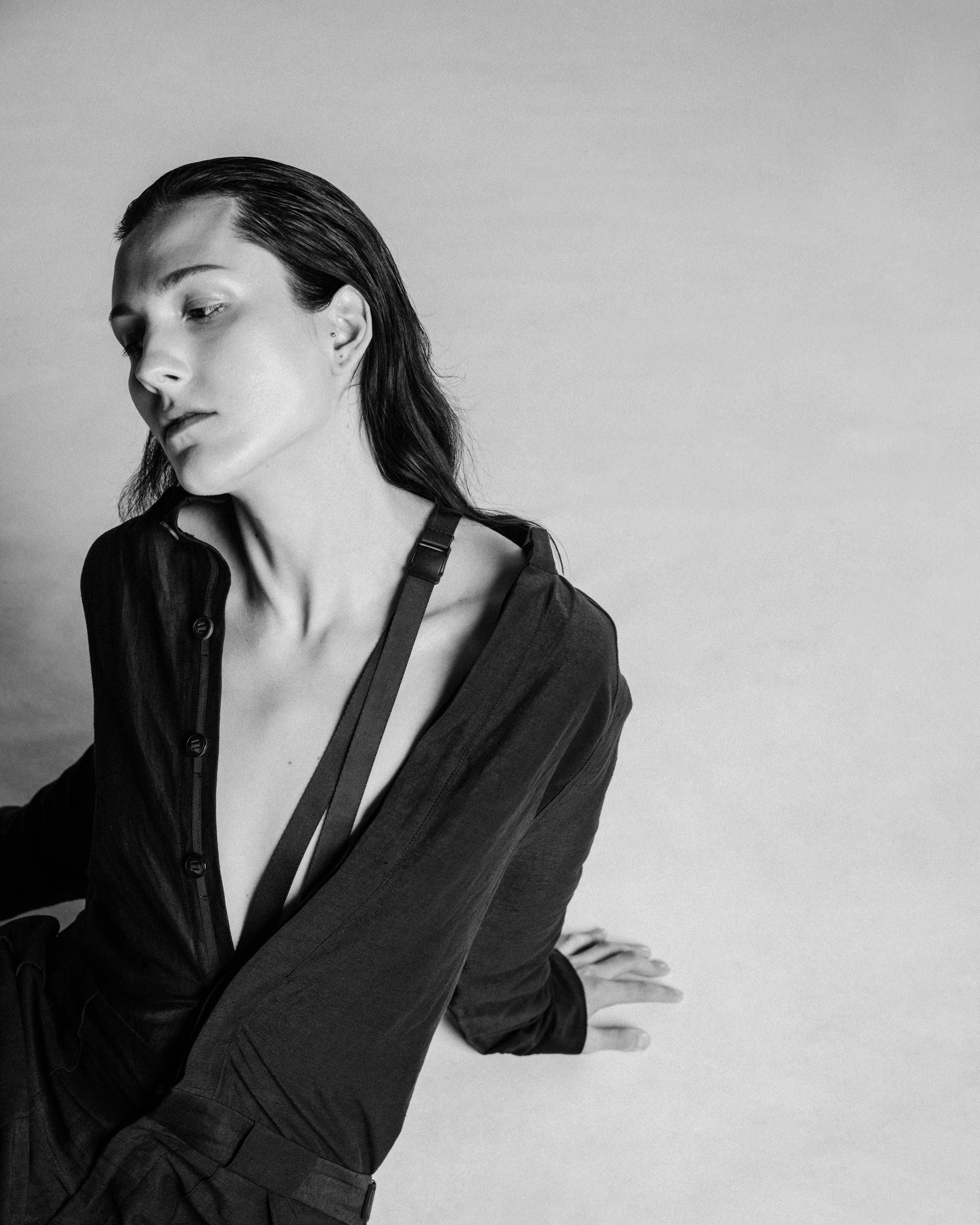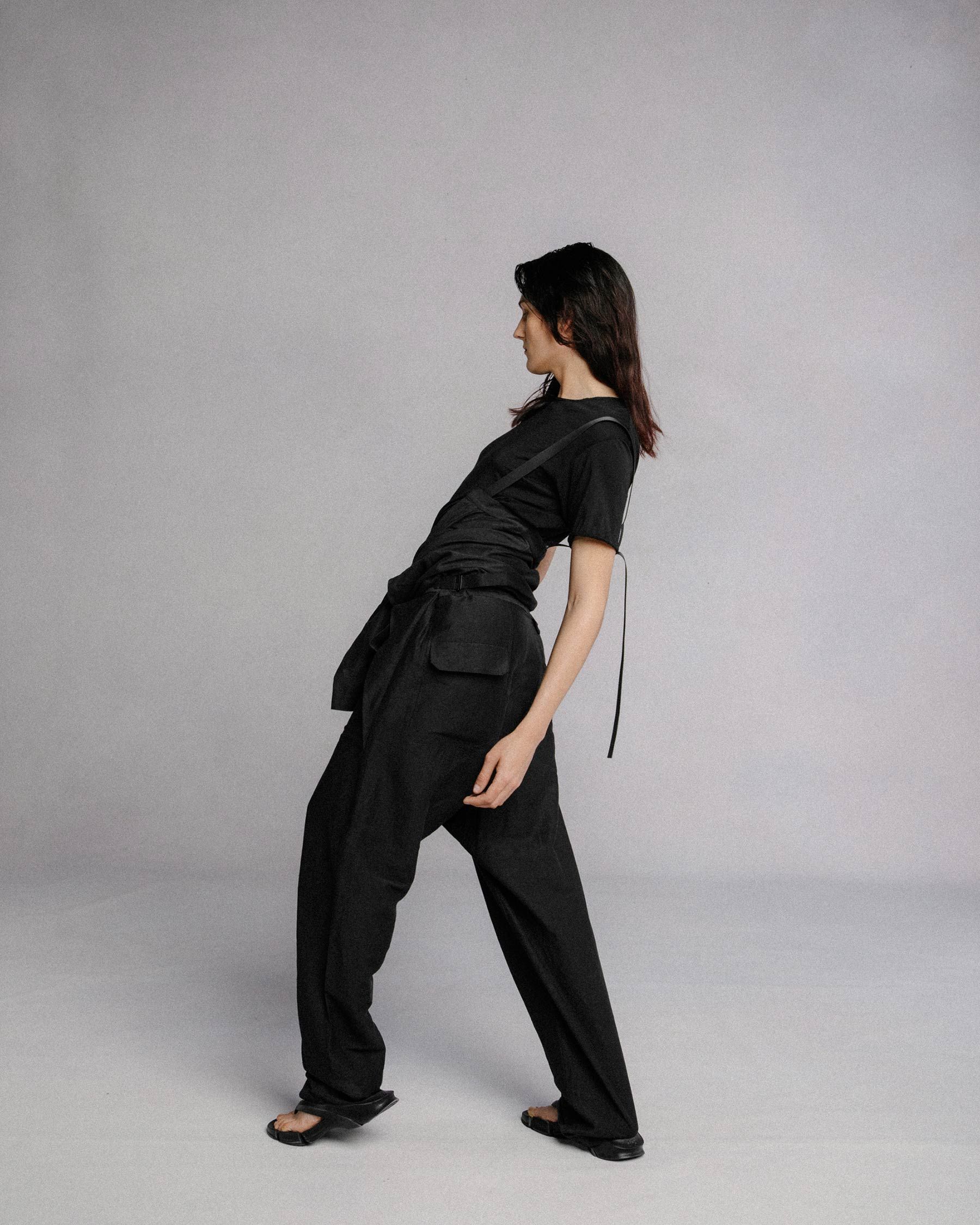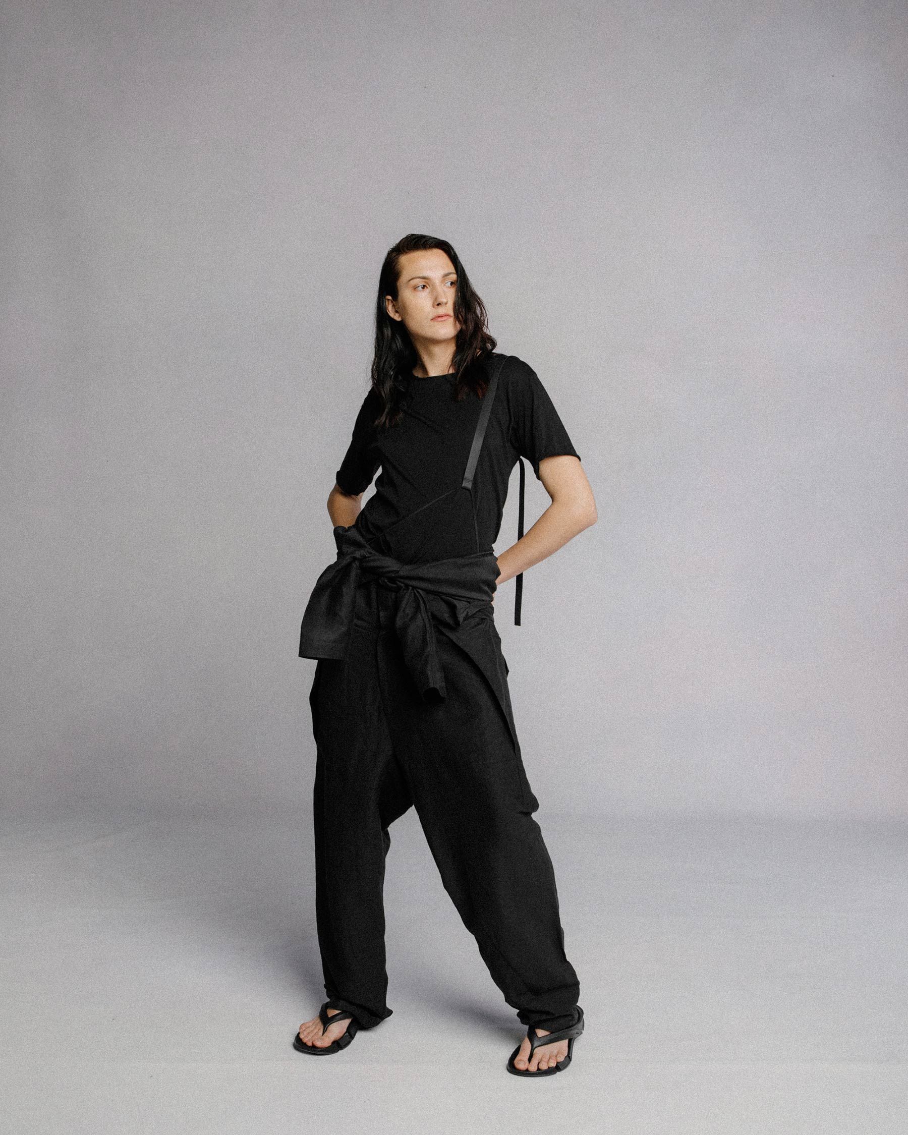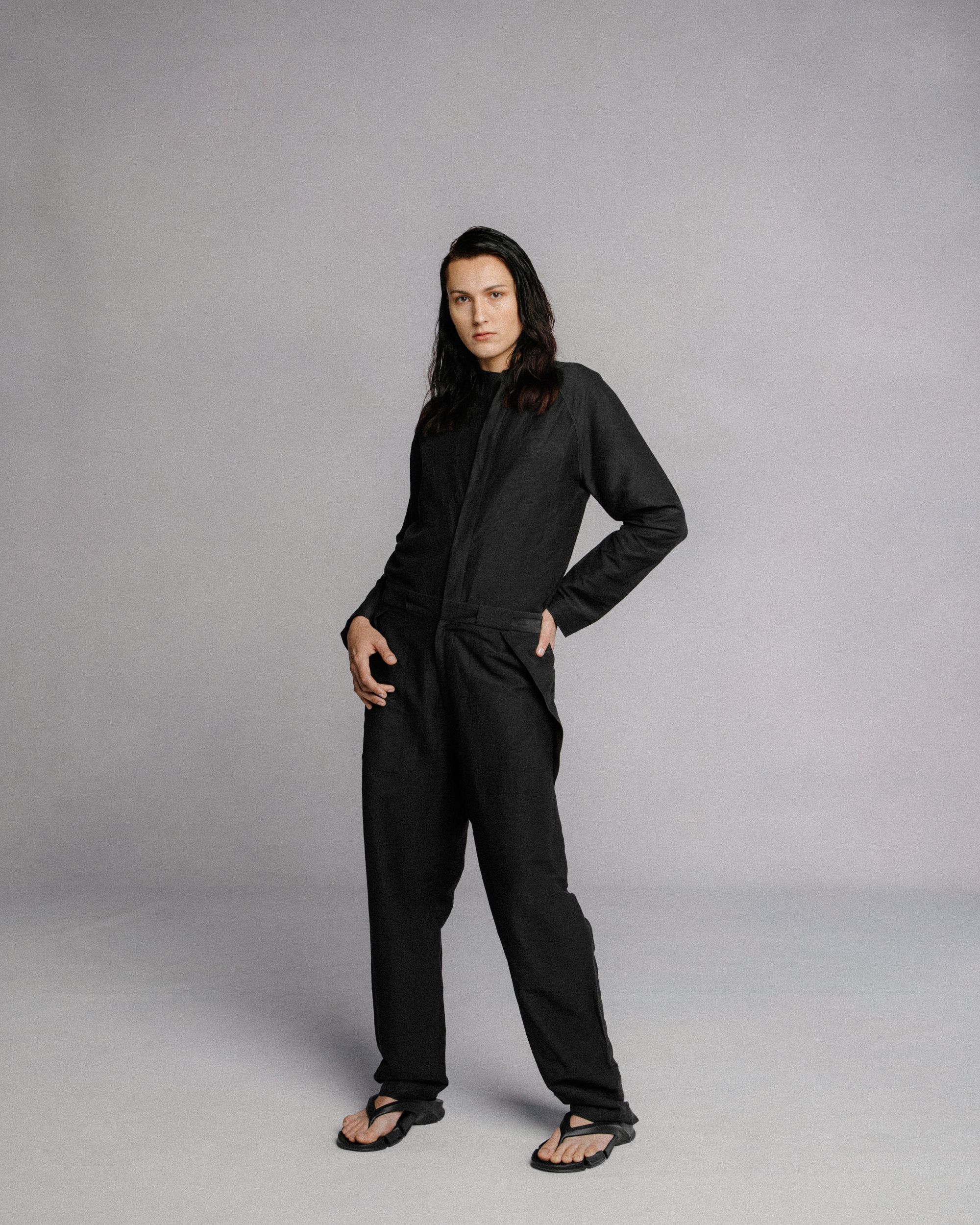 A self-styling jumpsuit experiment in the radically open yet opaque Injected Linen fabric.