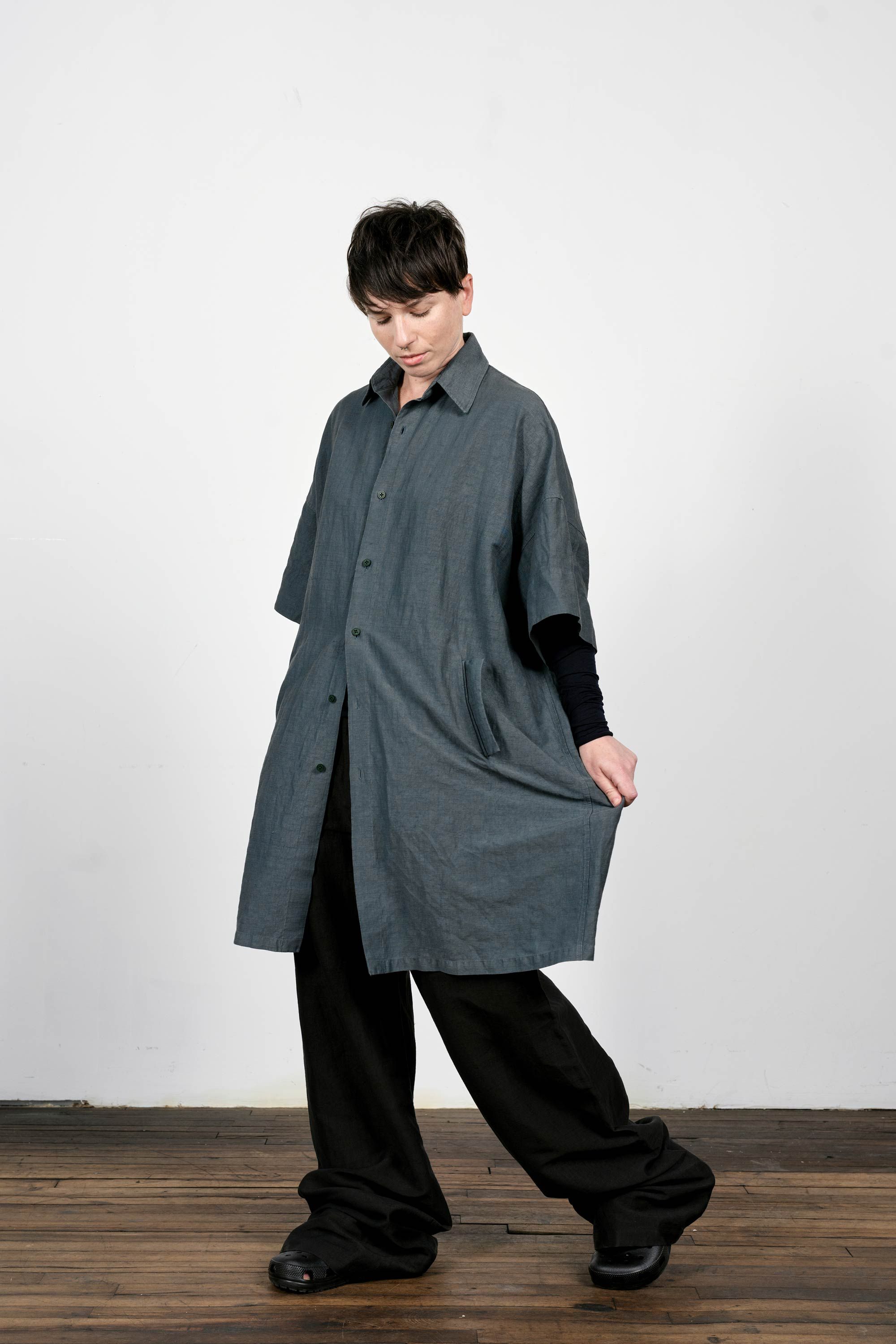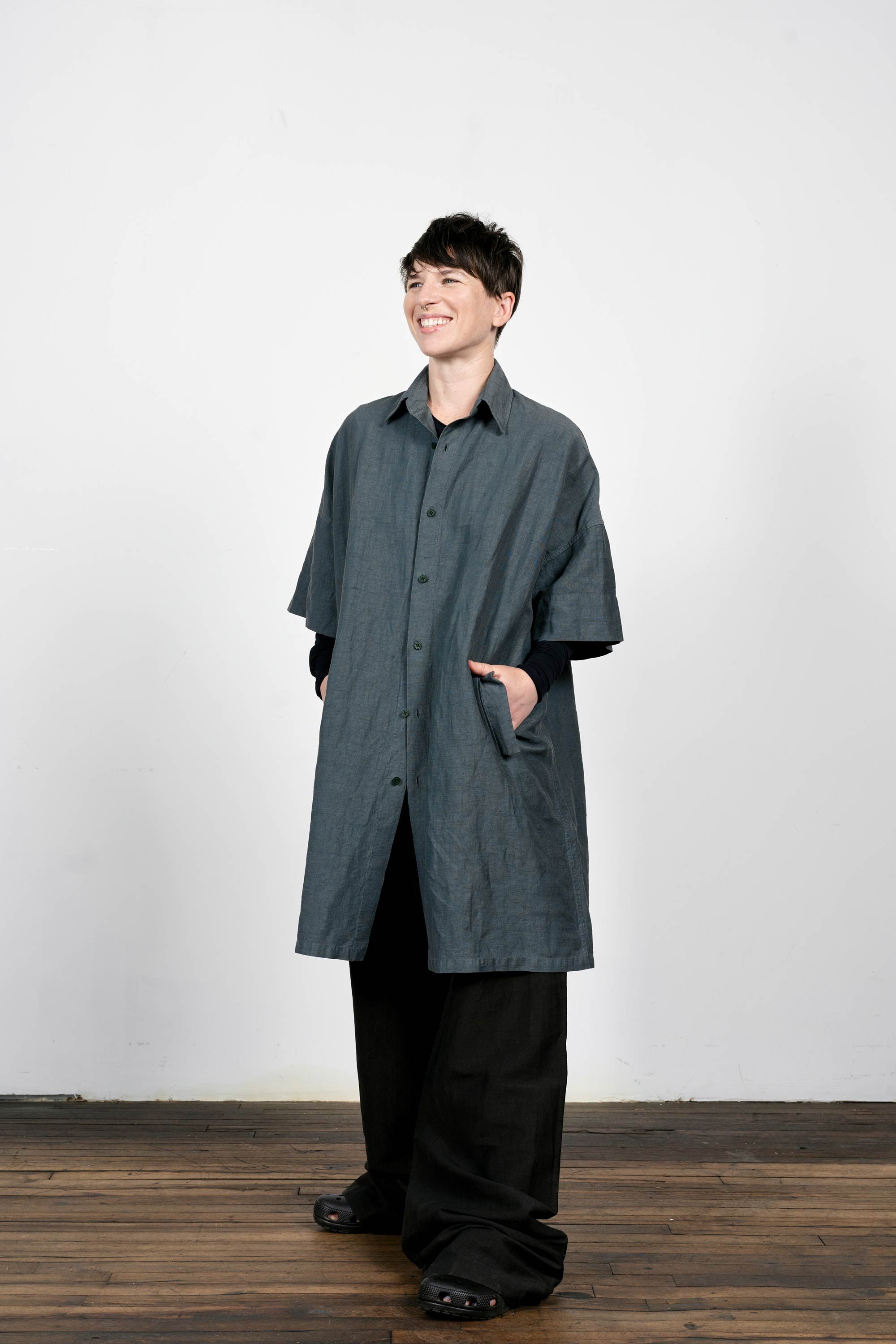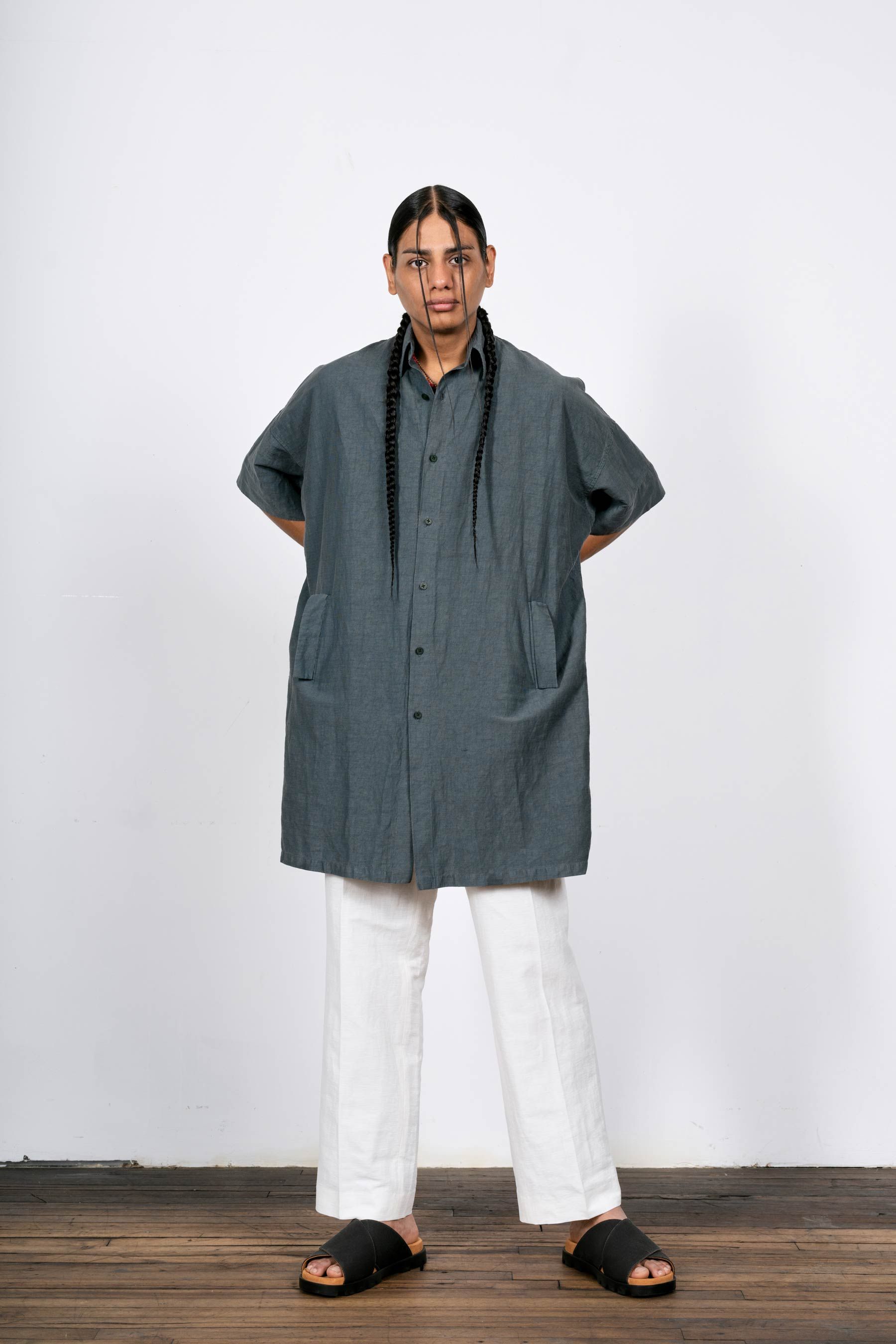 An experiment in extending a shirt downward. Made in Manhattan with the radically open-yet-opaque Injected Linen fabric.