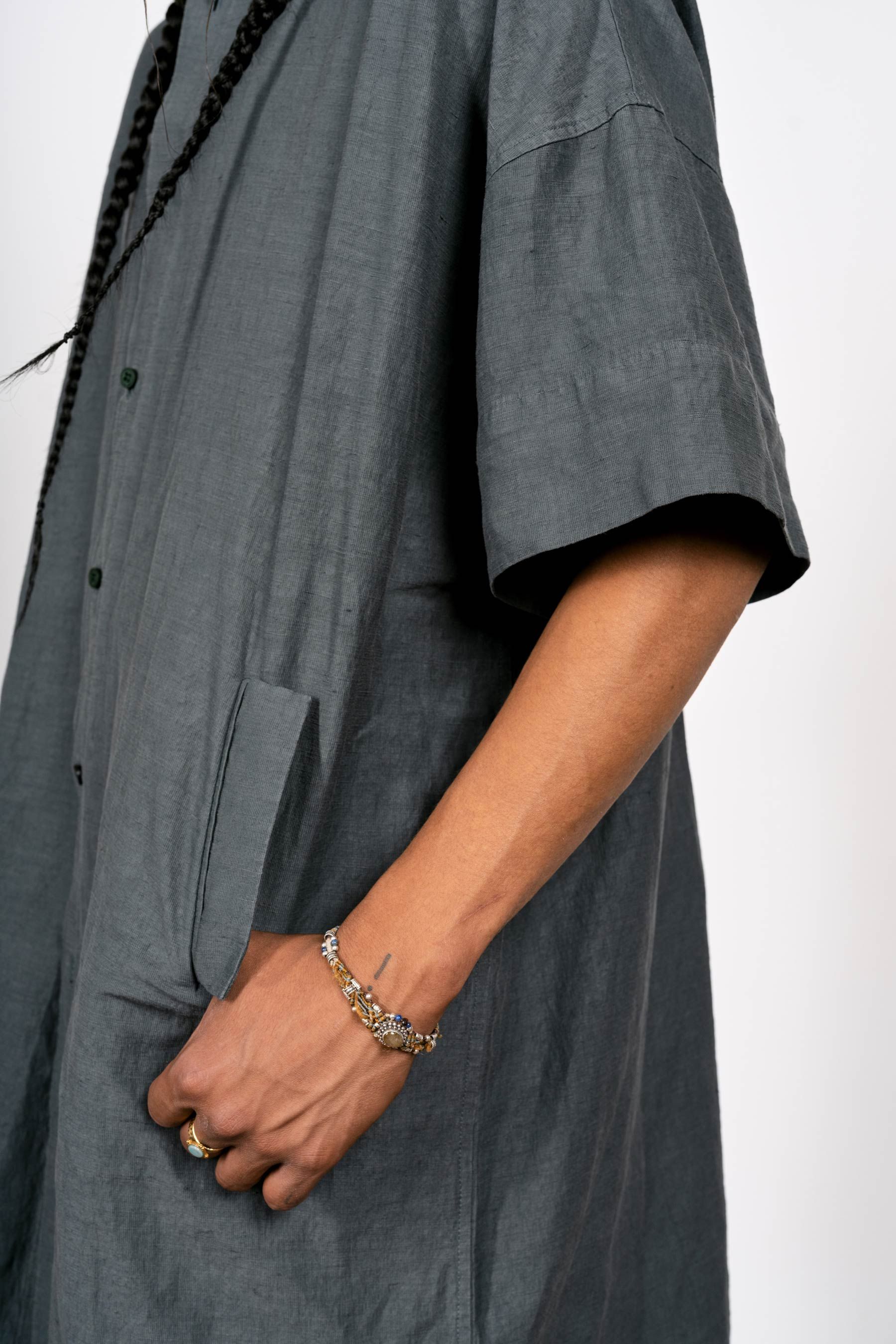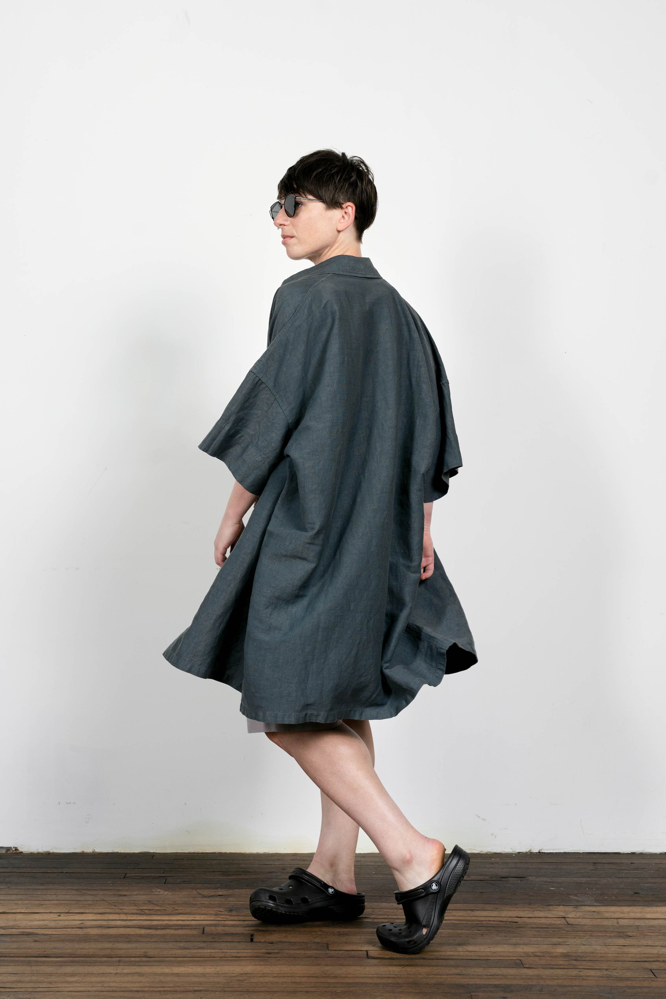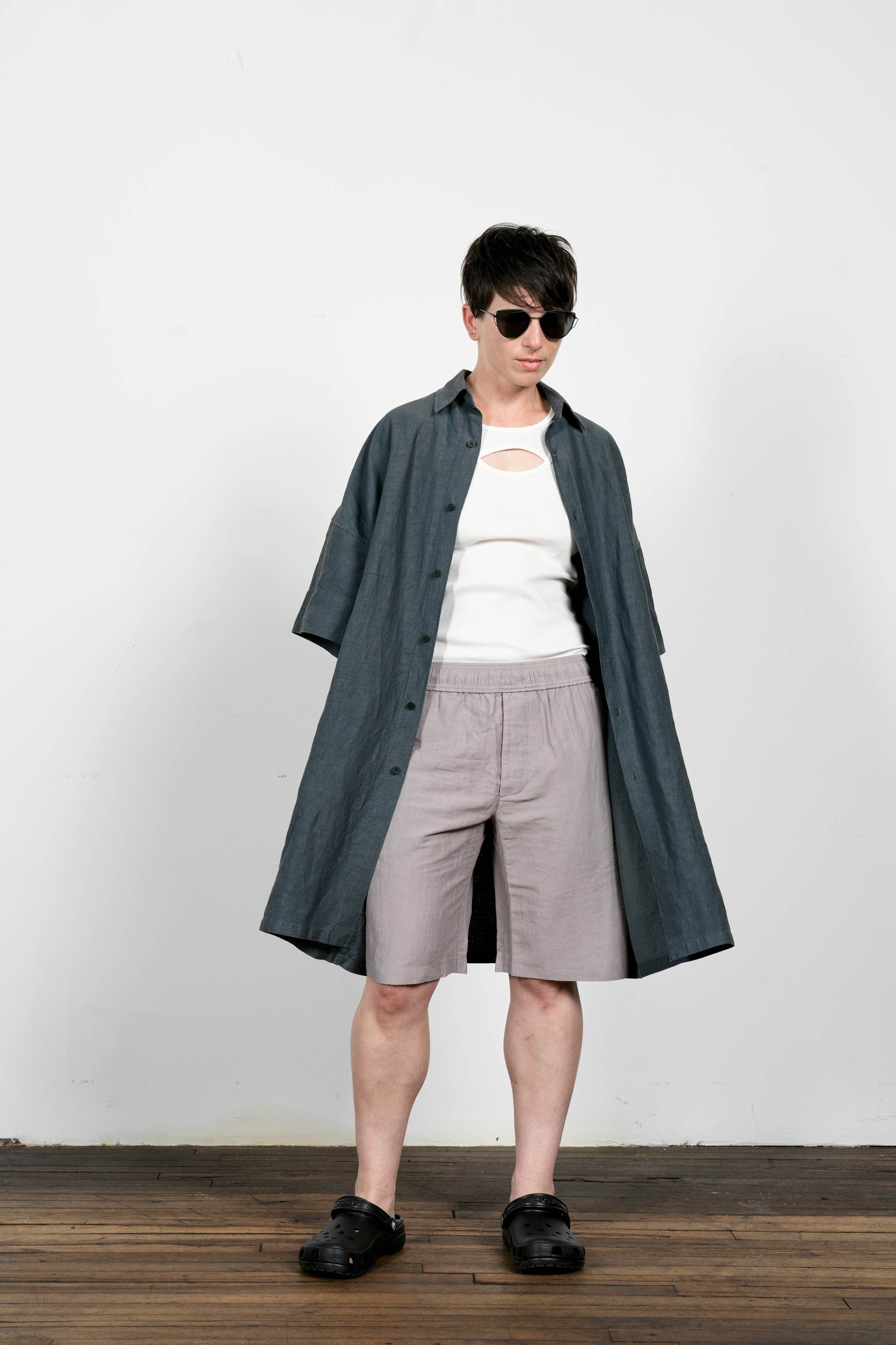 An experiment in extending a shirt downward. Made in Manhattan with the radically open-yet-opaque Injected Linen fabric.