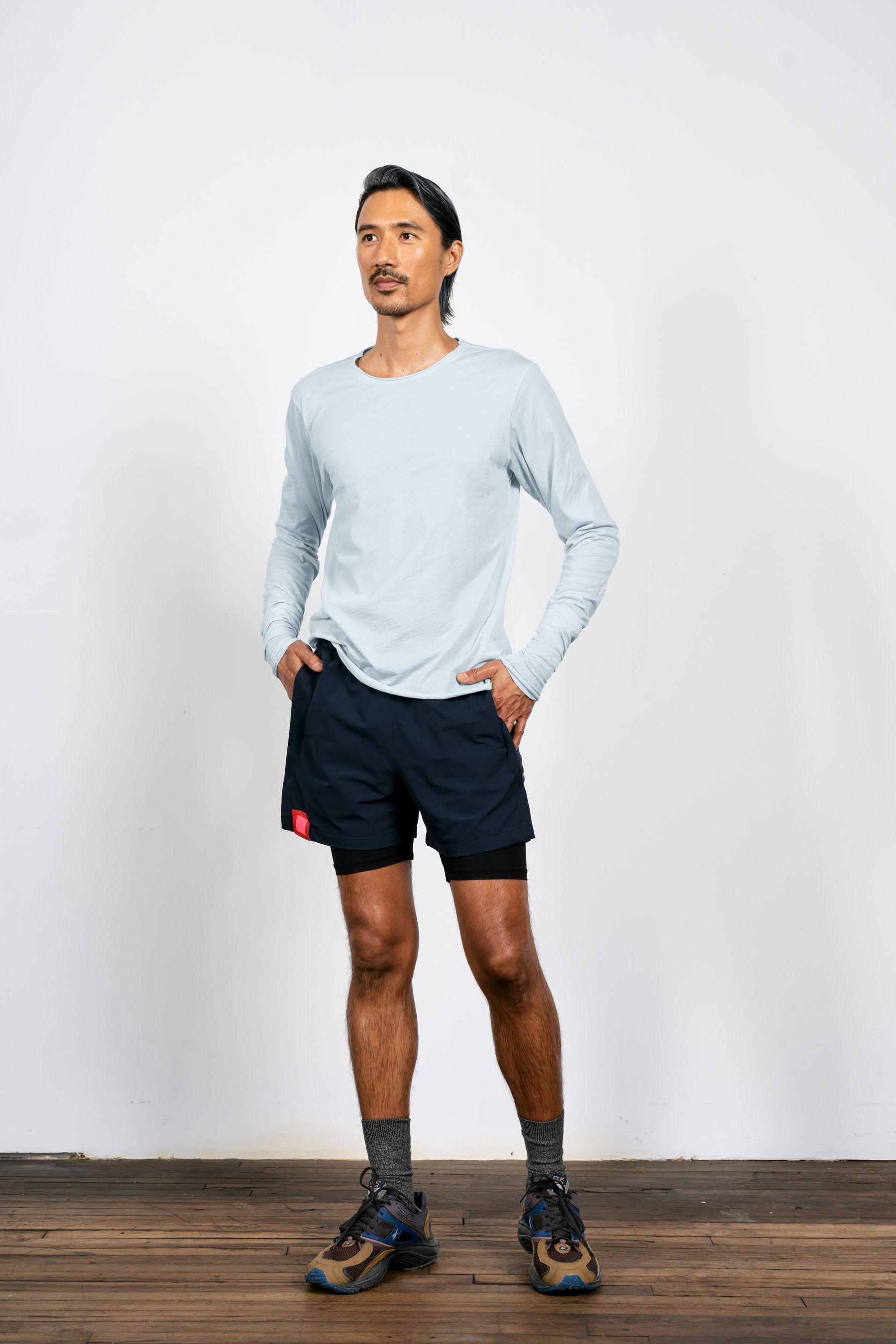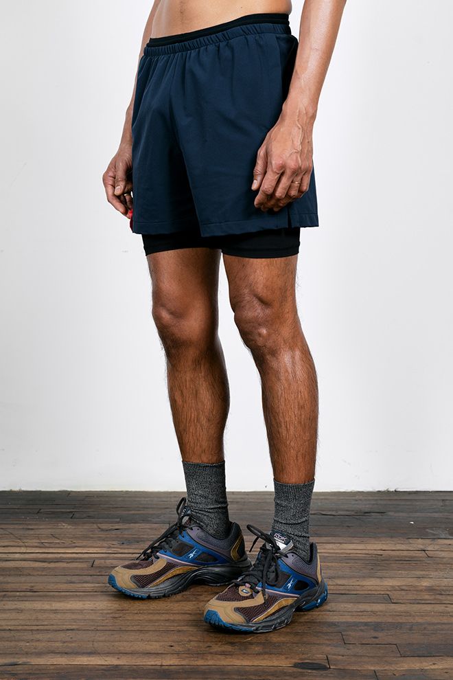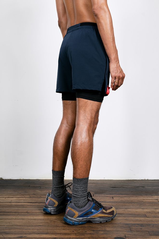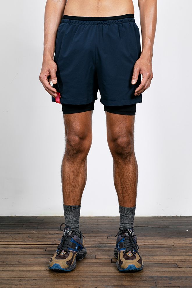 A double layer shorts experiment. The inner layer is a high stretch Eurojersey knit with two mesh pockets to hold things tight to the body. The outer la…