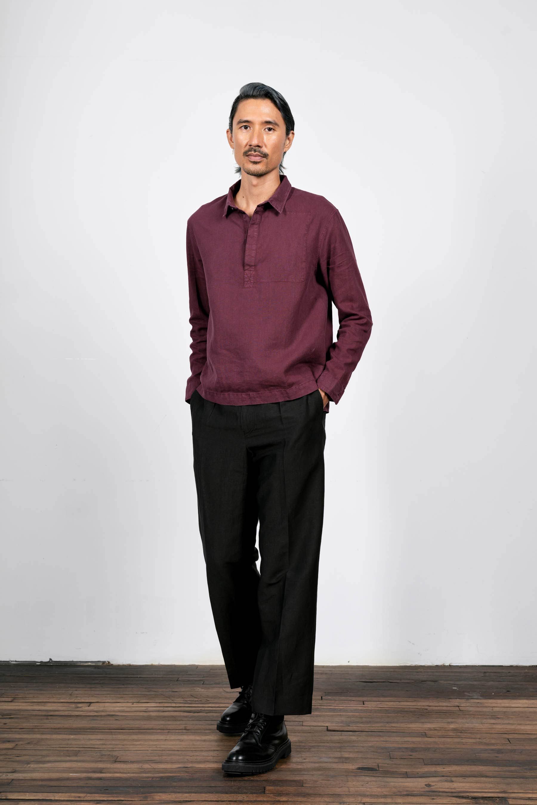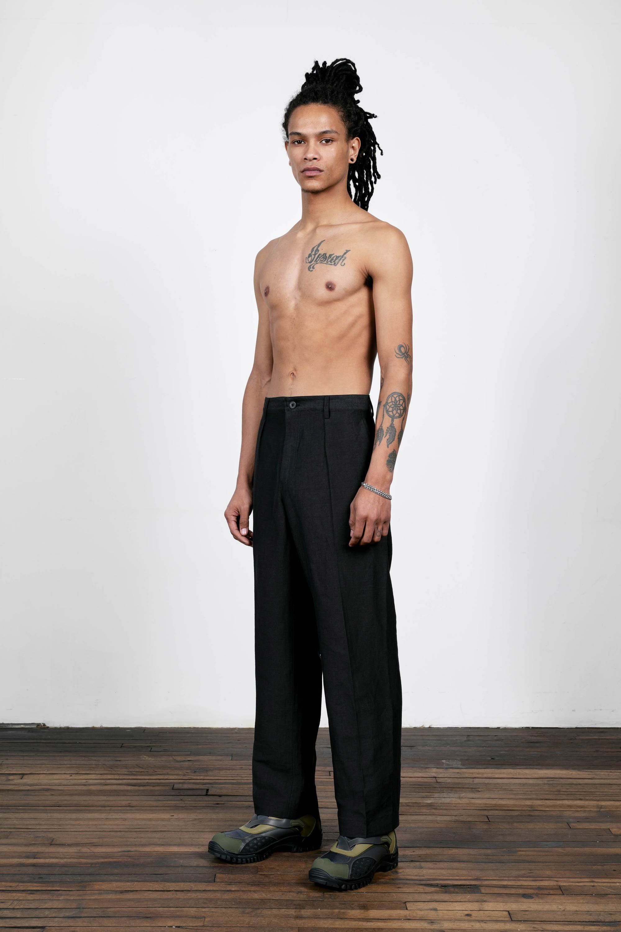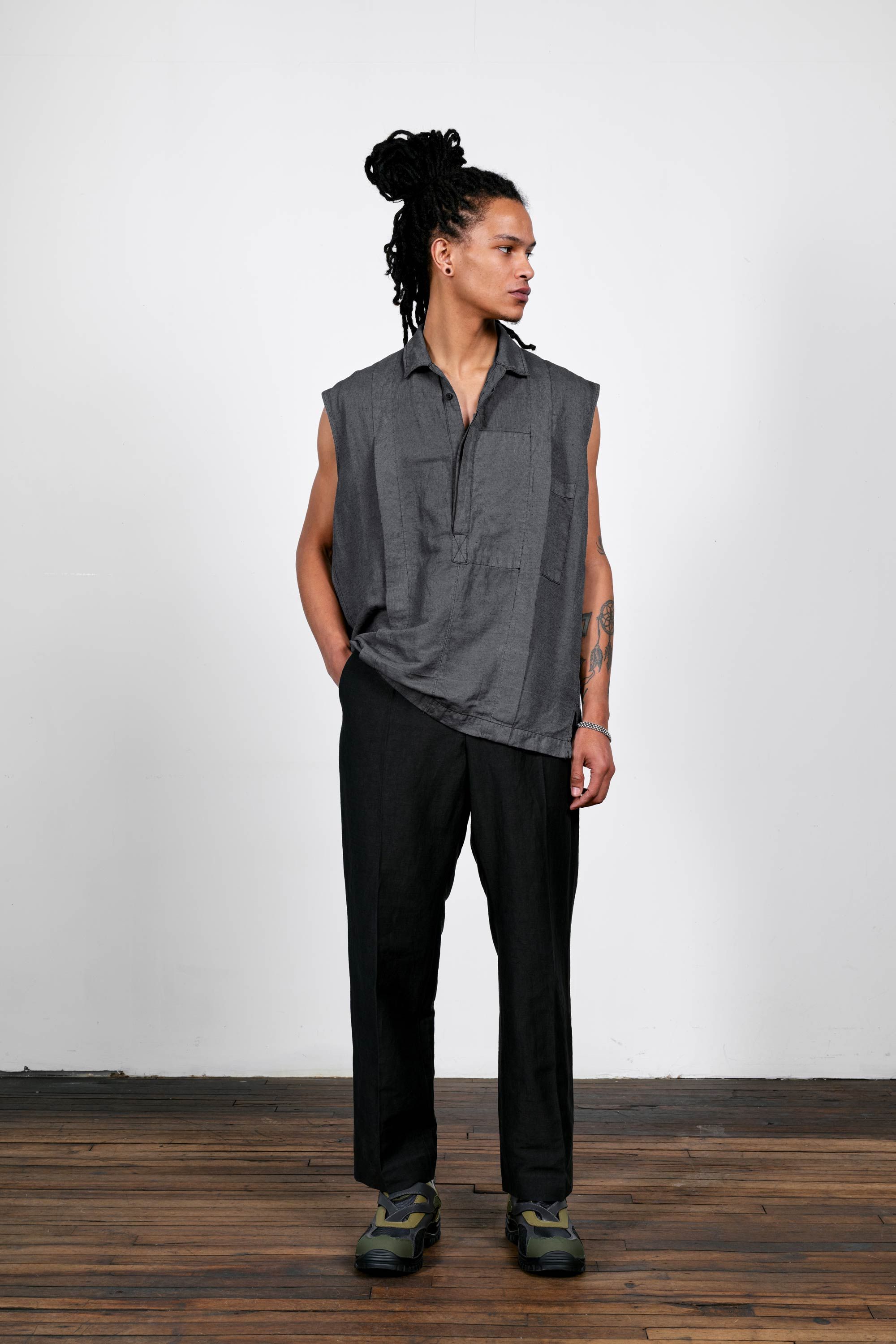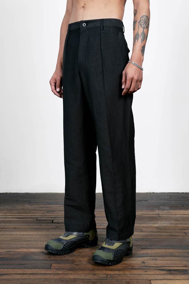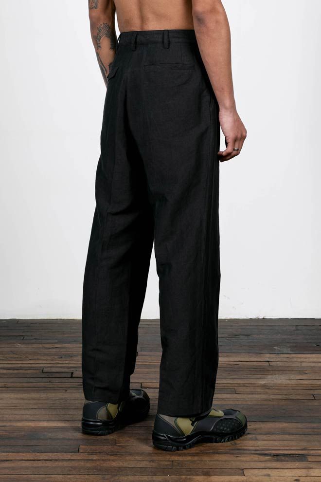 A pleated pant experiment in the radically open-yet-opaque Injected Linen fabric. Single pleats on each leg give them a crisp air and like all Injex wea…