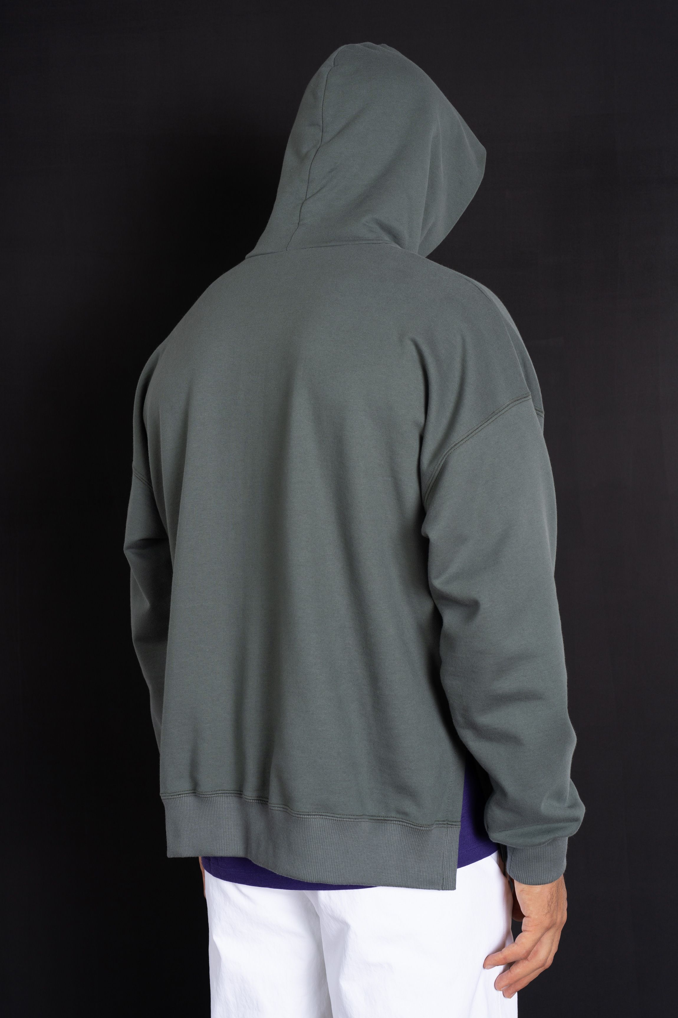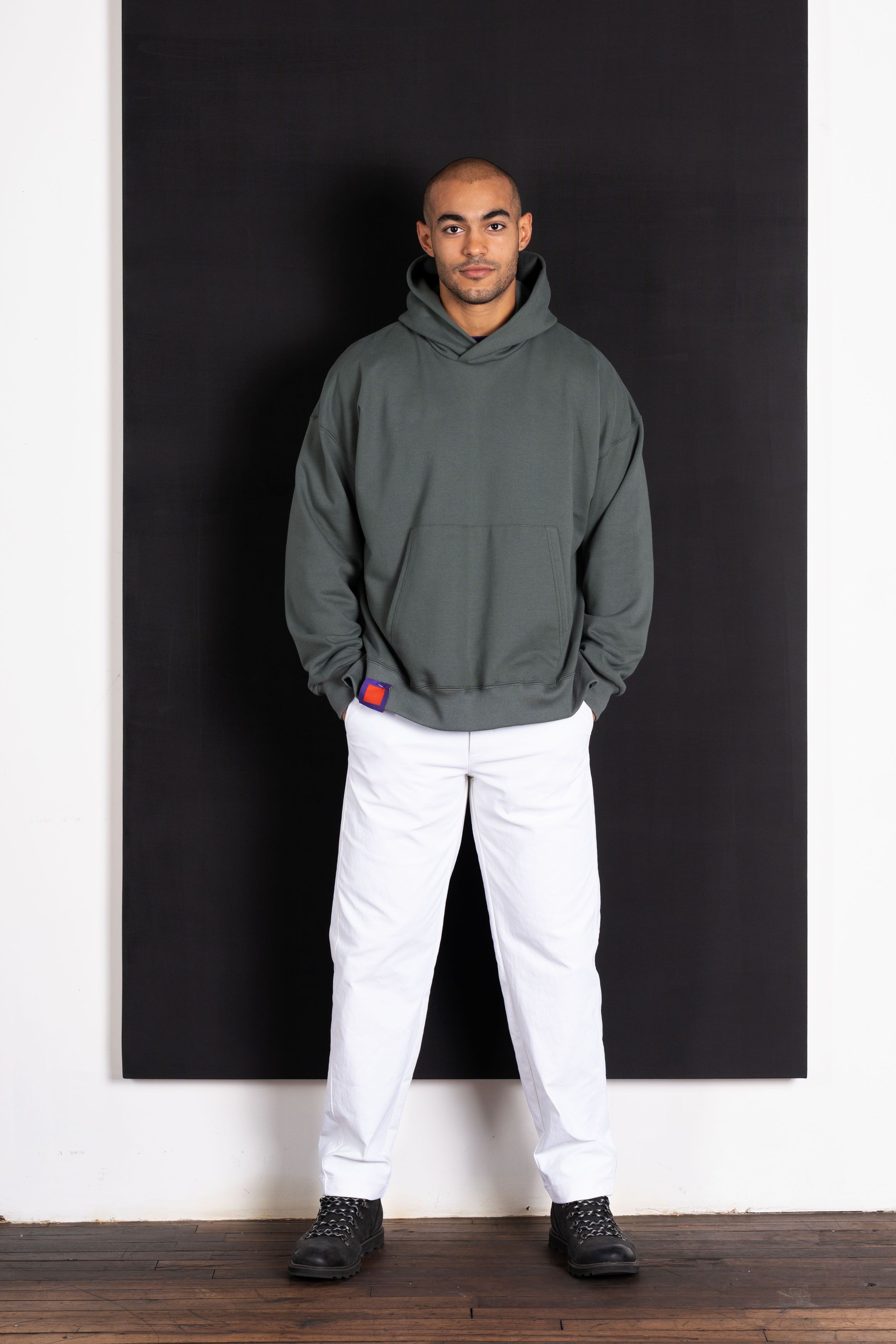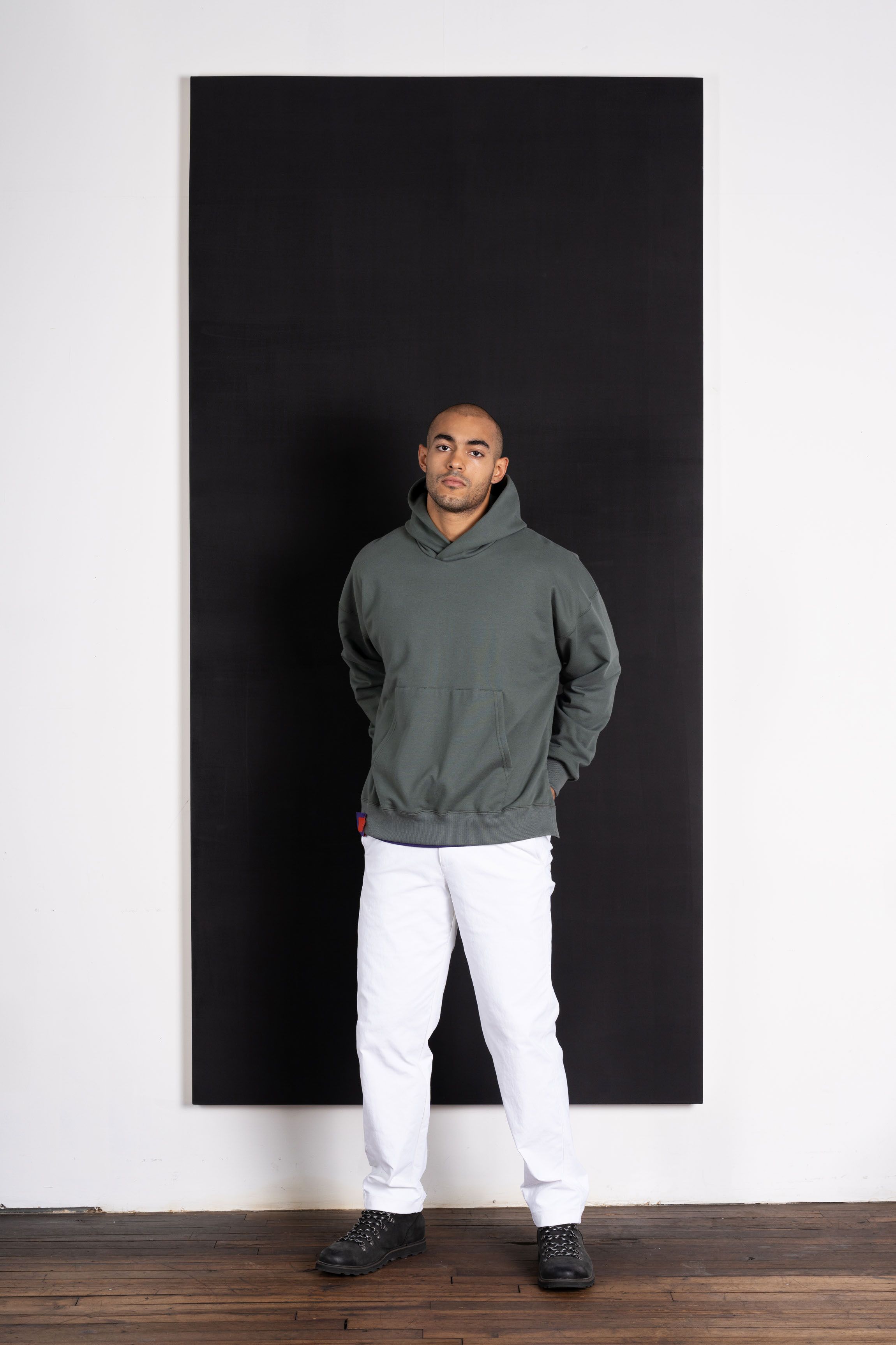 A Willie Norris hoodie experiment. Side slits, a big kangaroo pocket and a one-piece darted hood, in the emotional armor of Hard/co Merino. Dense cotton…