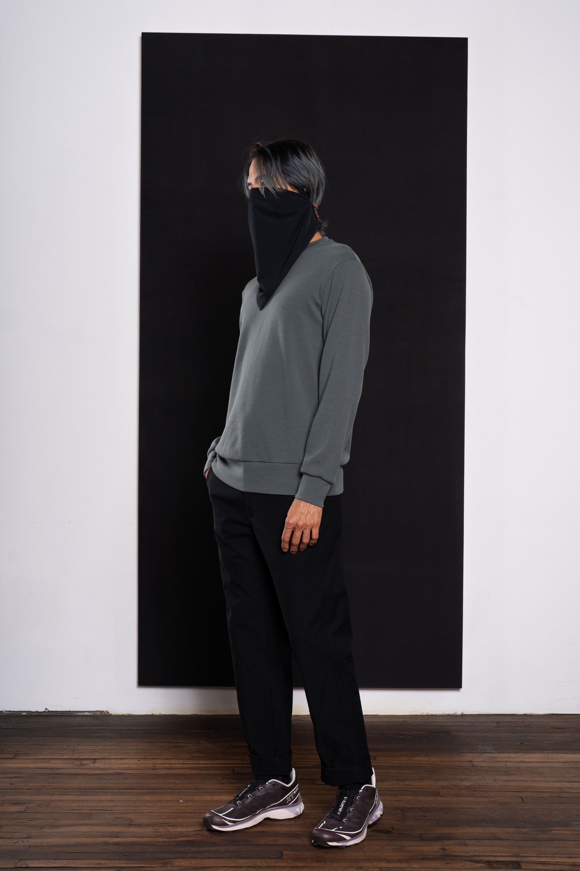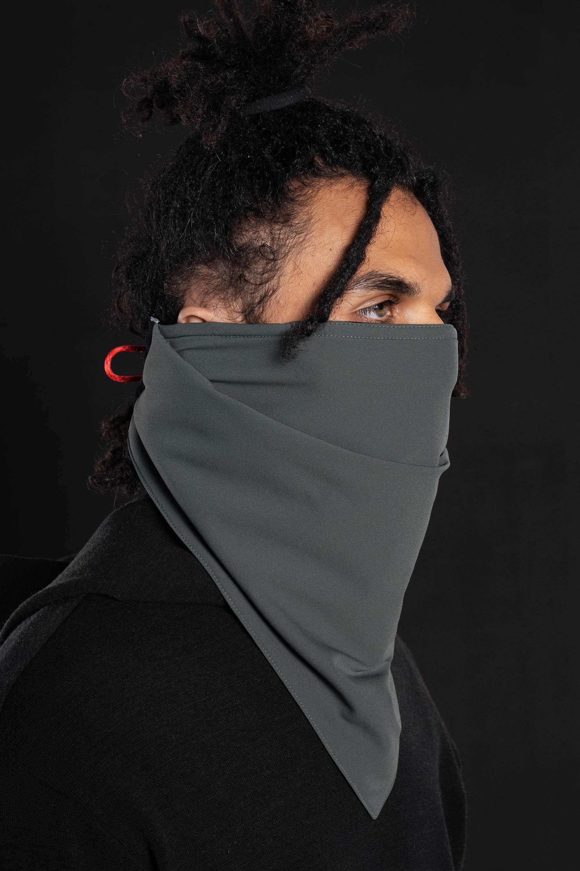 An experiment in-between mask and scarf. An adjustable mag/mech Fidlock closure holds it tight to the face, a removable metal nosebridge helps keep glas…