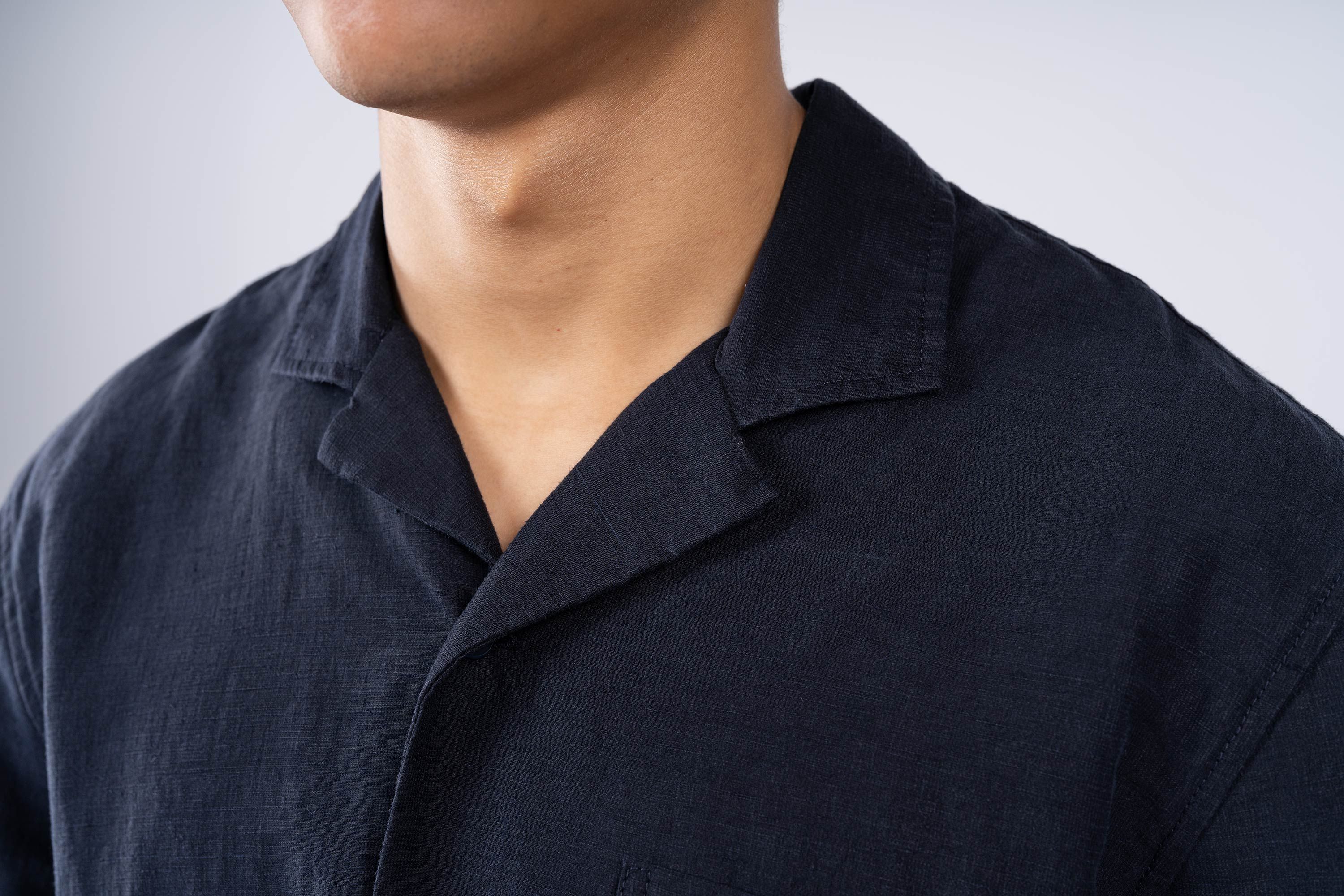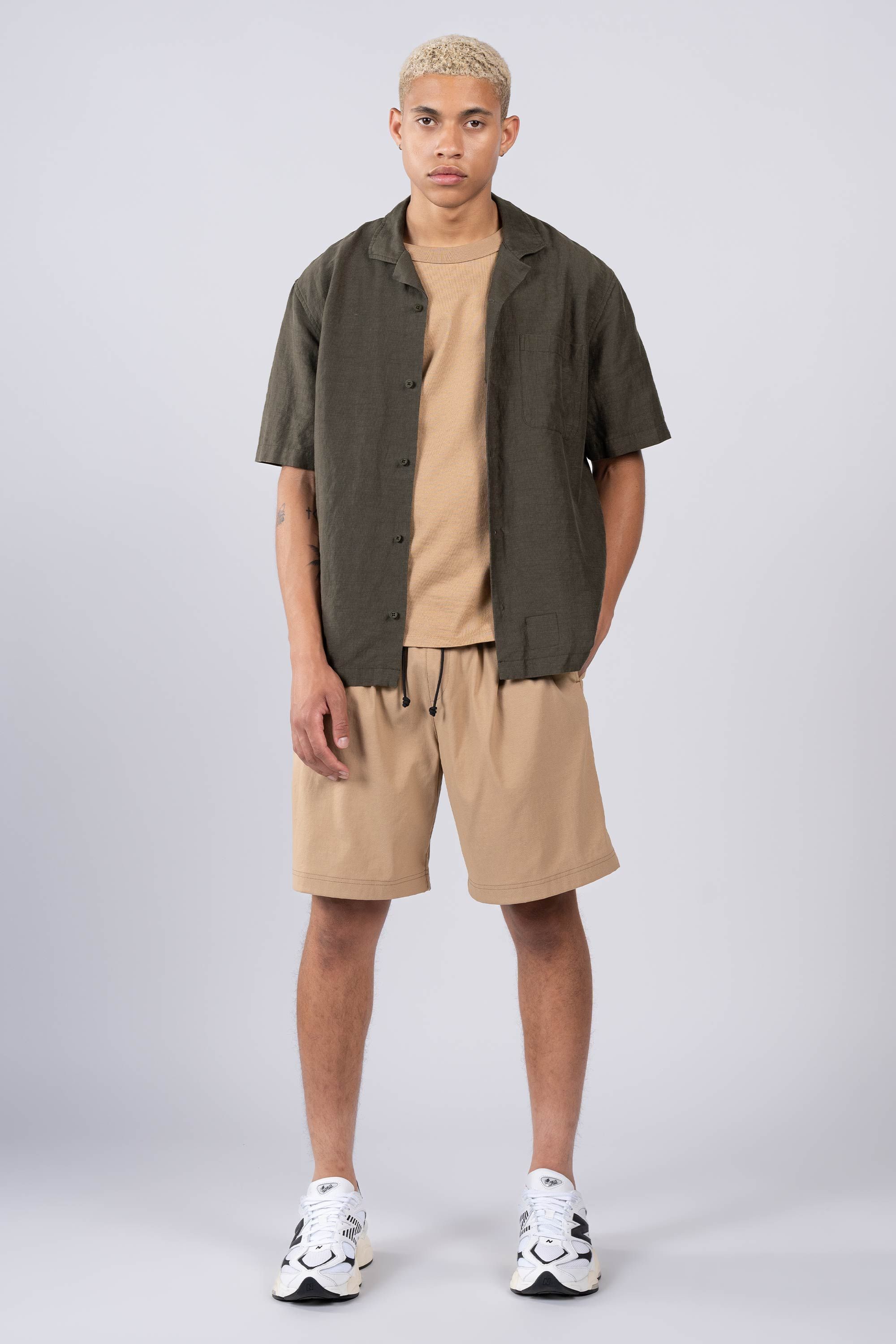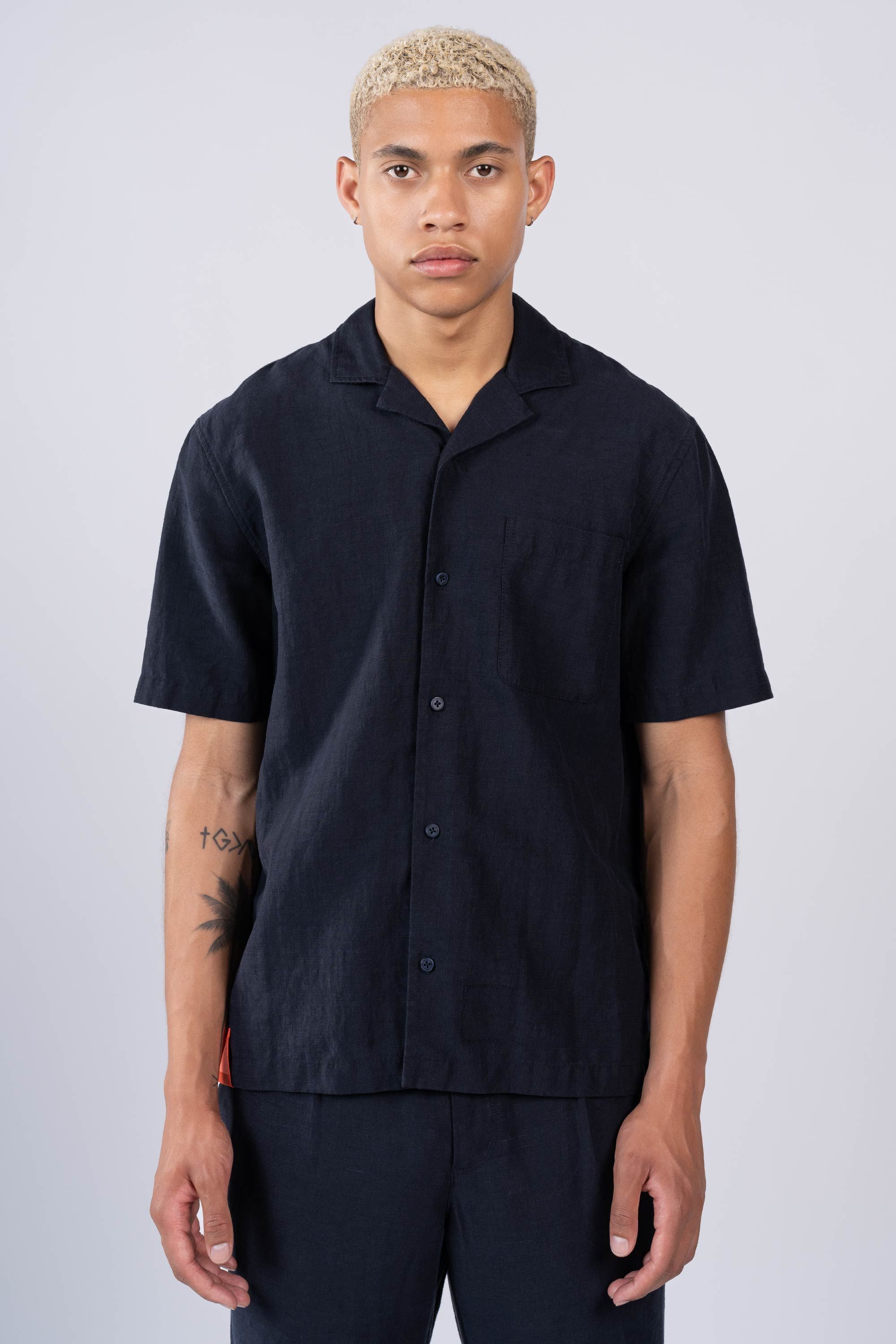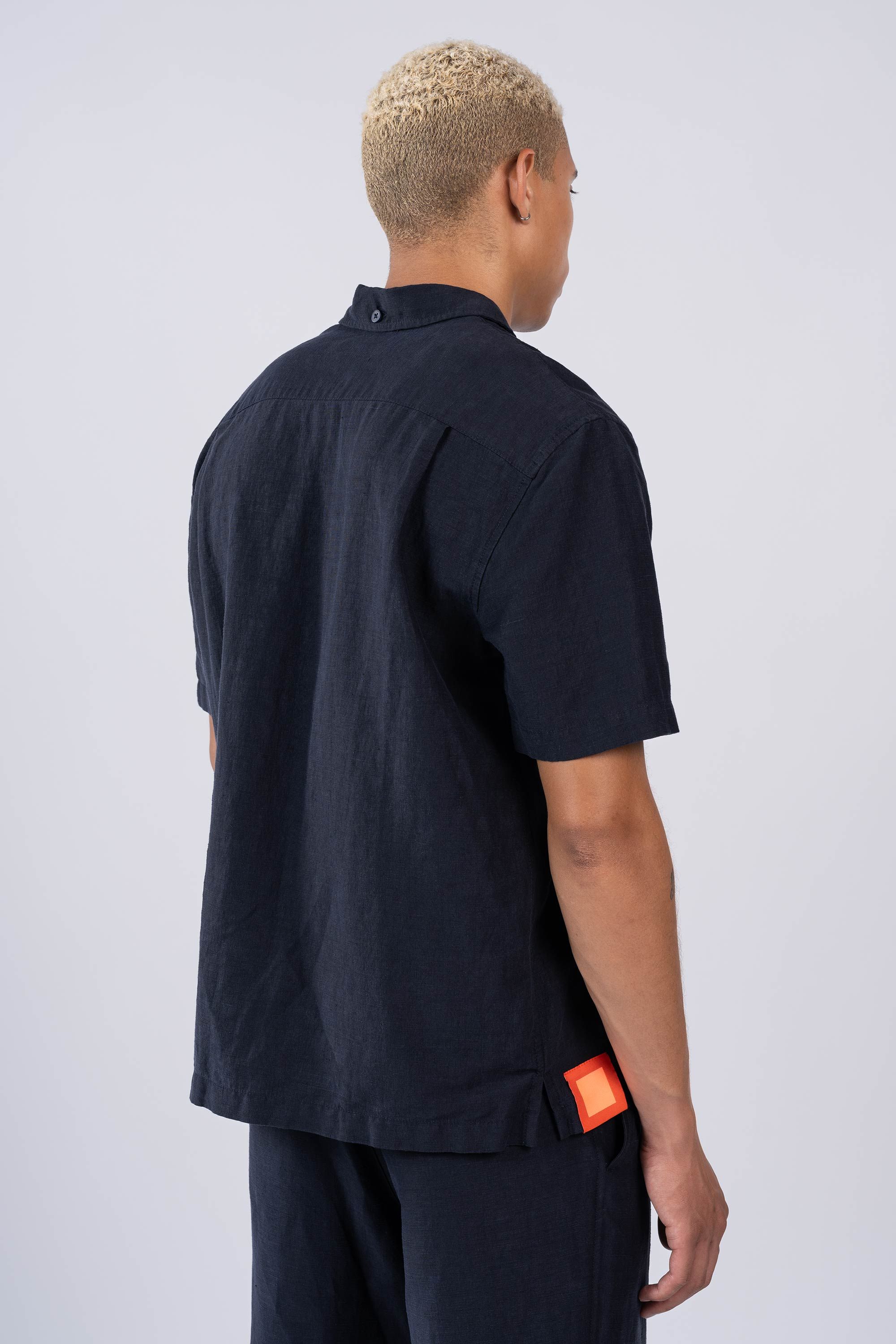 An Injected Linen camp collar shirt in an experimental new roll dyeing process. Warp-knit and weft-inserted in Japan and then dyed in Portugal, nothing …