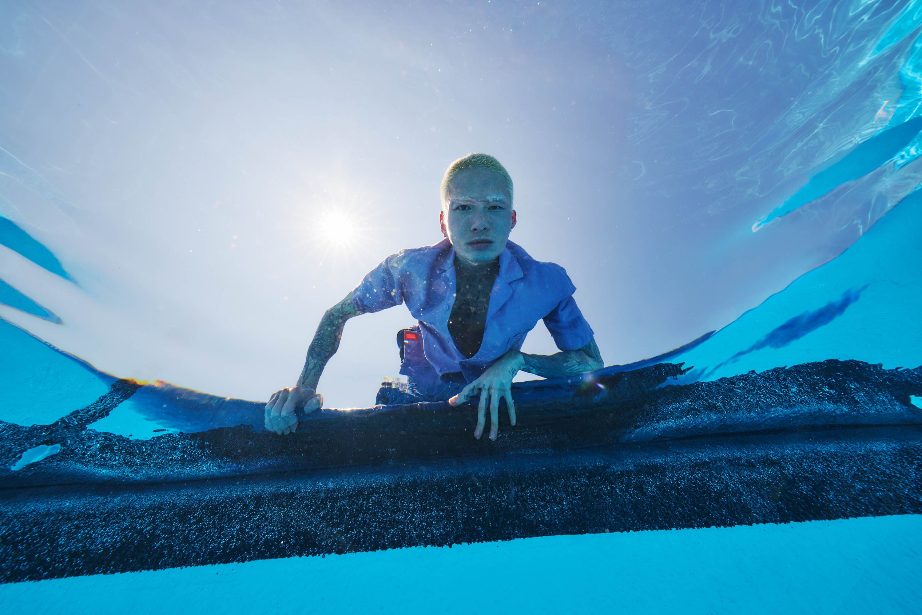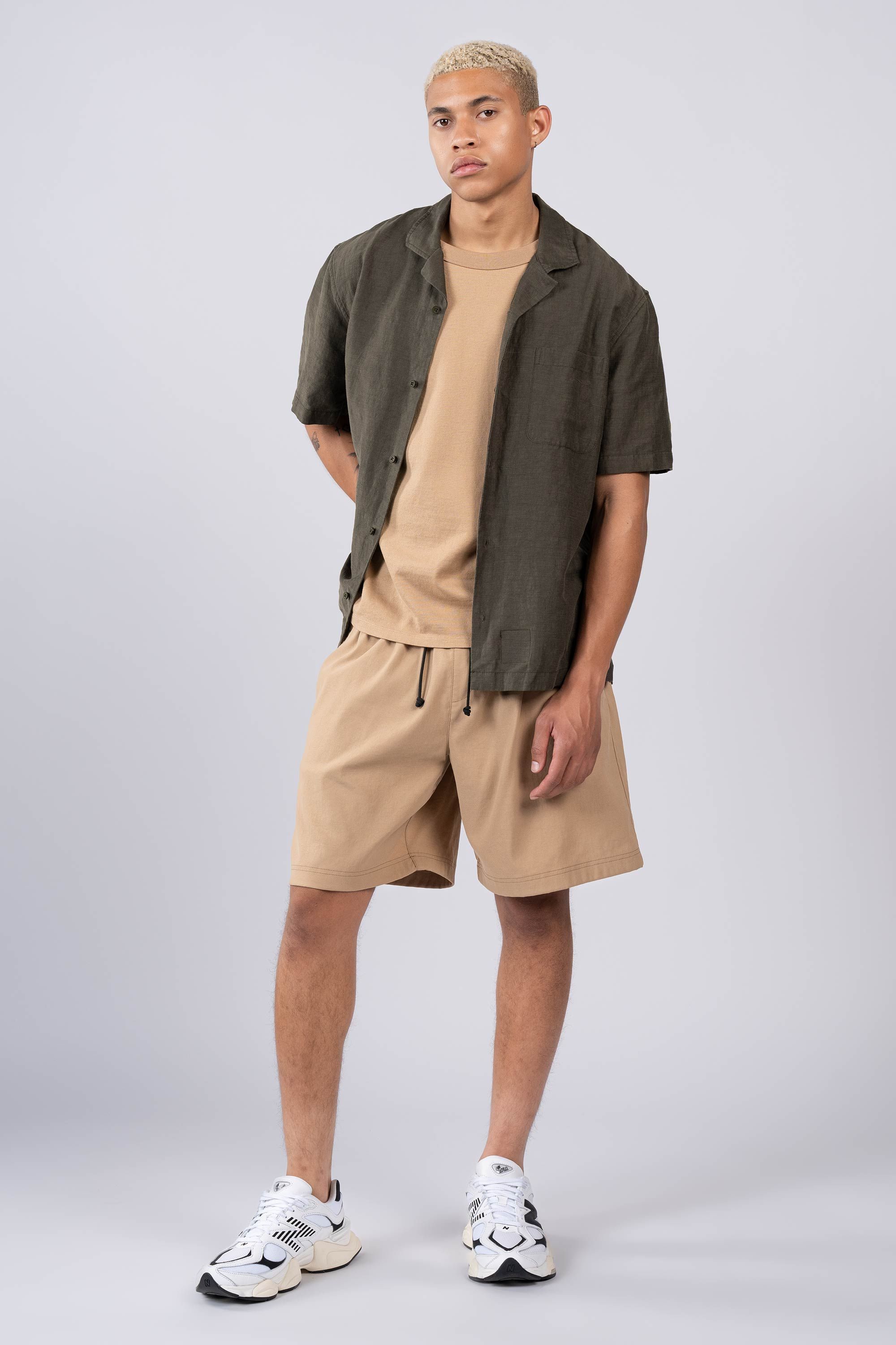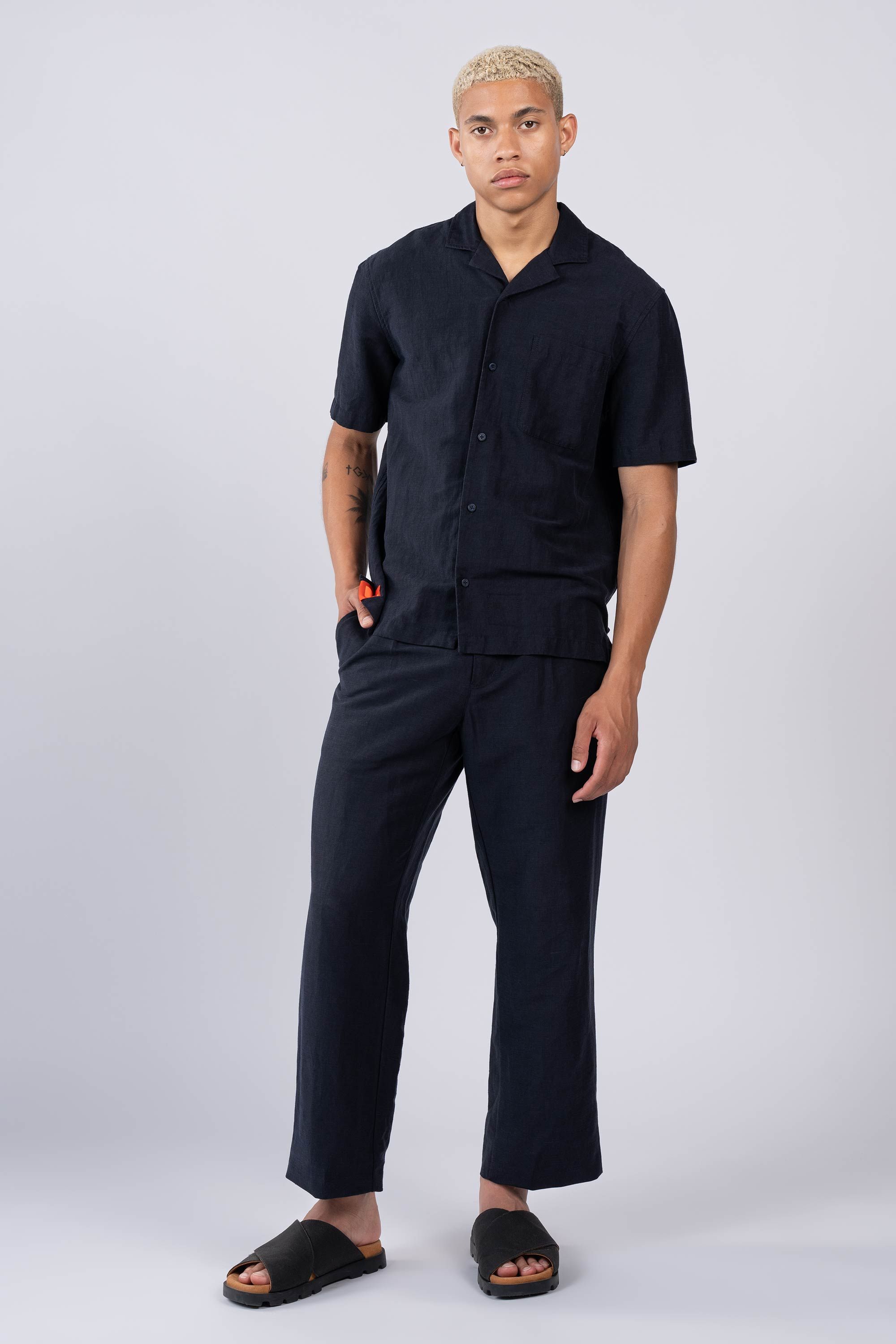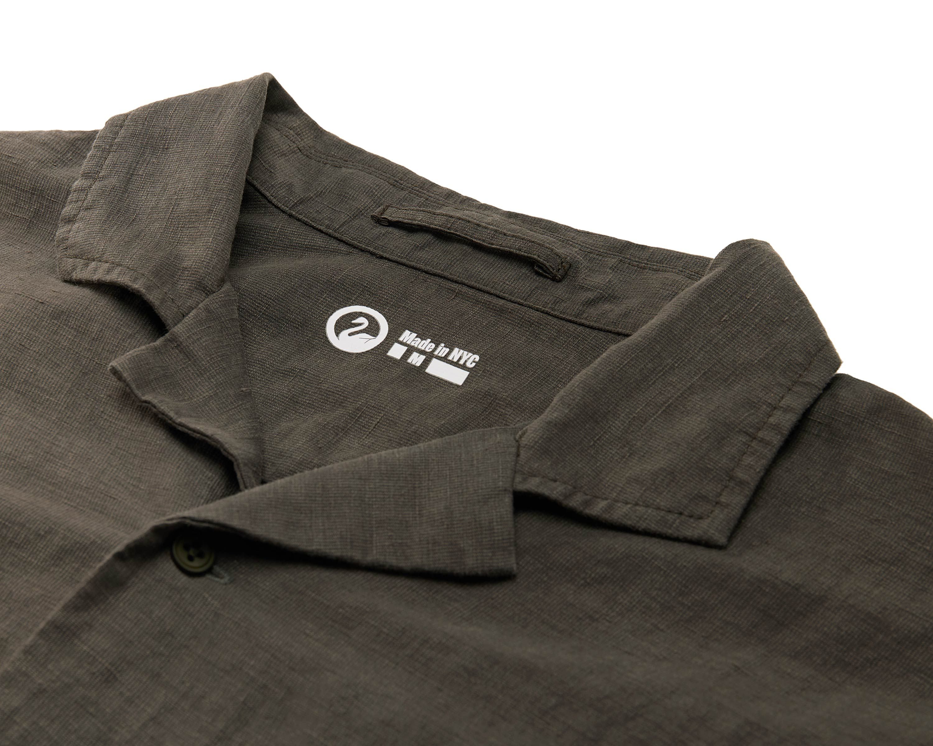 An Injected Linen camp collar shirt in an experimental new roll dyeing process. Warp-knit and weft-inserted in Japan and then dyed in Portugal, nothing …