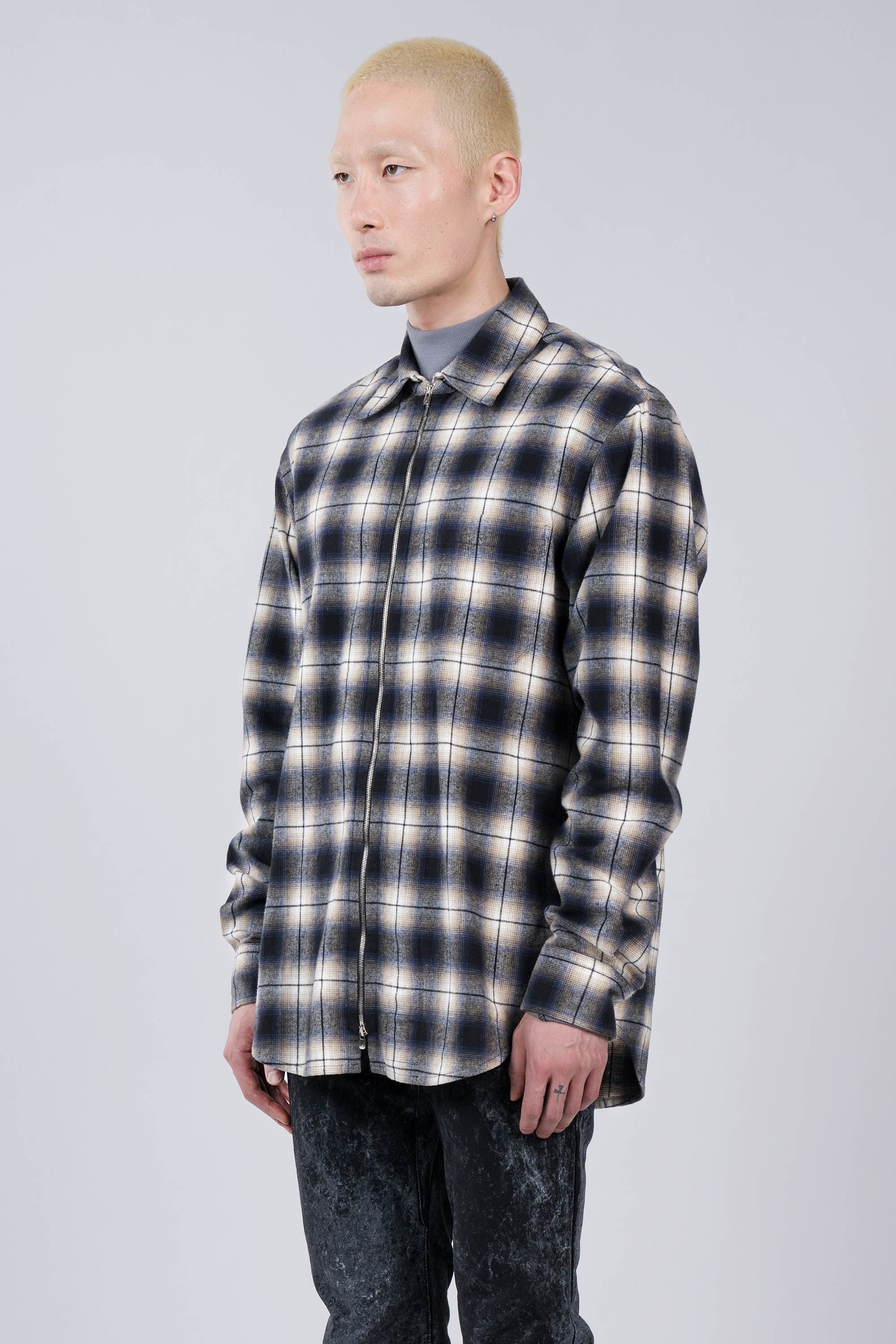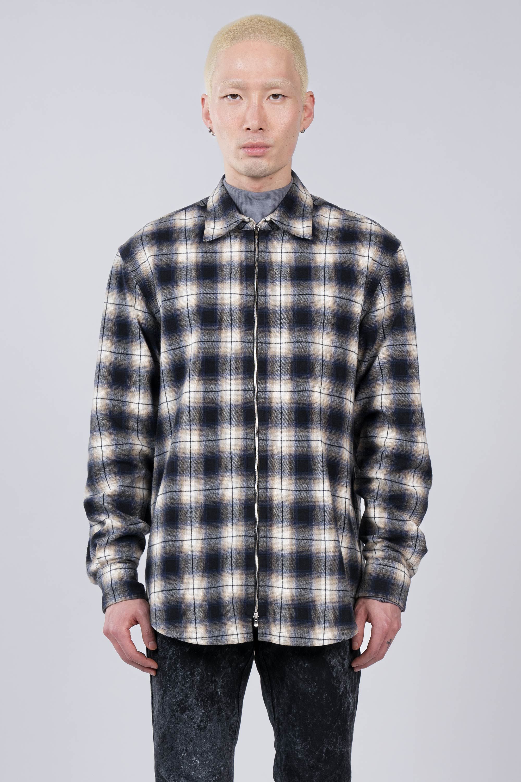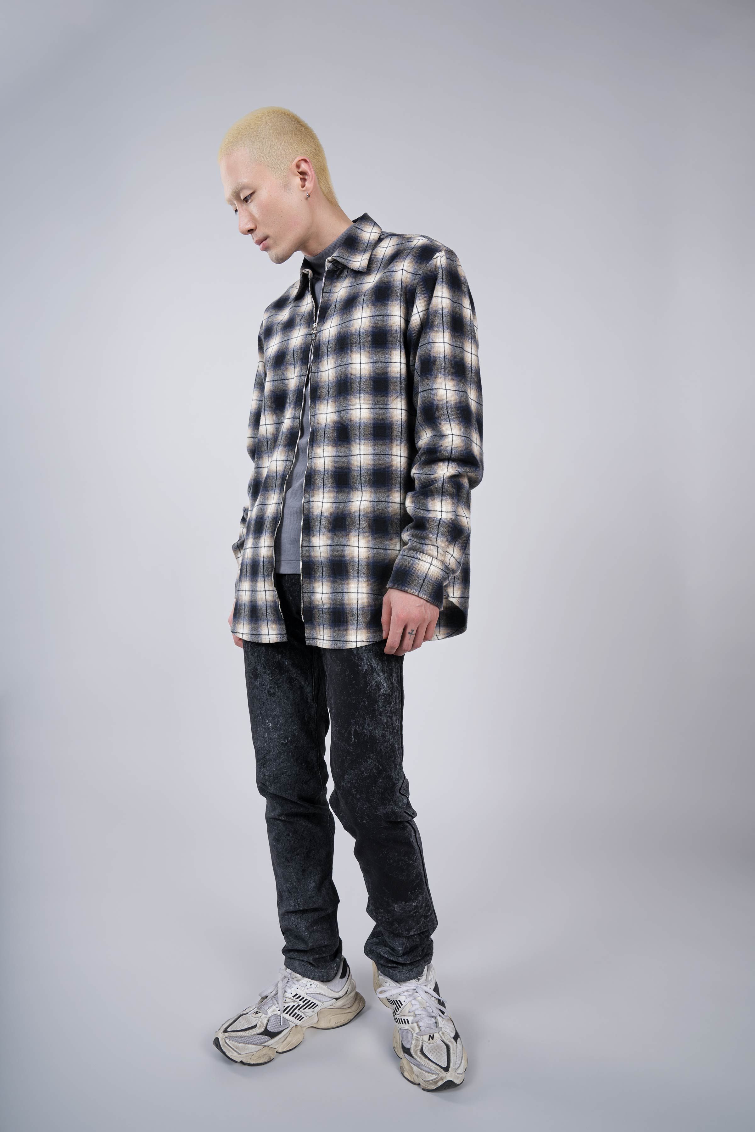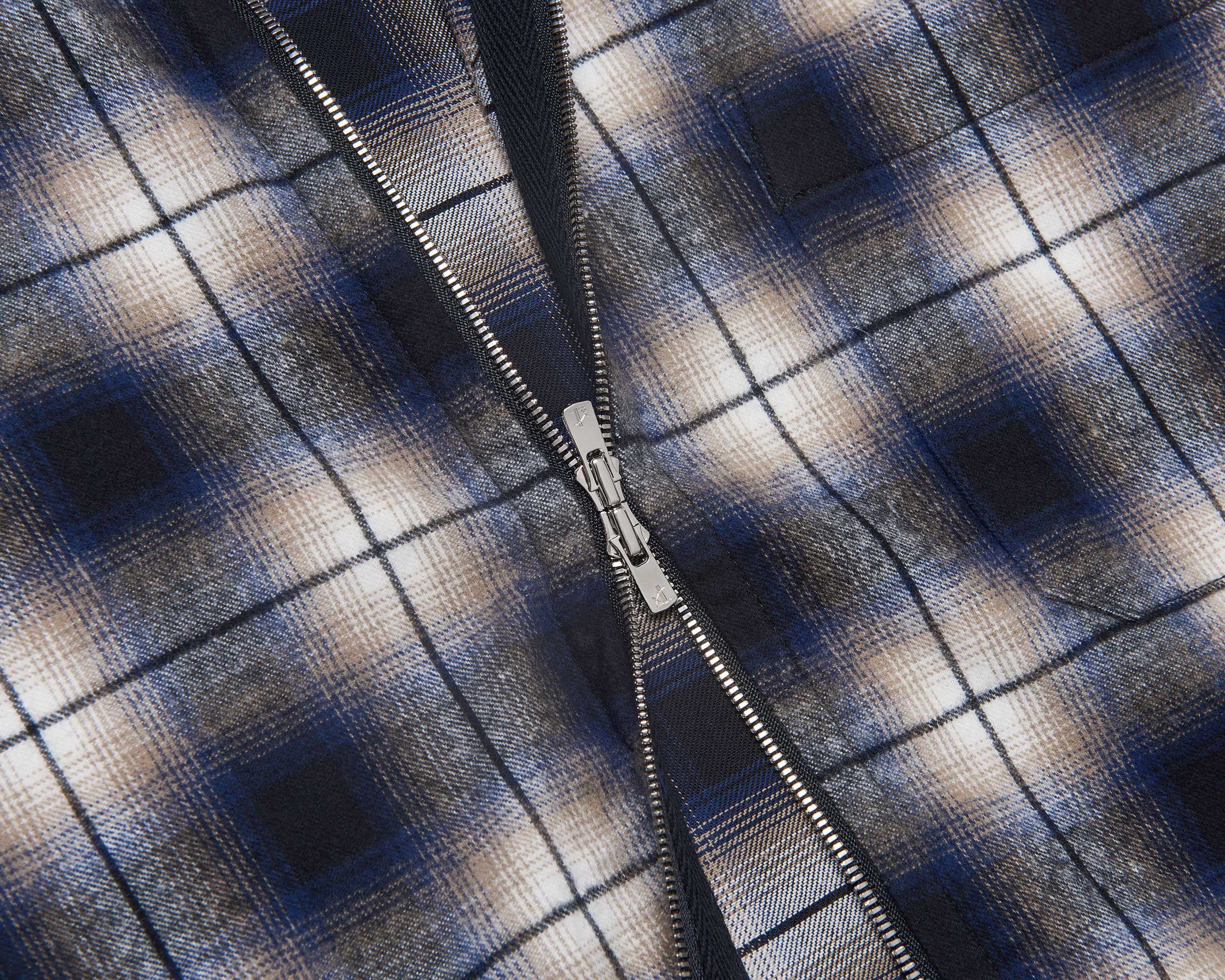A high definition plaid zip shirt experiment. A lightweight (for a flannel) fabric spun and woven to exacting standards by Albini in Northern Italy. Fea…