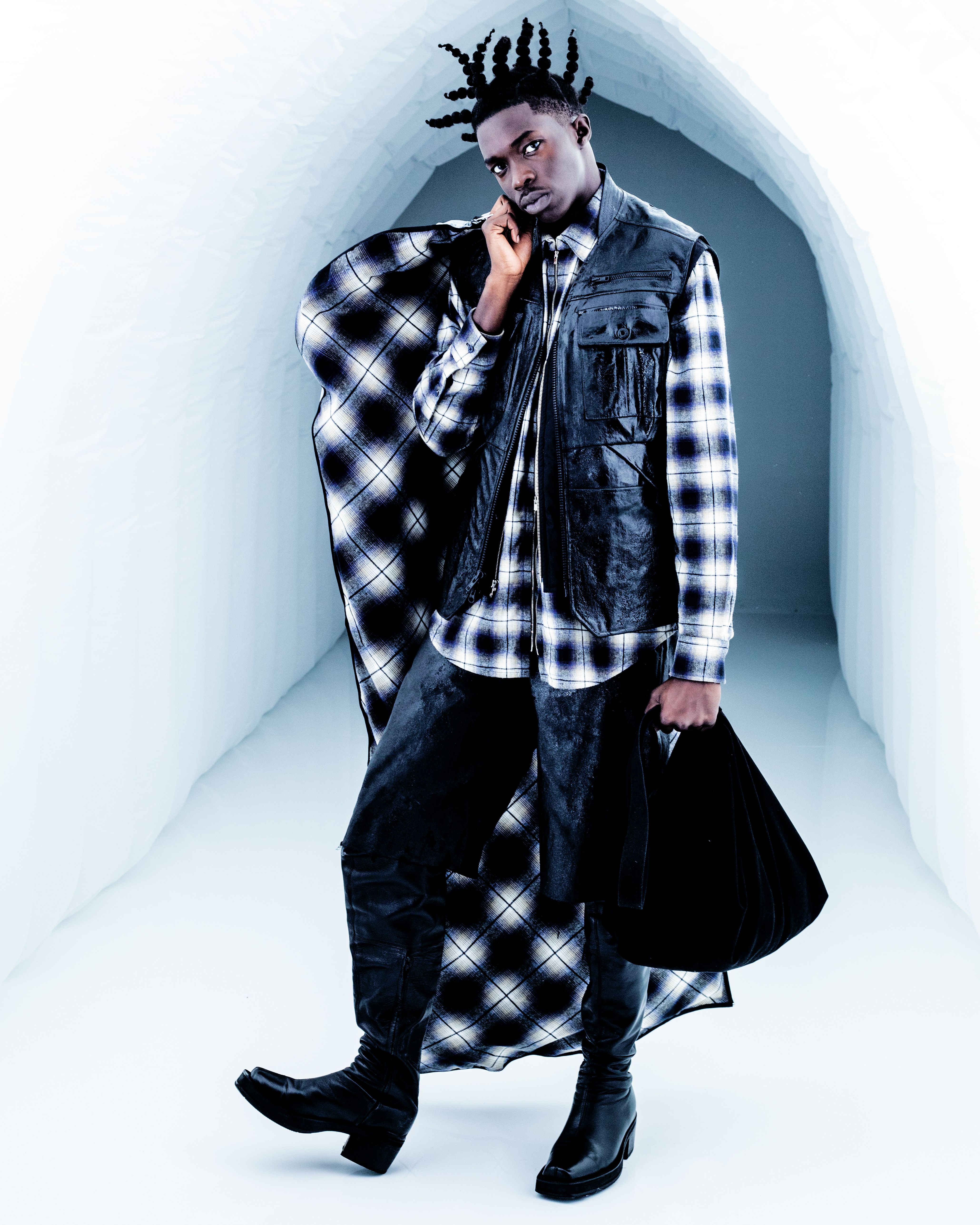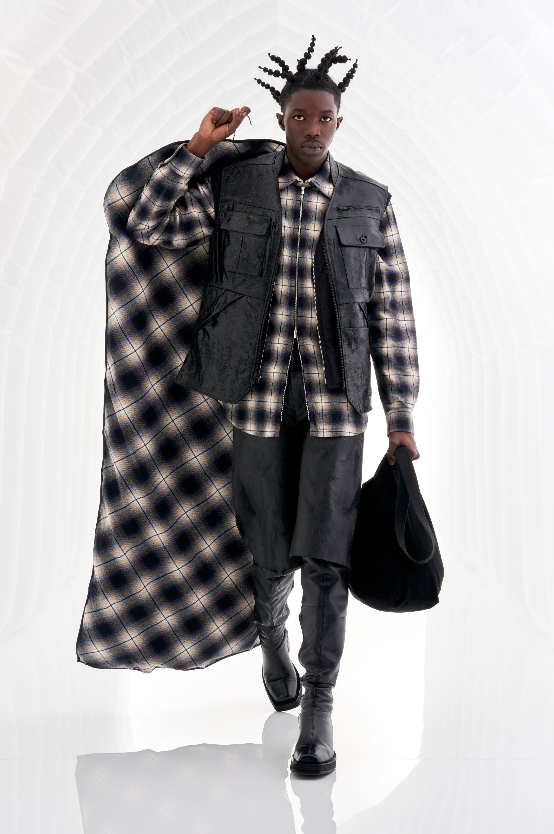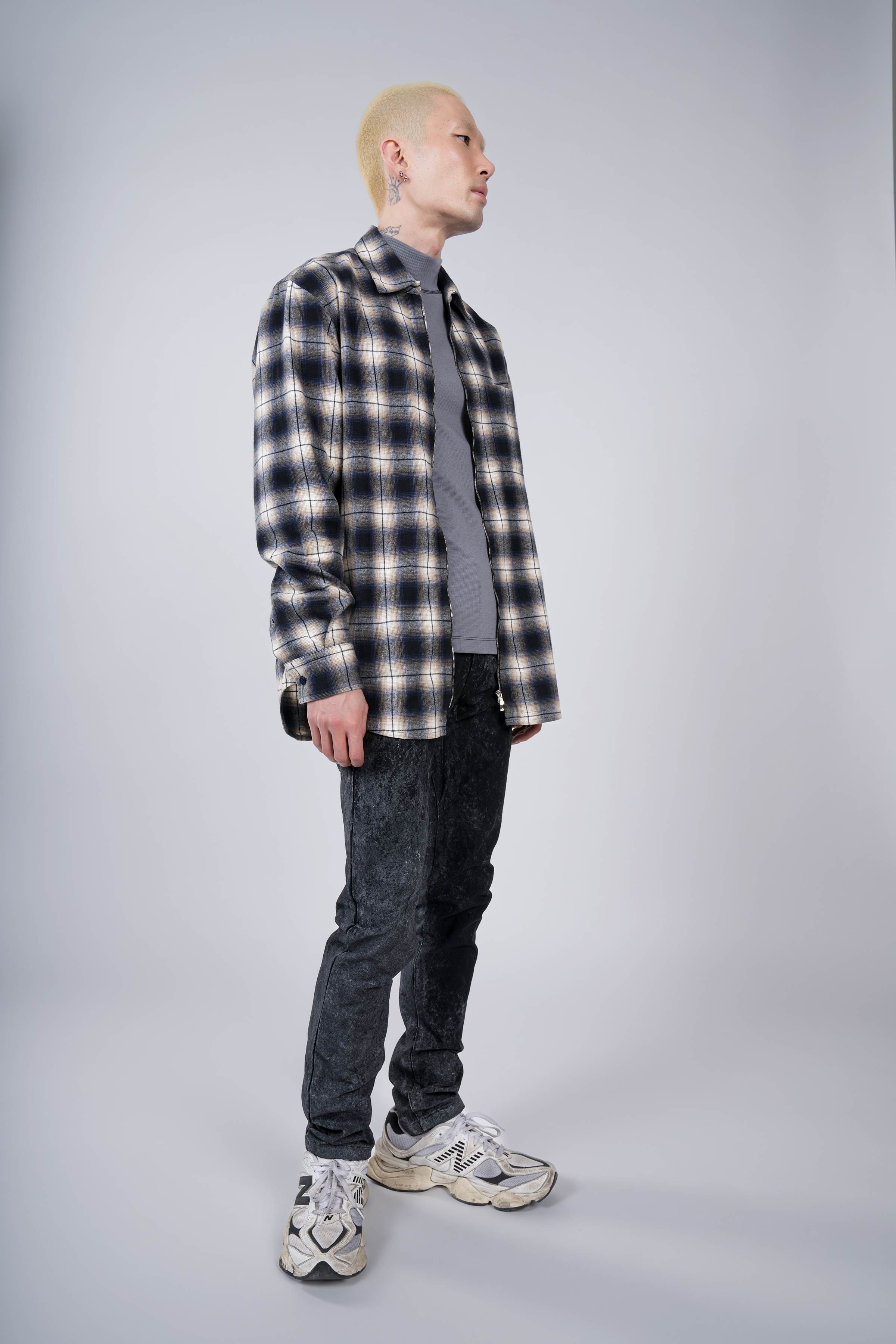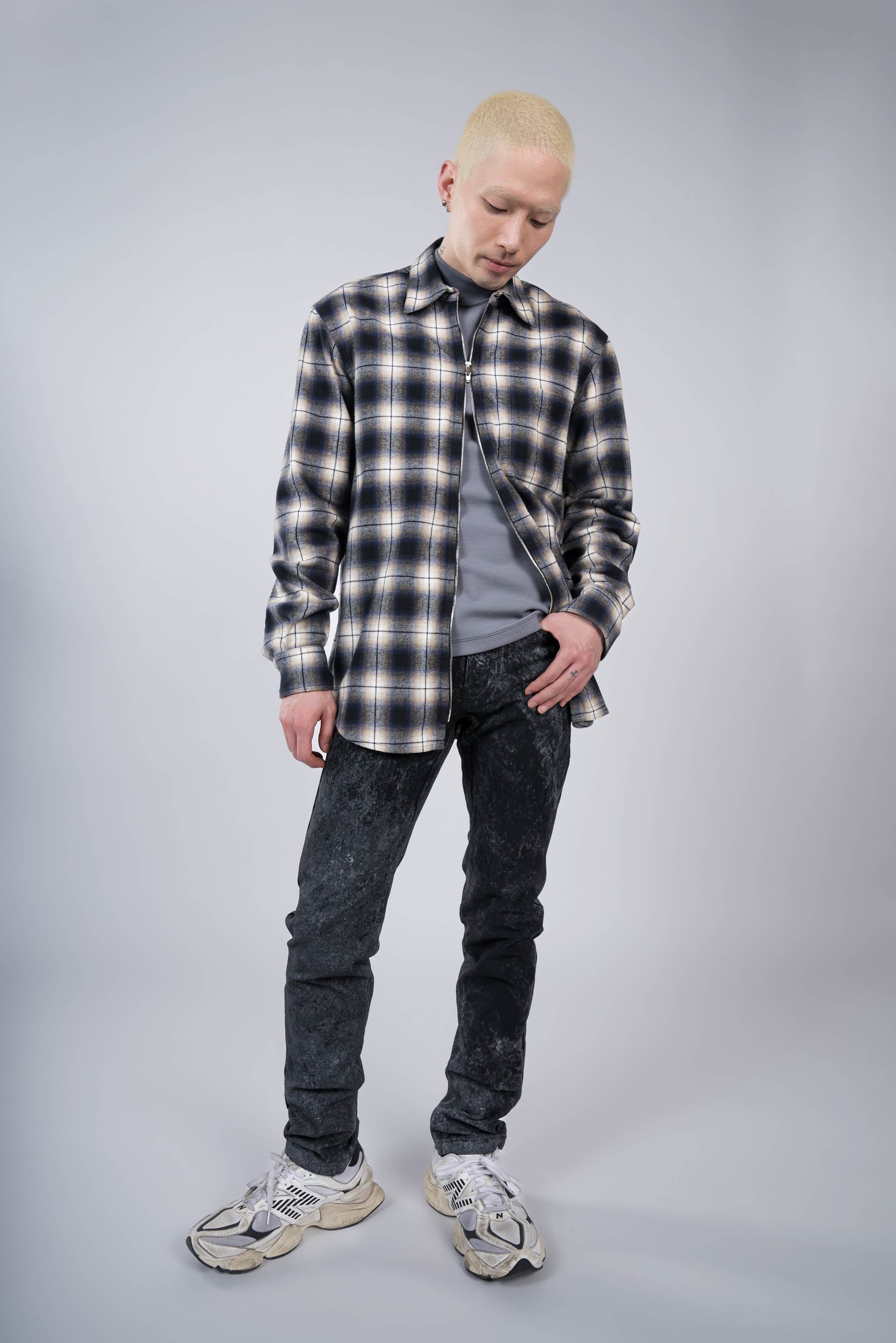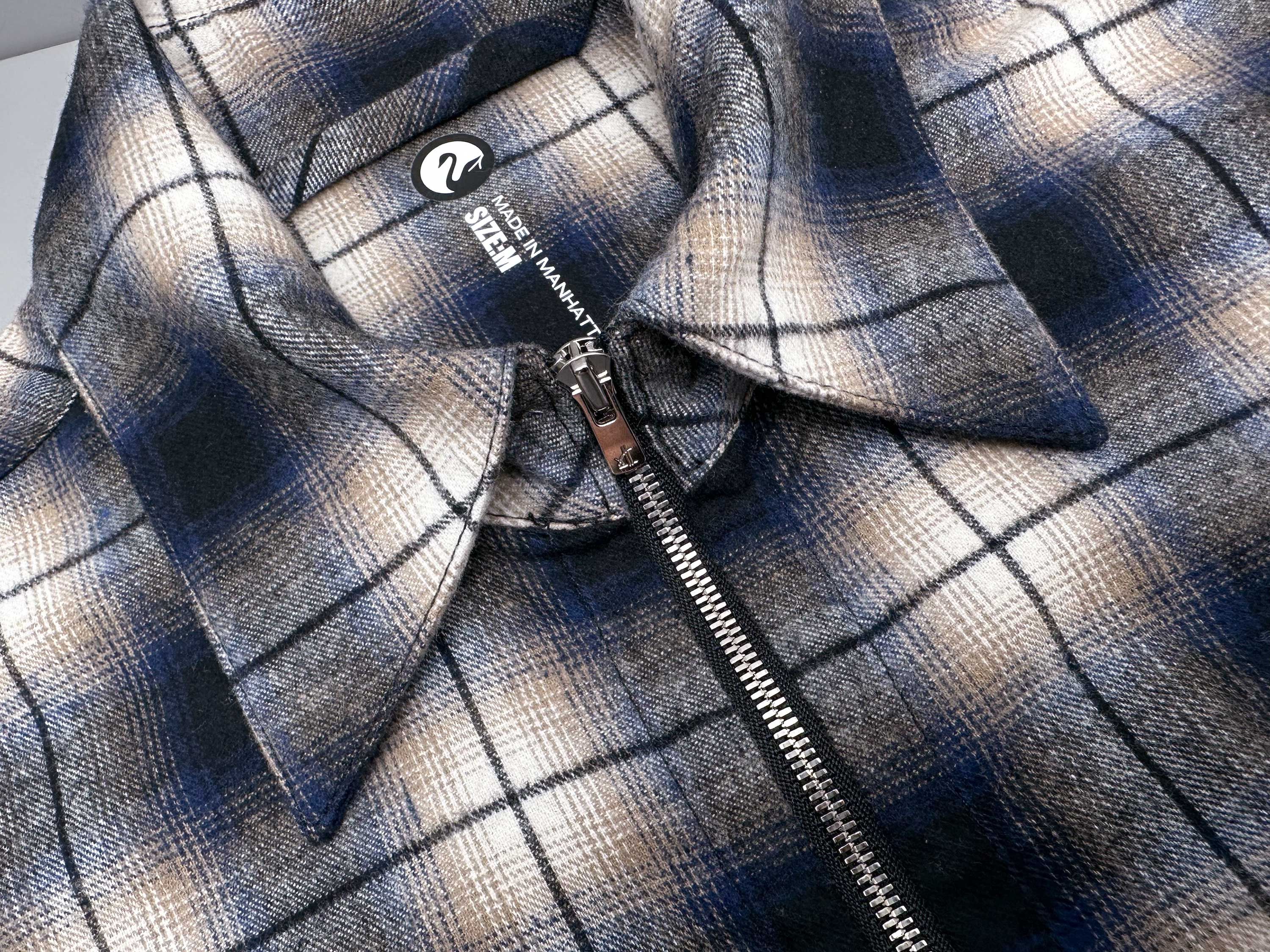A high definition plaid zip shirt experiment. A lightweight (for a flannel) fabric spun and woven to exacting standards by Albini in Northern Italy. Fea…
