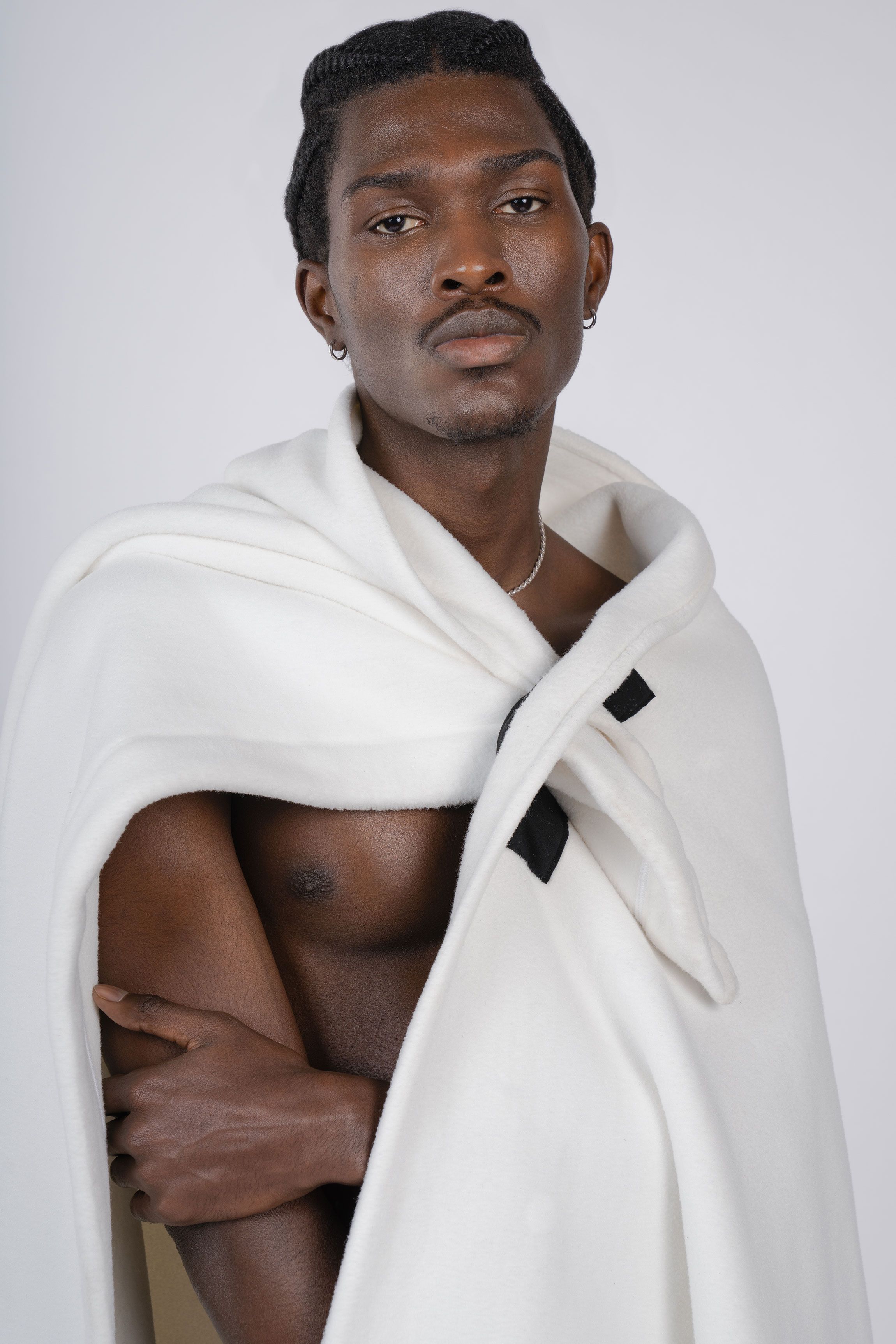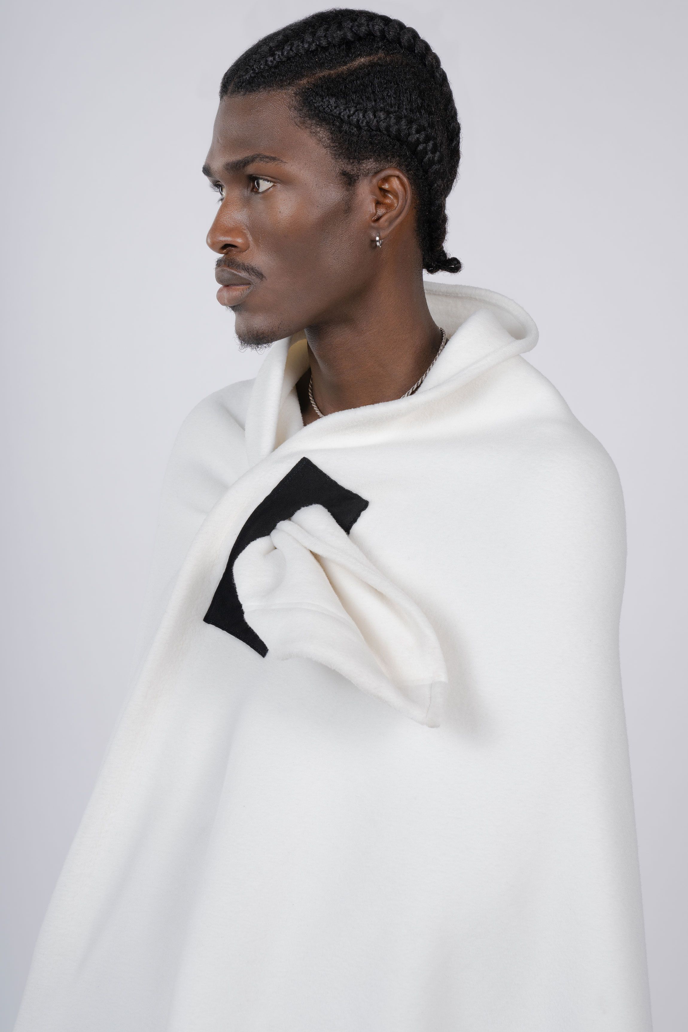 An actual blanket-you-can-wear experiment [#417]. An oversized throw made in the thick, plush and stretchy Extrafleece; a single Ultrasuede tension hole…