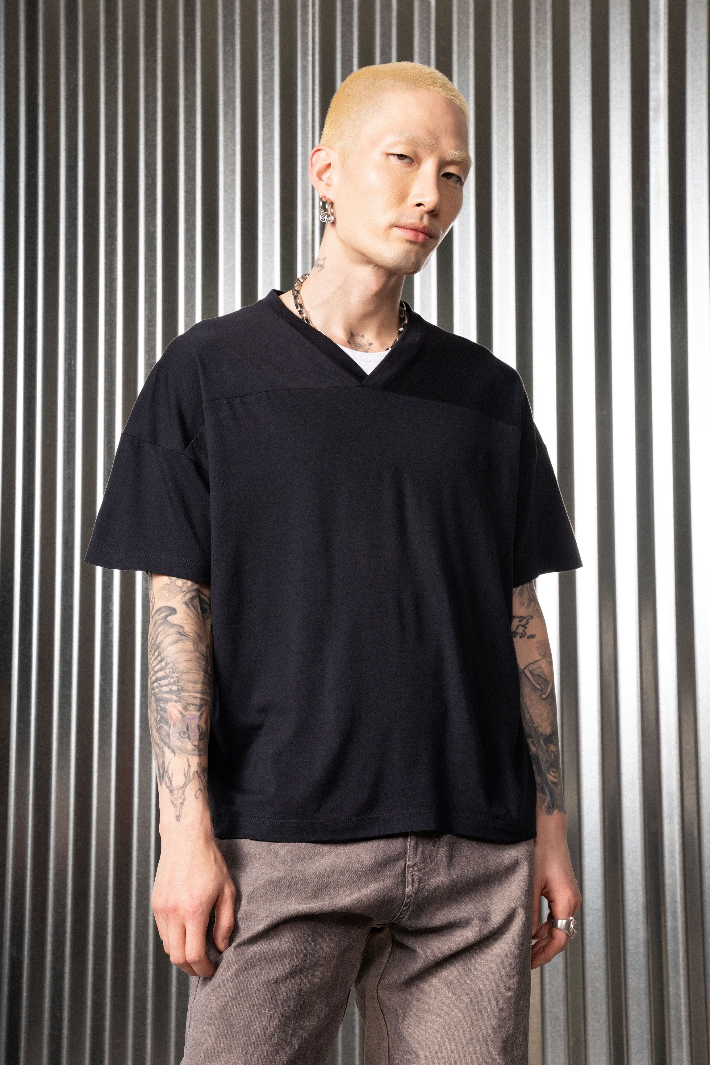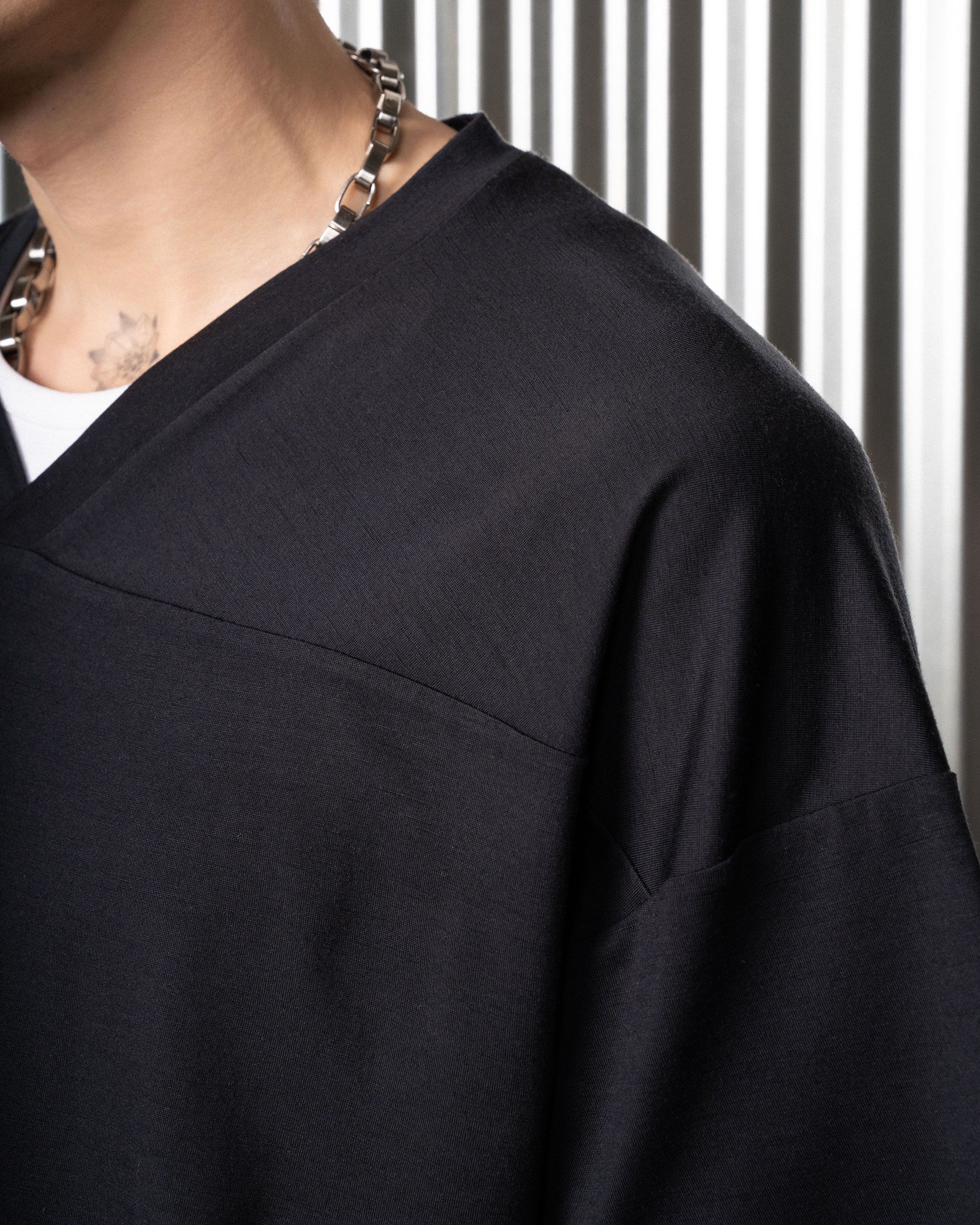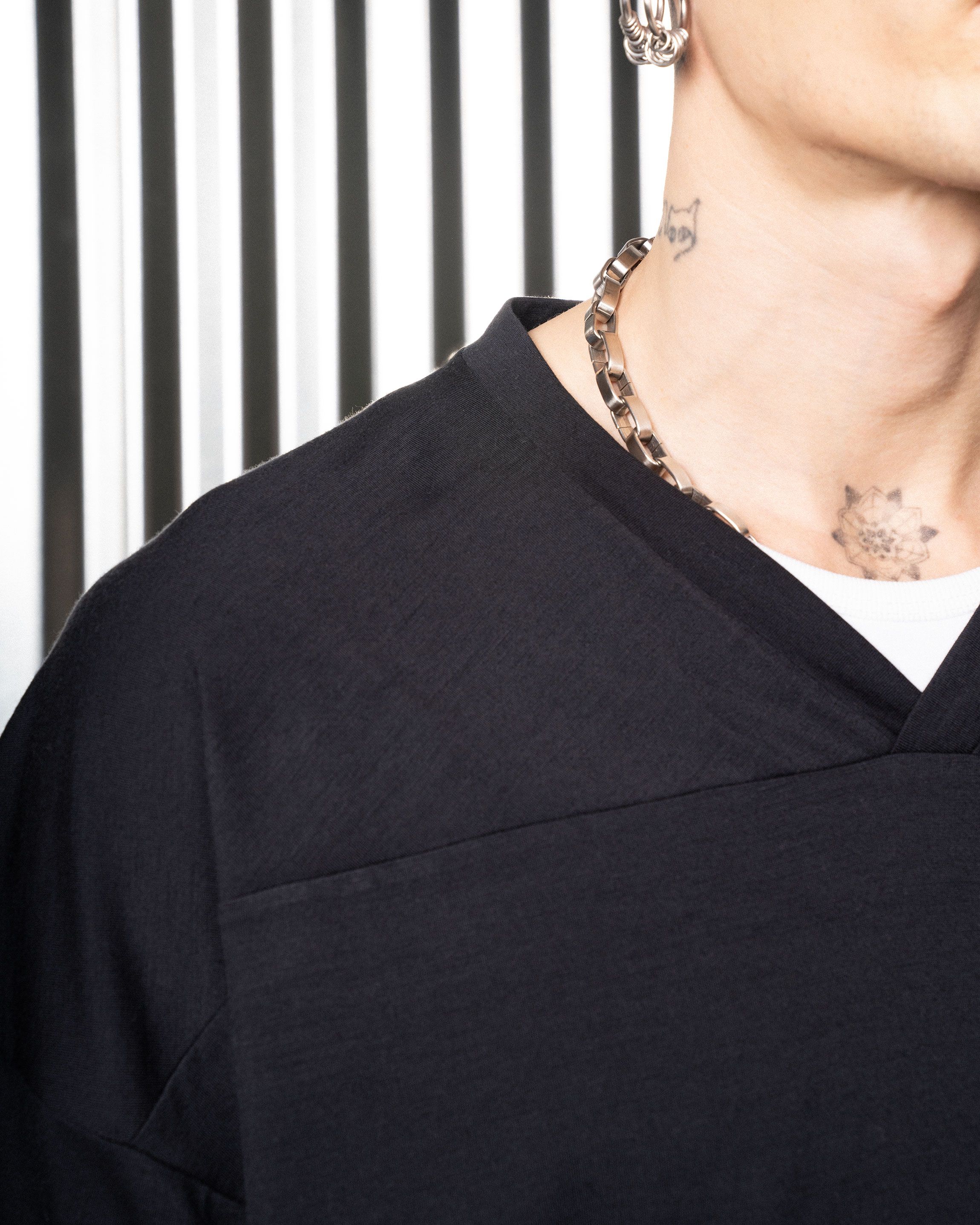 An American football meets Australian merino t-shirt experiment [#492]. Broad shoulder and cropped cut with a crossover v-neck. The Futurelining fabric …