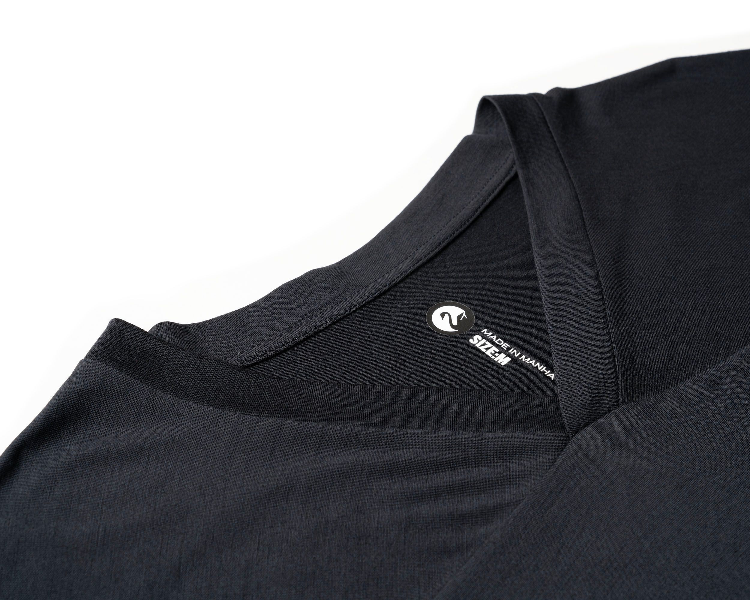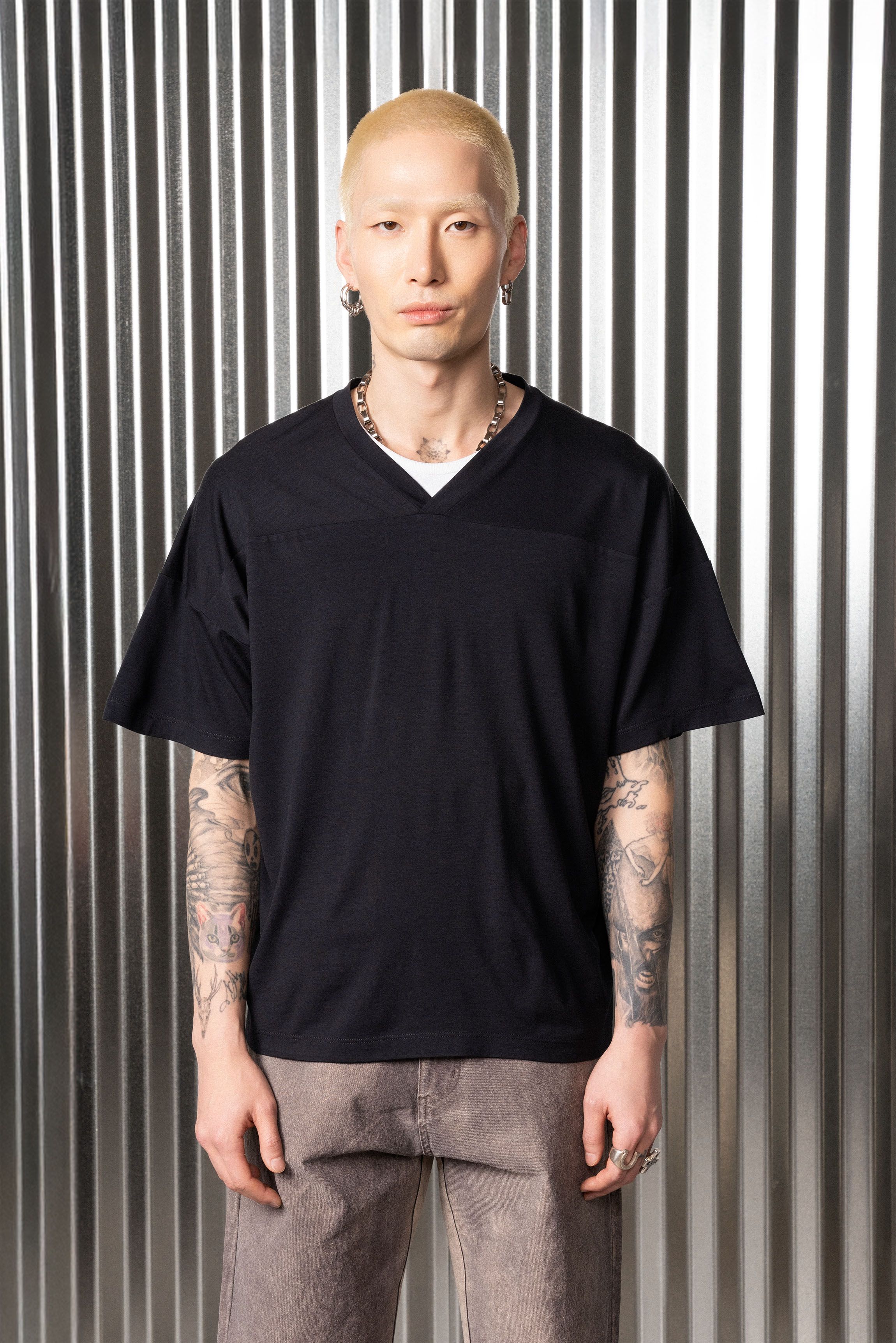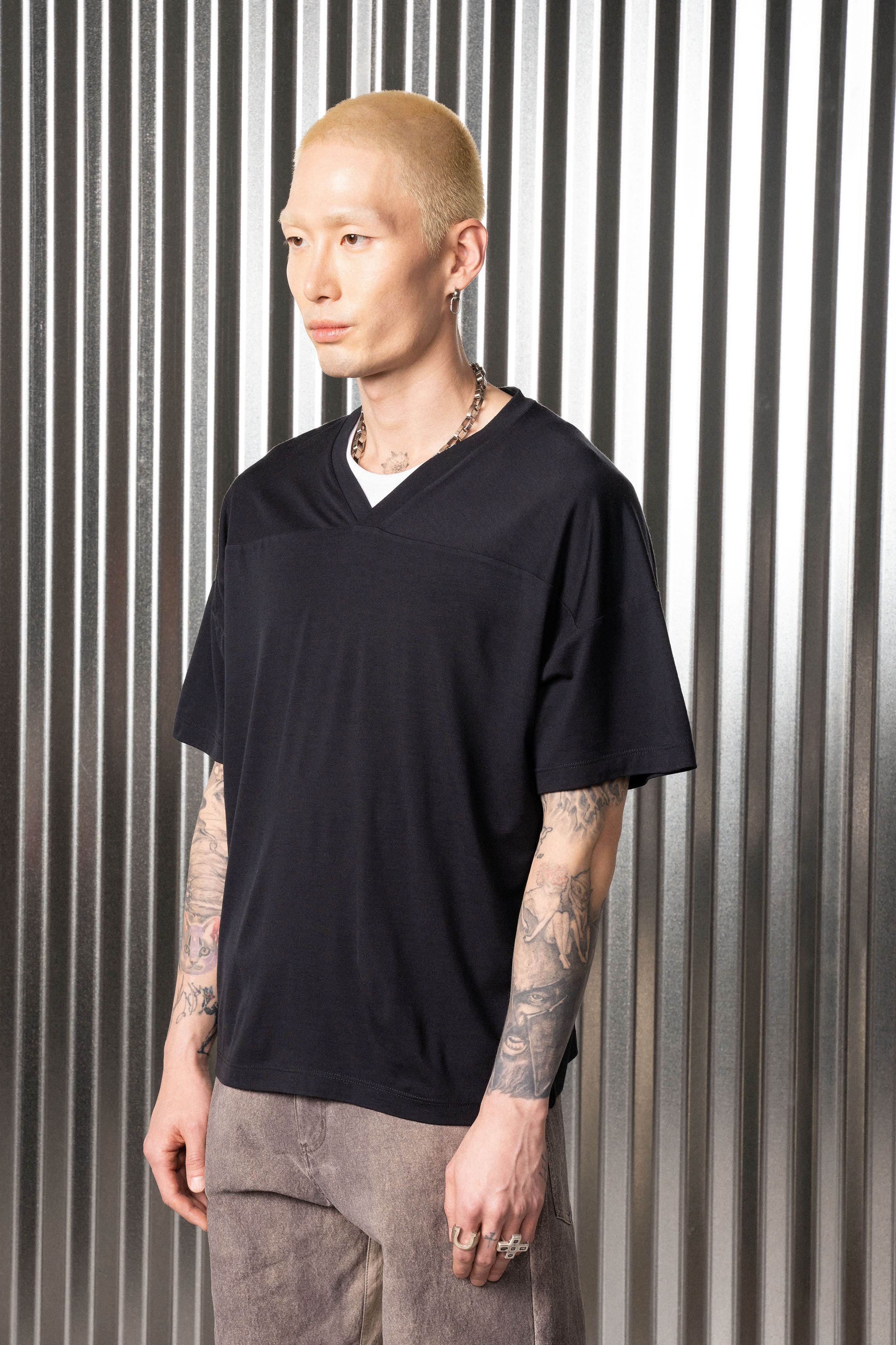 An American football meets Australian merino t-shirt experiment [#492]. Broad shoulder and cropped cut with a crossover v-neck. The Futurelining fabric …