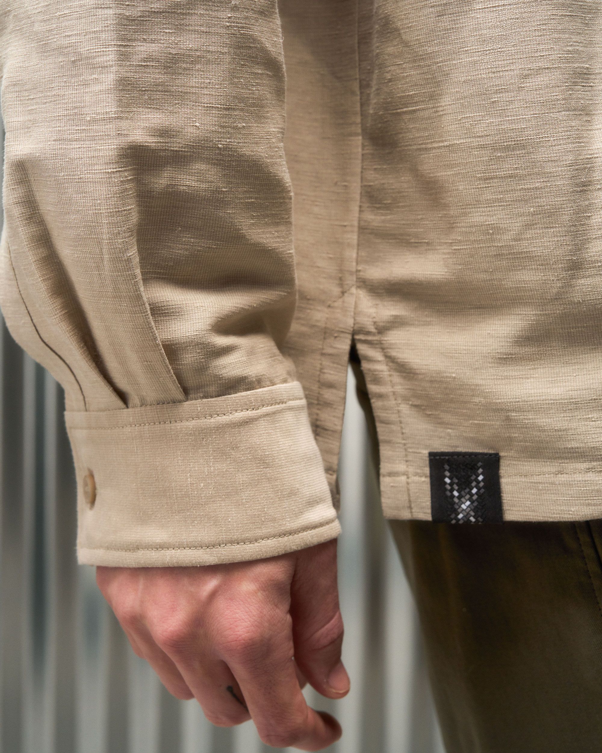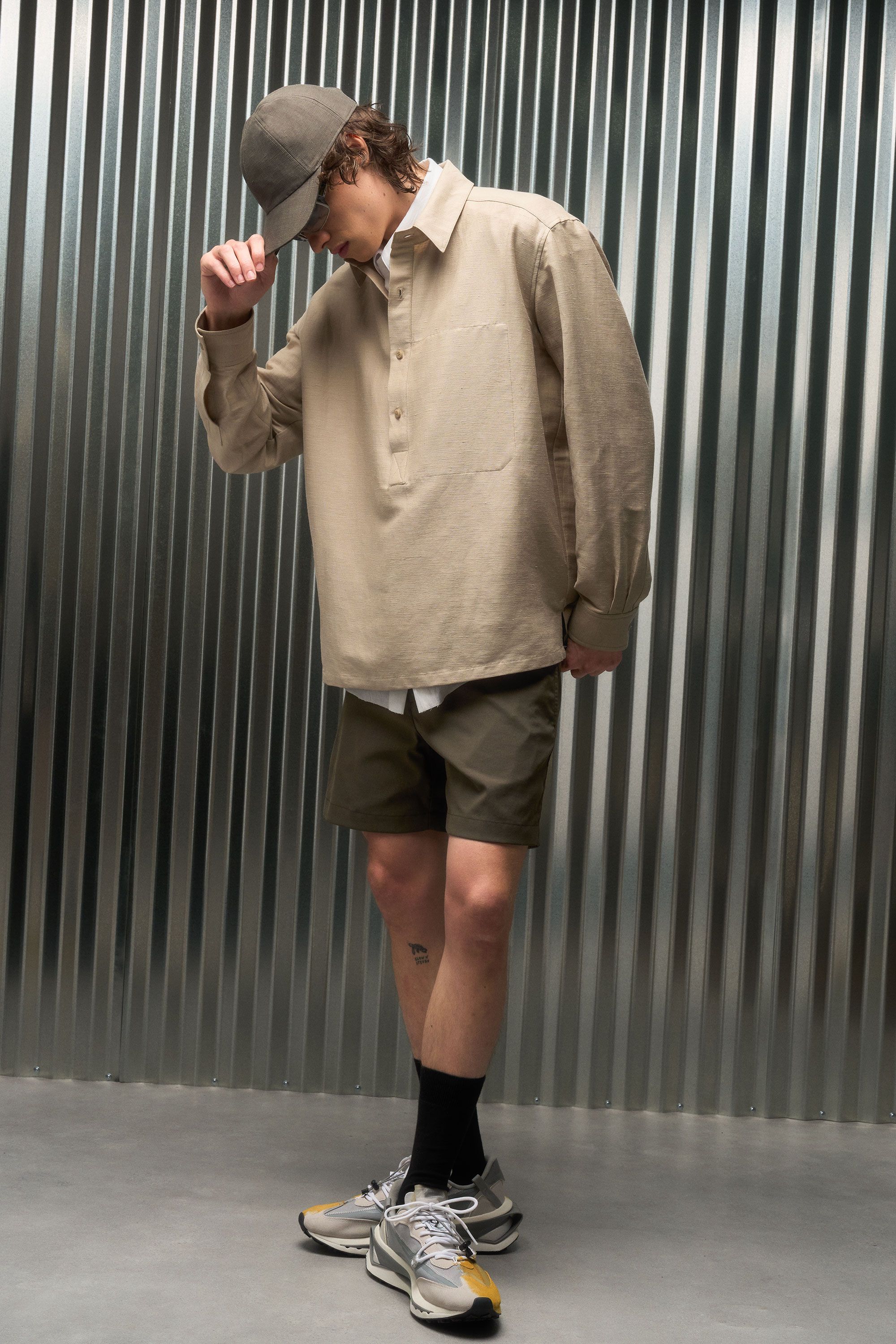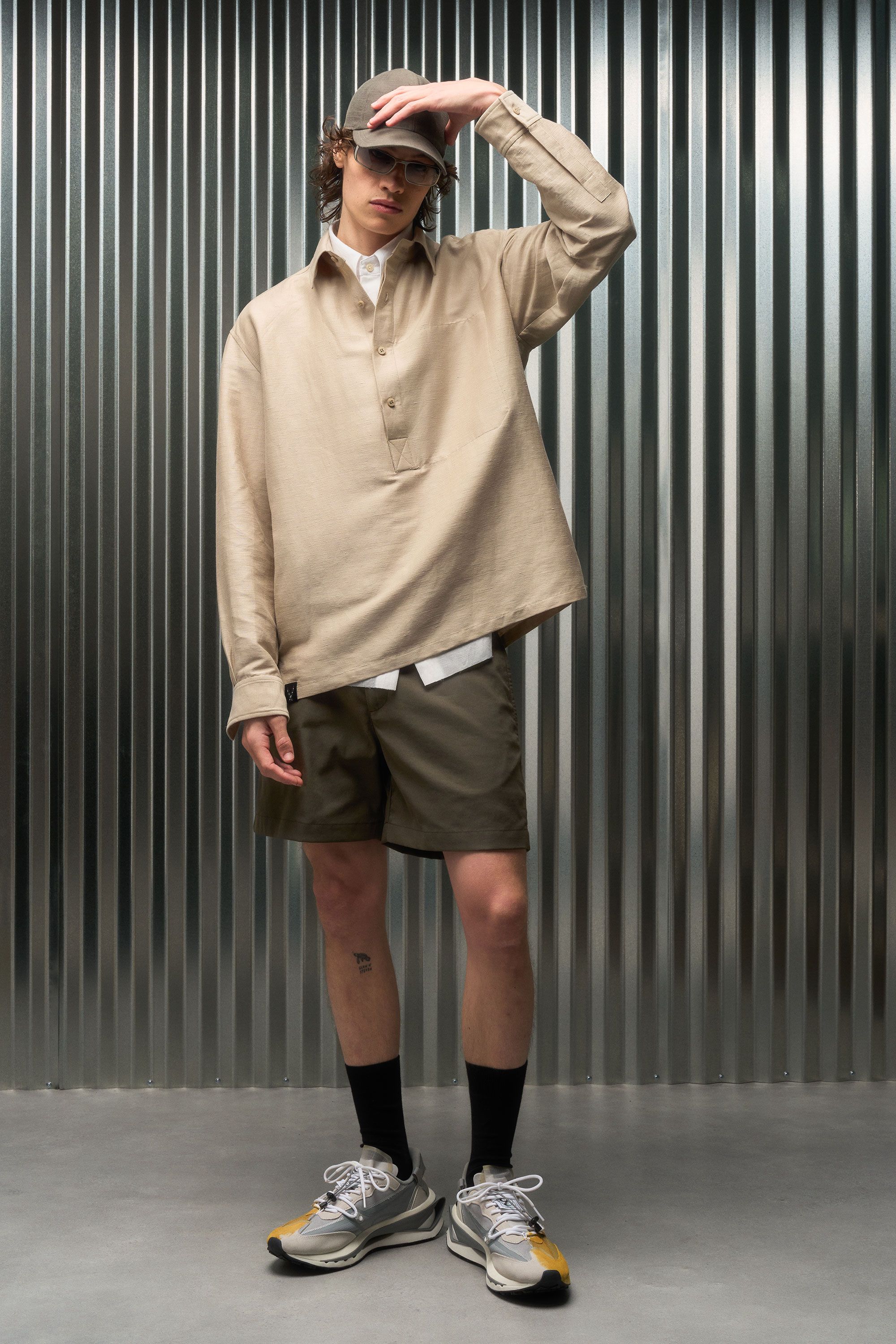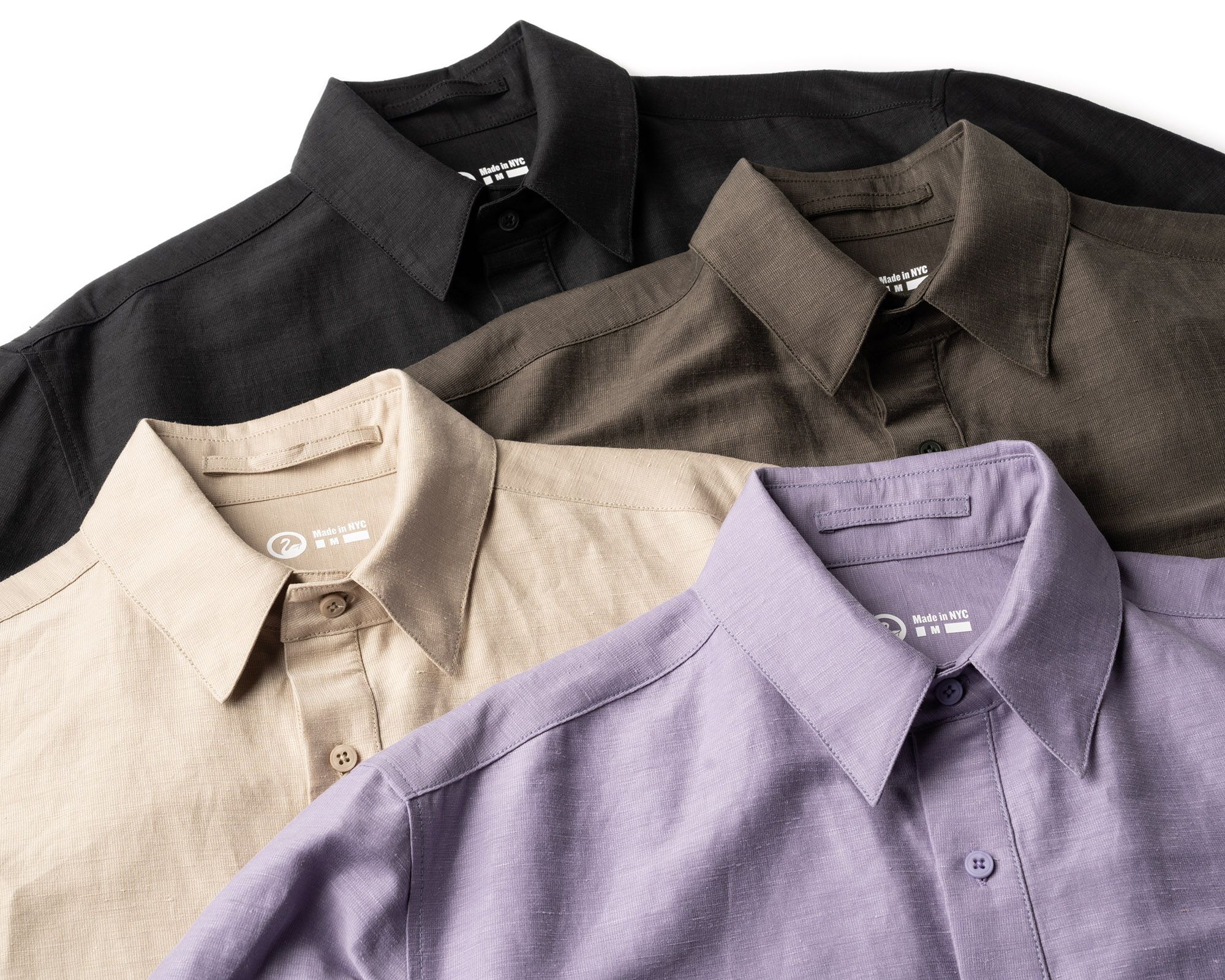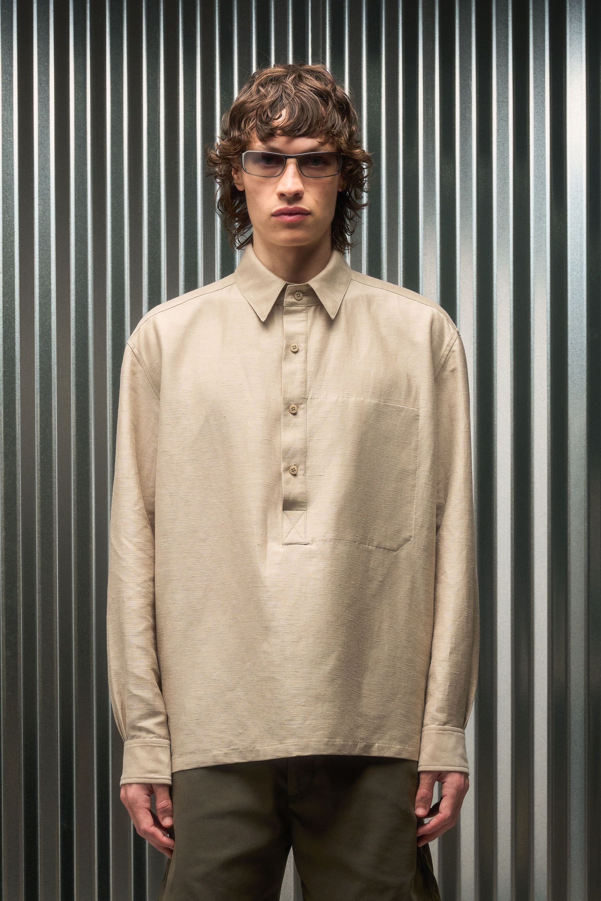 A collared long sleeved popover experiment [#516] with a subtle placket pocket. Injected Linenâs open yet opaque combination of warp knit poly and weft …