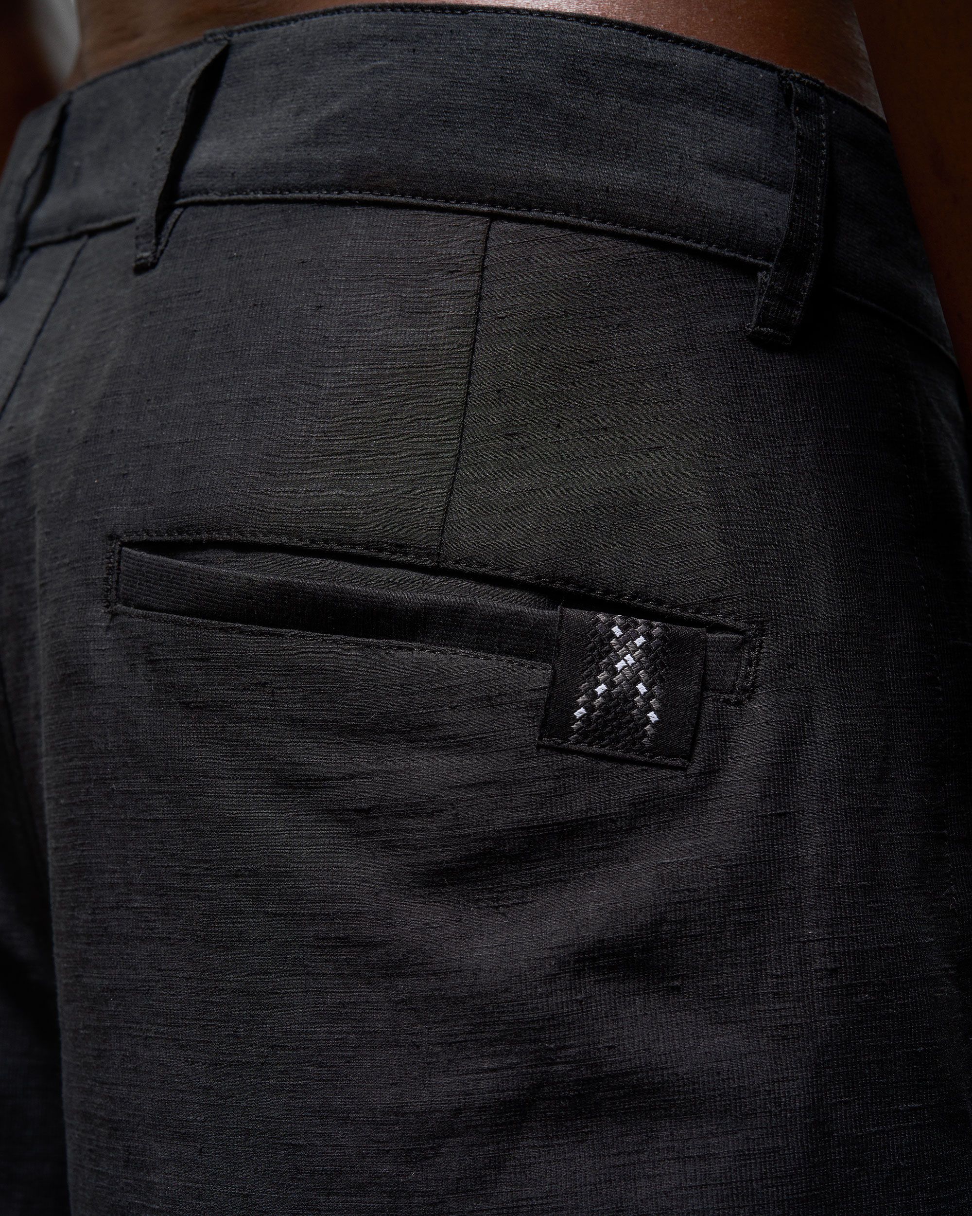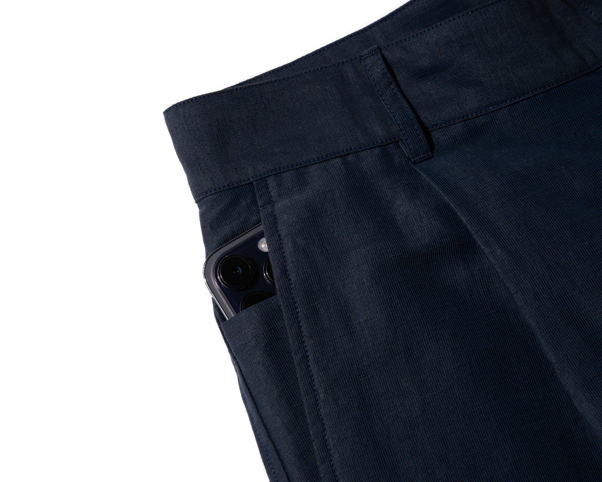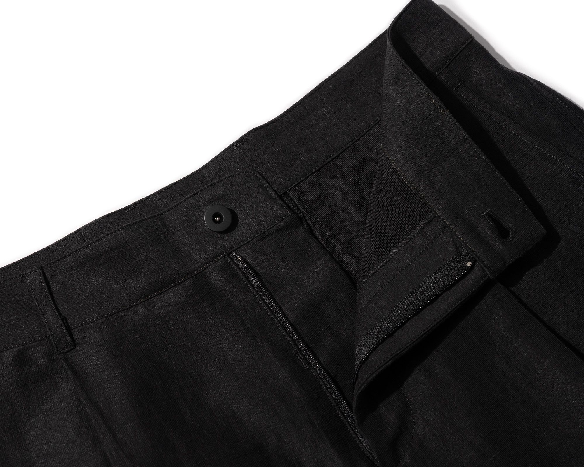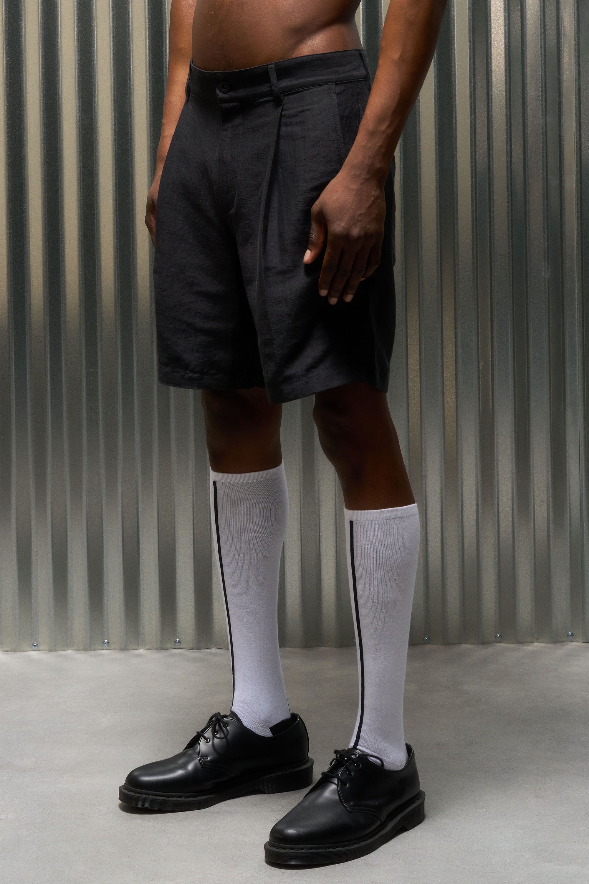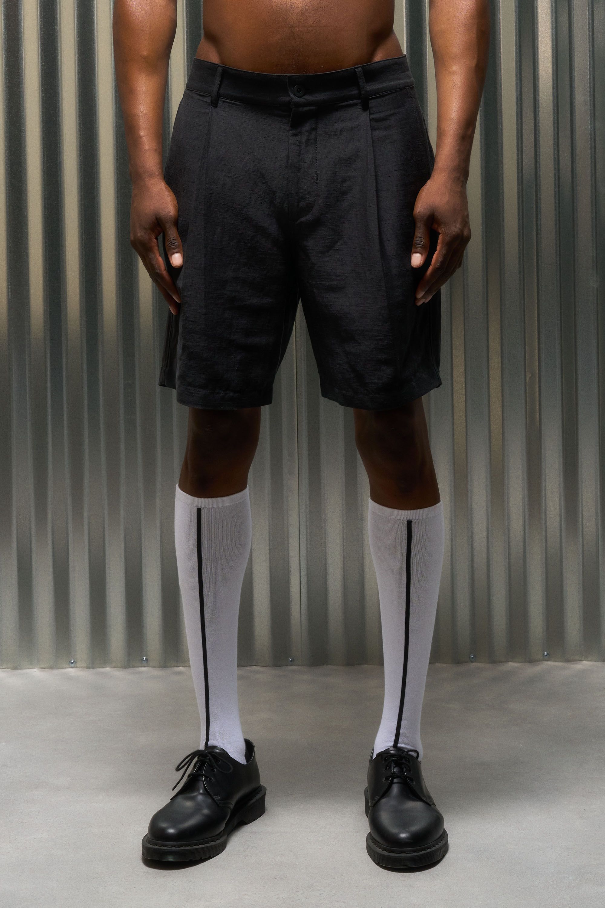 A pleated short experiment [#527] in the open yet opaque Injected Linen fabric. Shank front with single outward facing pleats on each side.