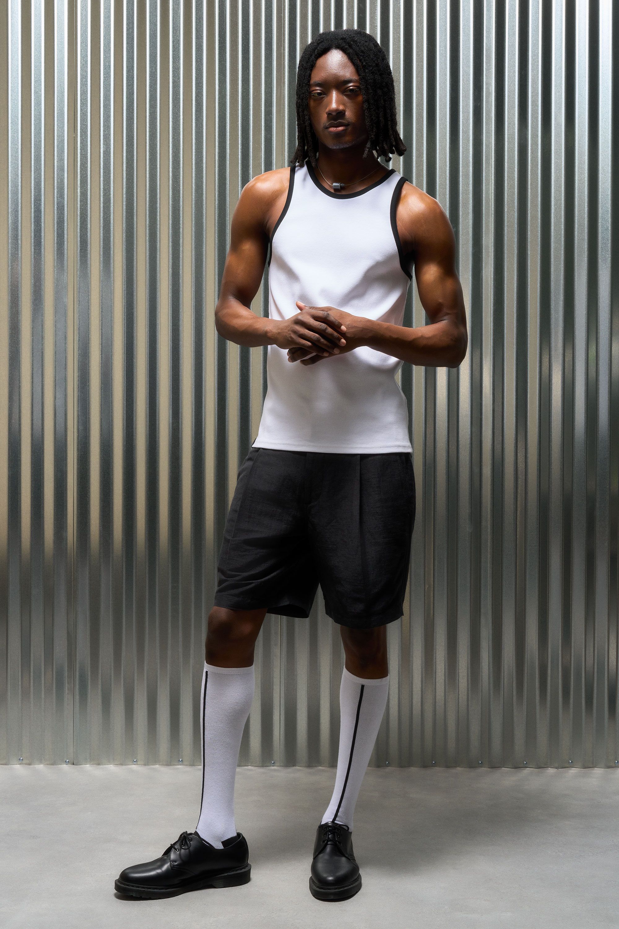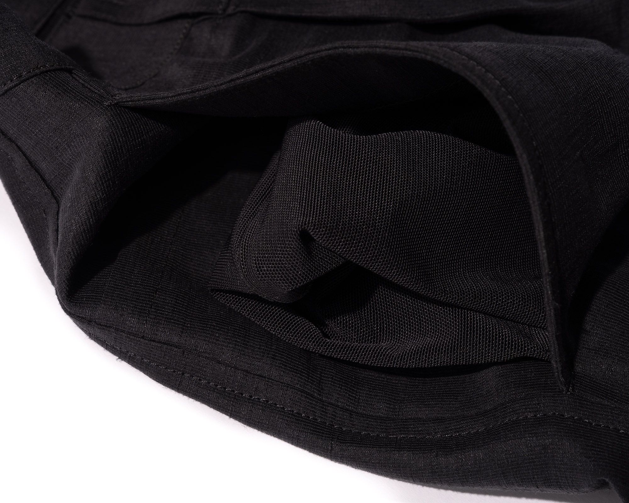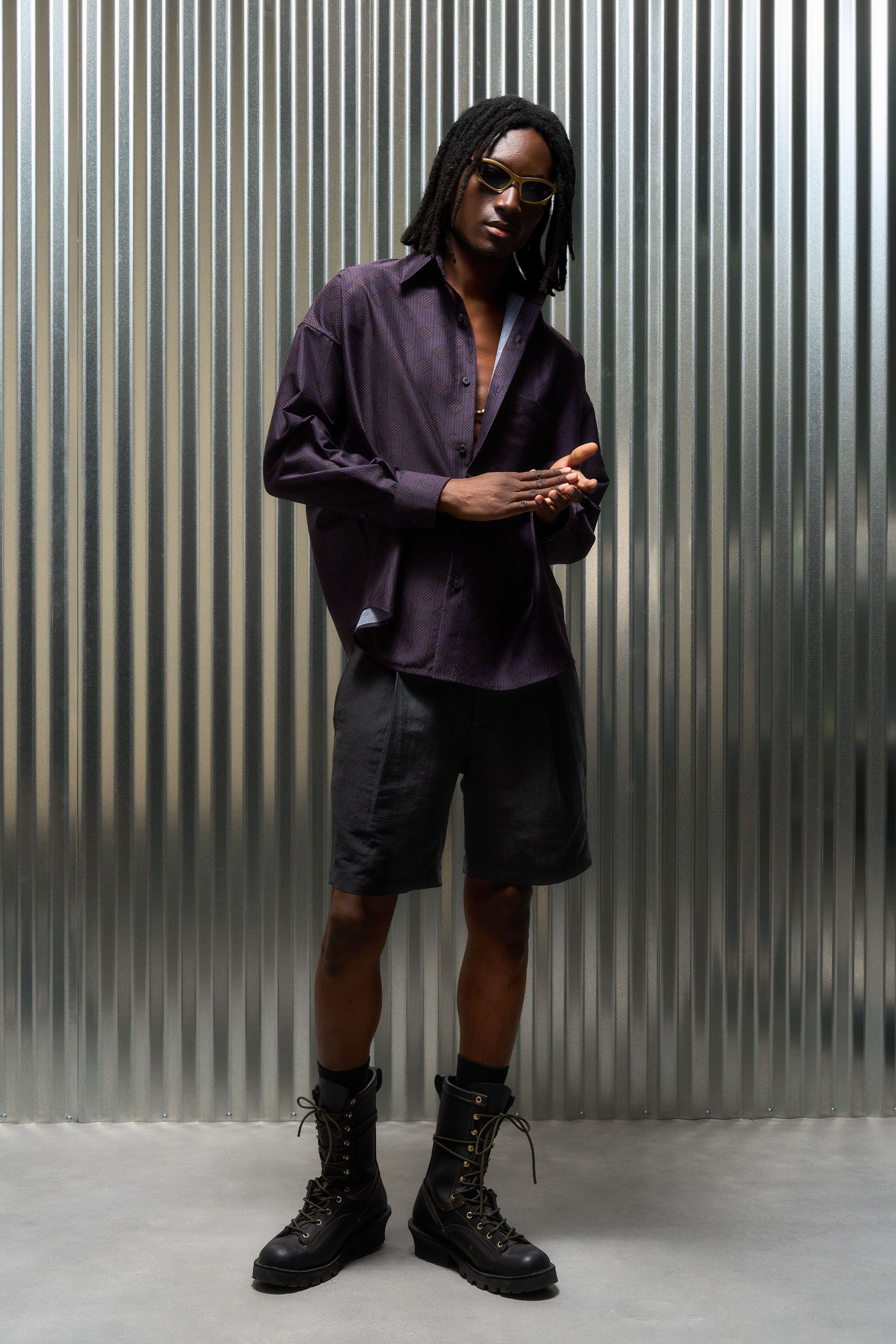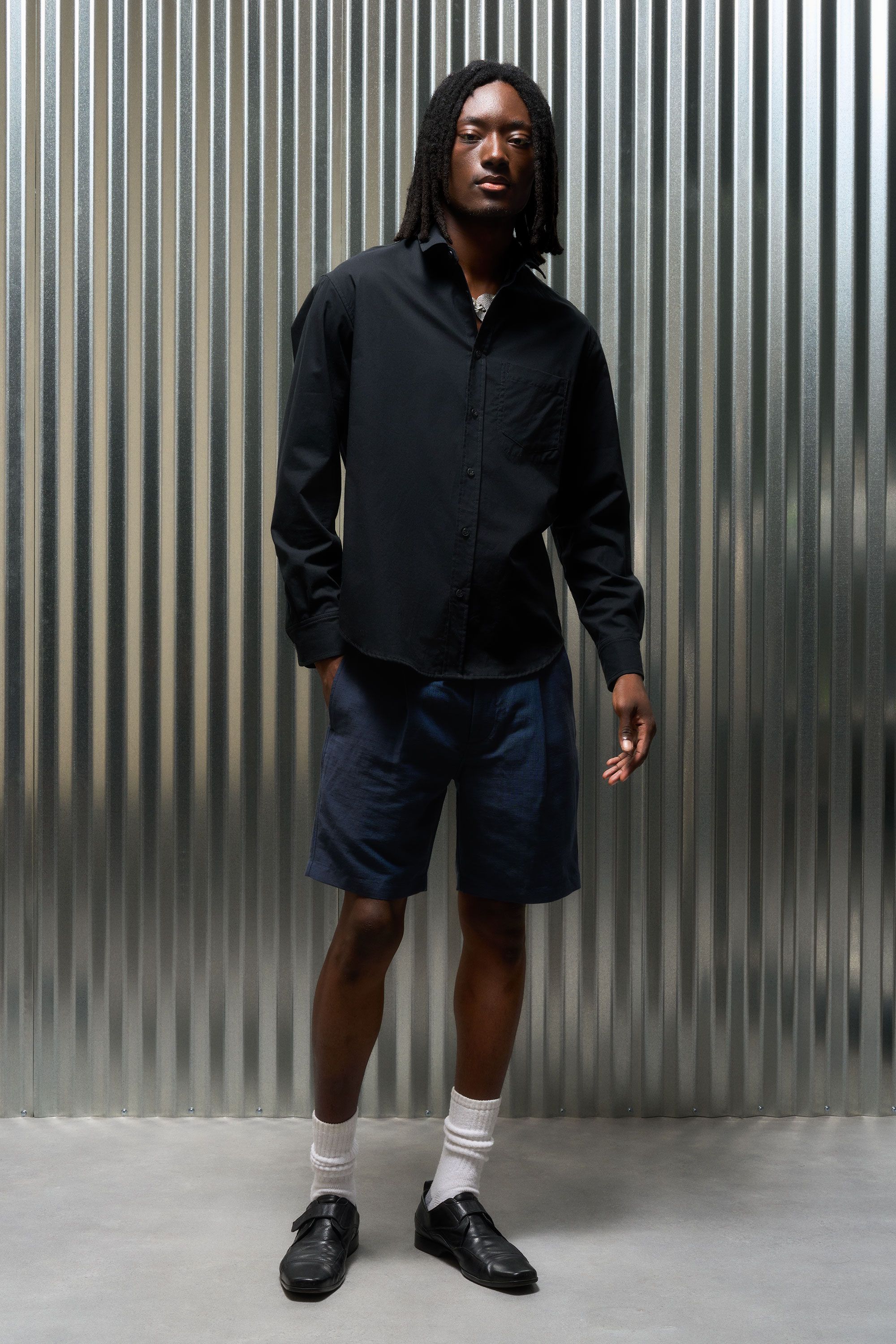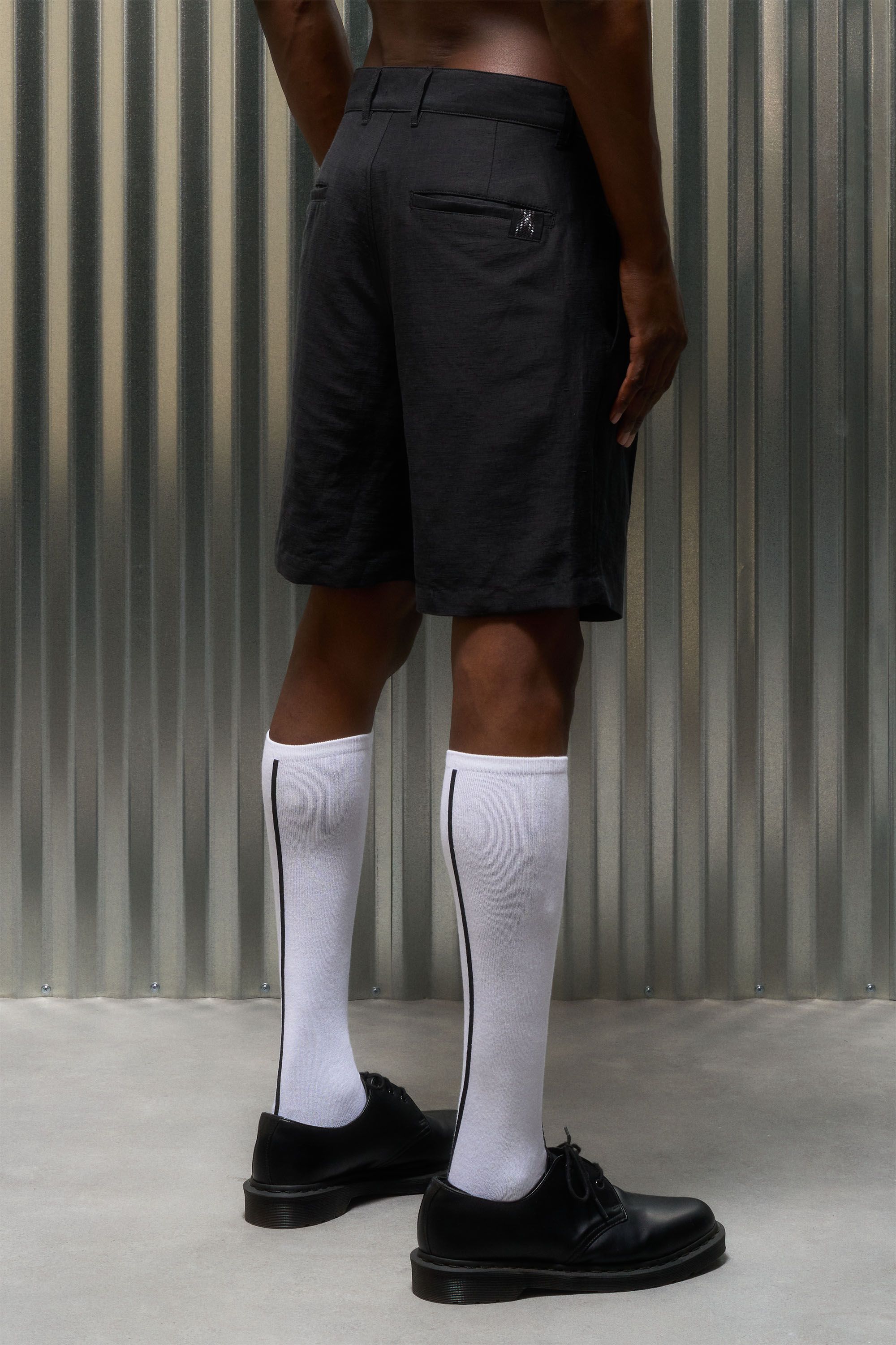 A pleated short experiment [#527] in the open yet opaque Injected Linen fabric. Shank front with single outward facing pleats on each side.