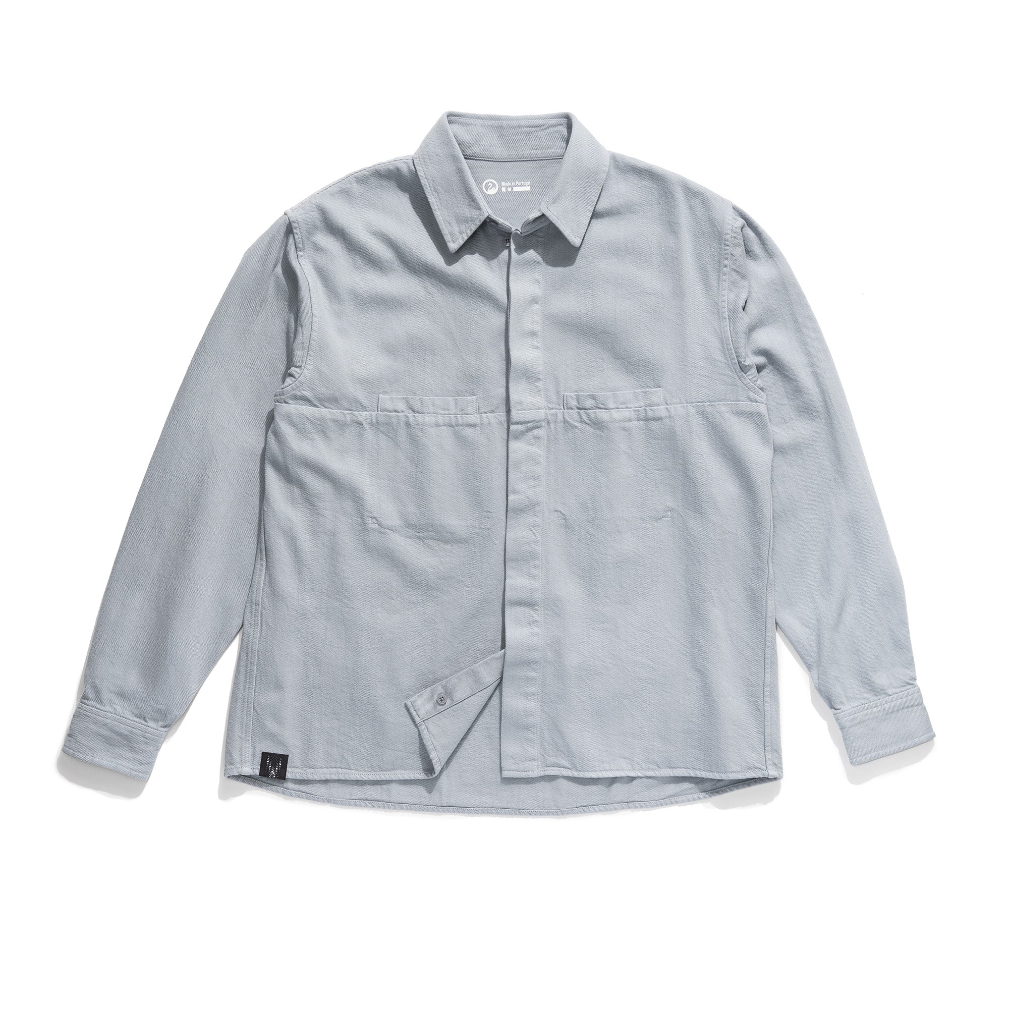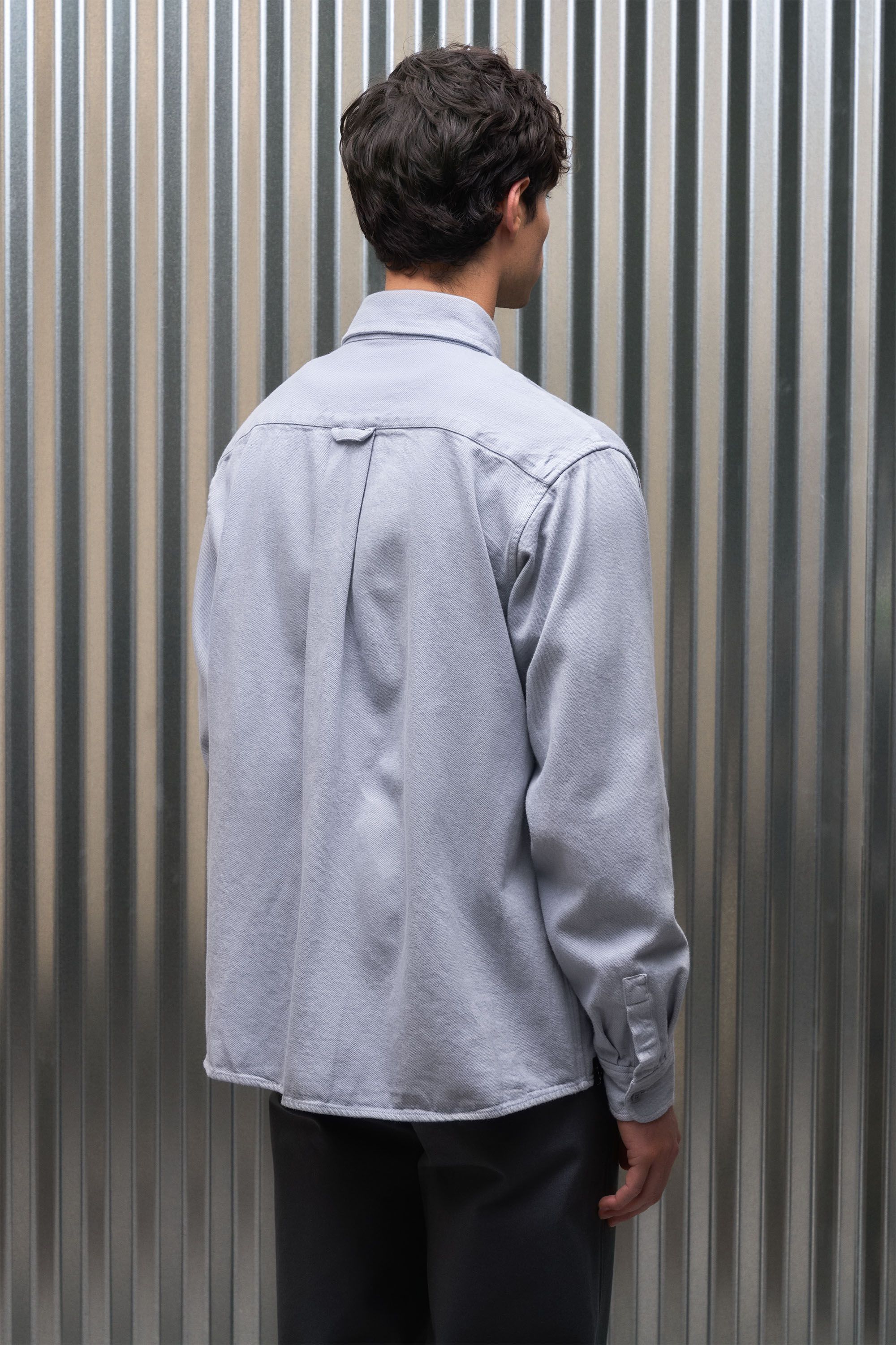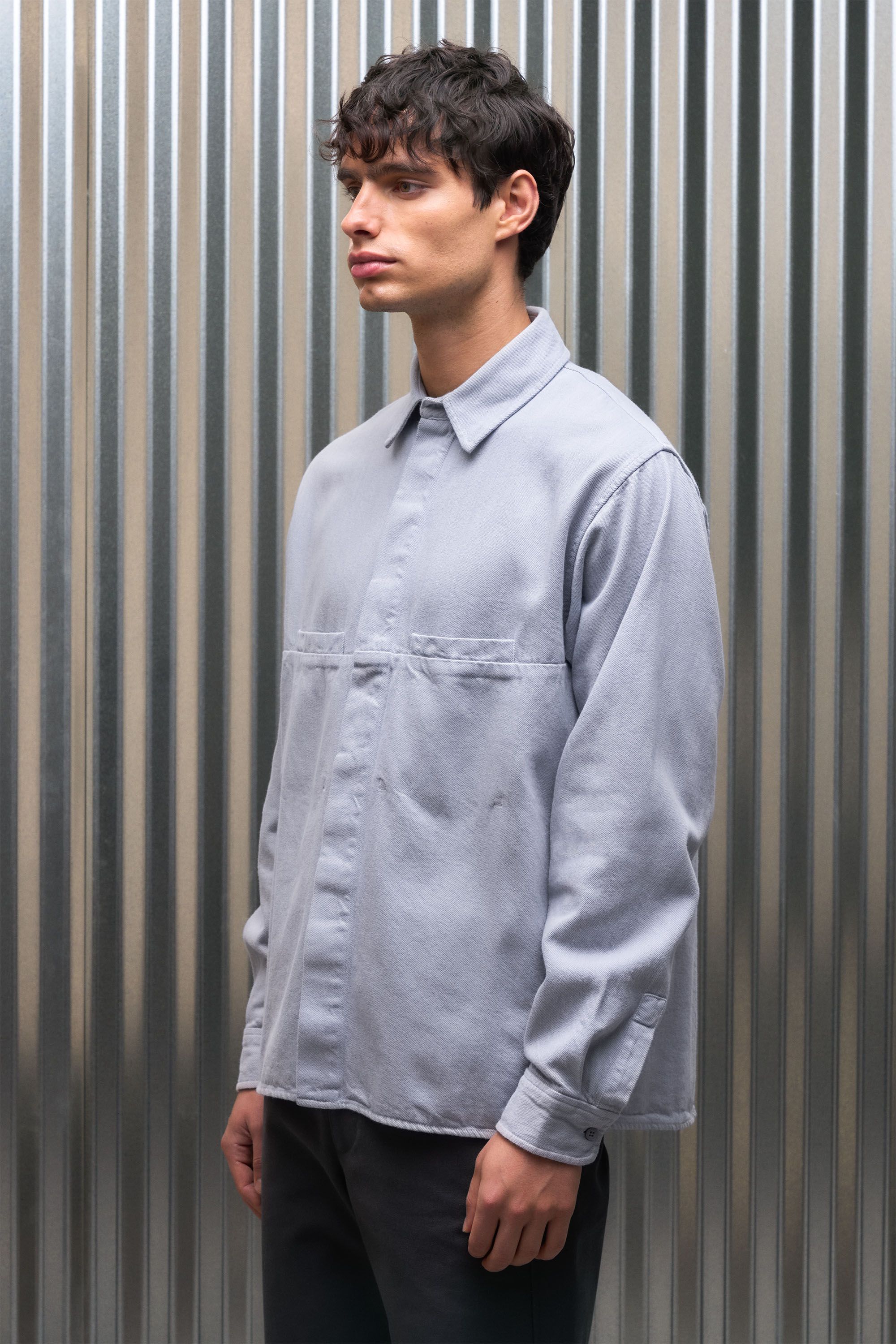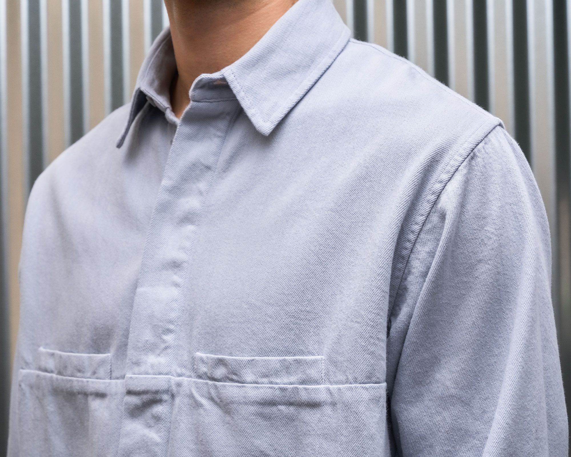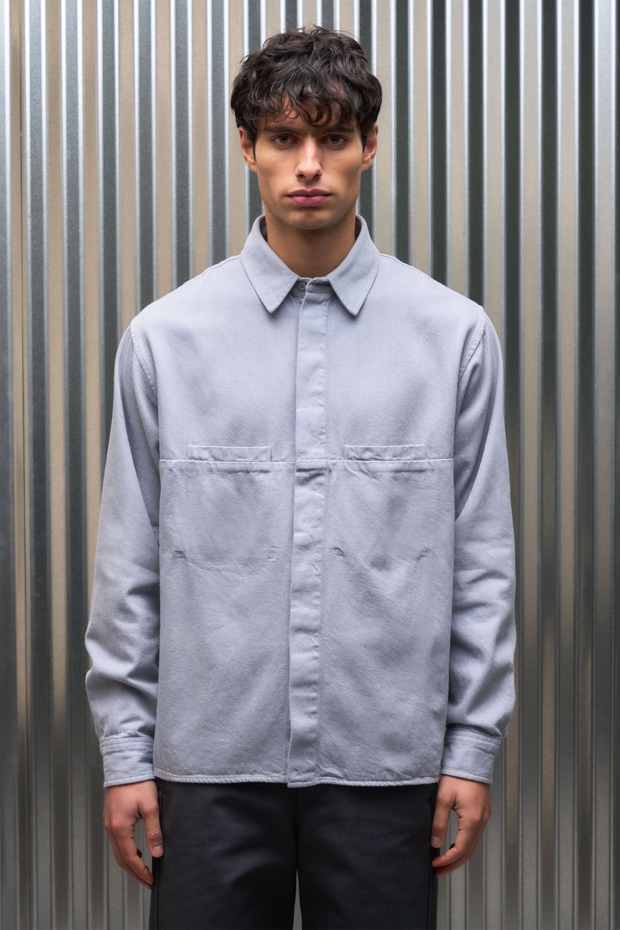 A simple heavyweight and garment dyed overshirt with a split chest construction. Features two low slung and set-in chest pockets and a hidden placket fr…