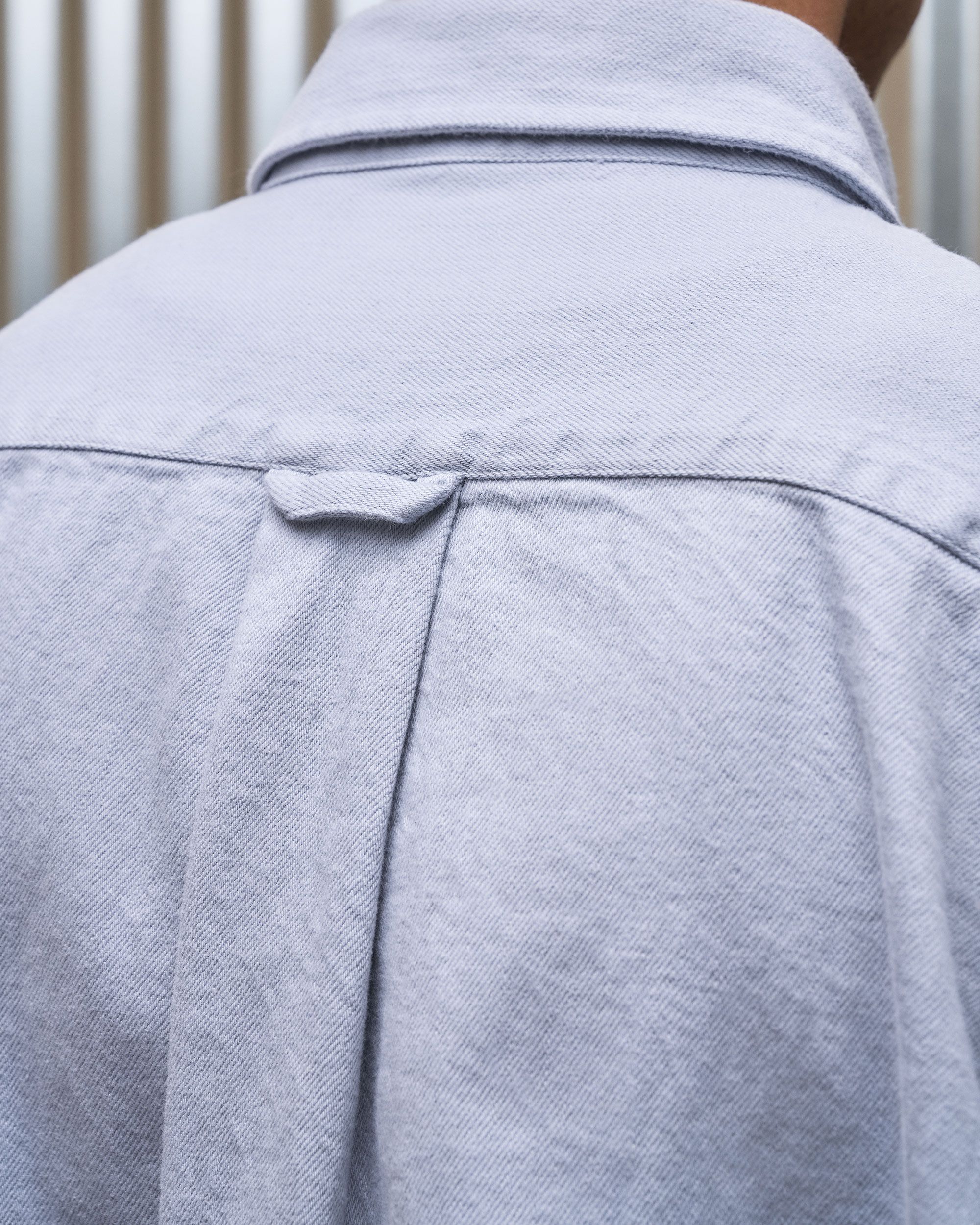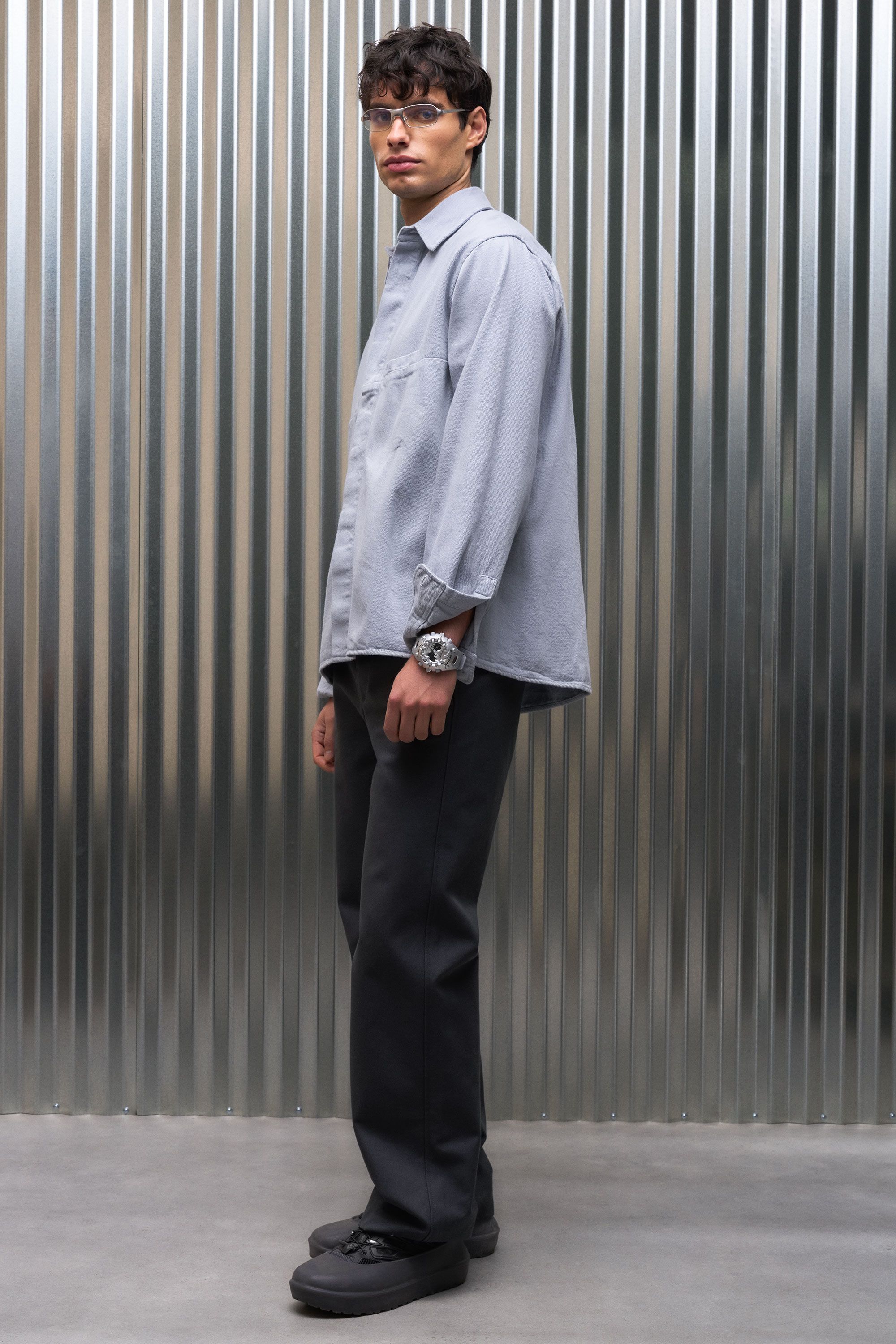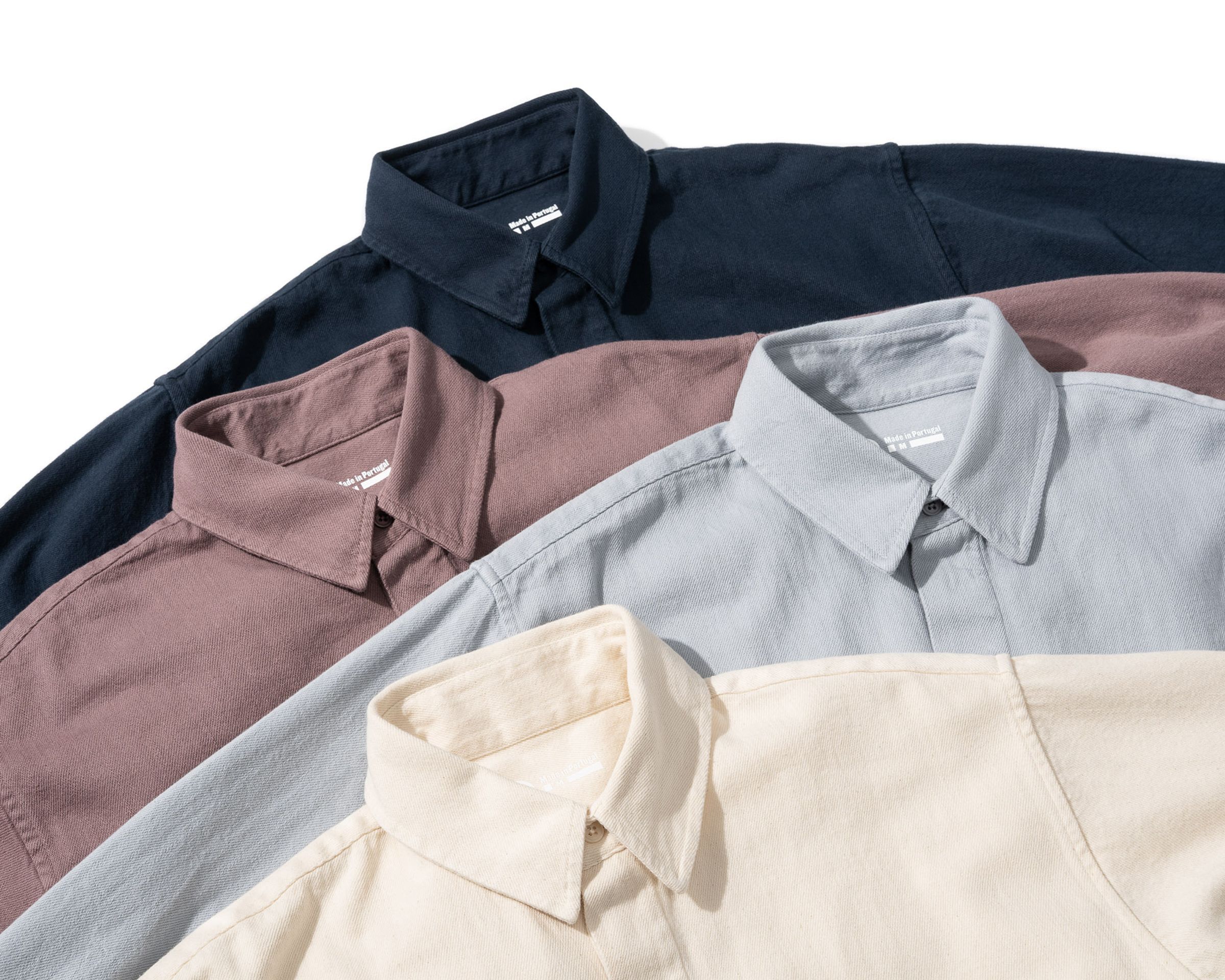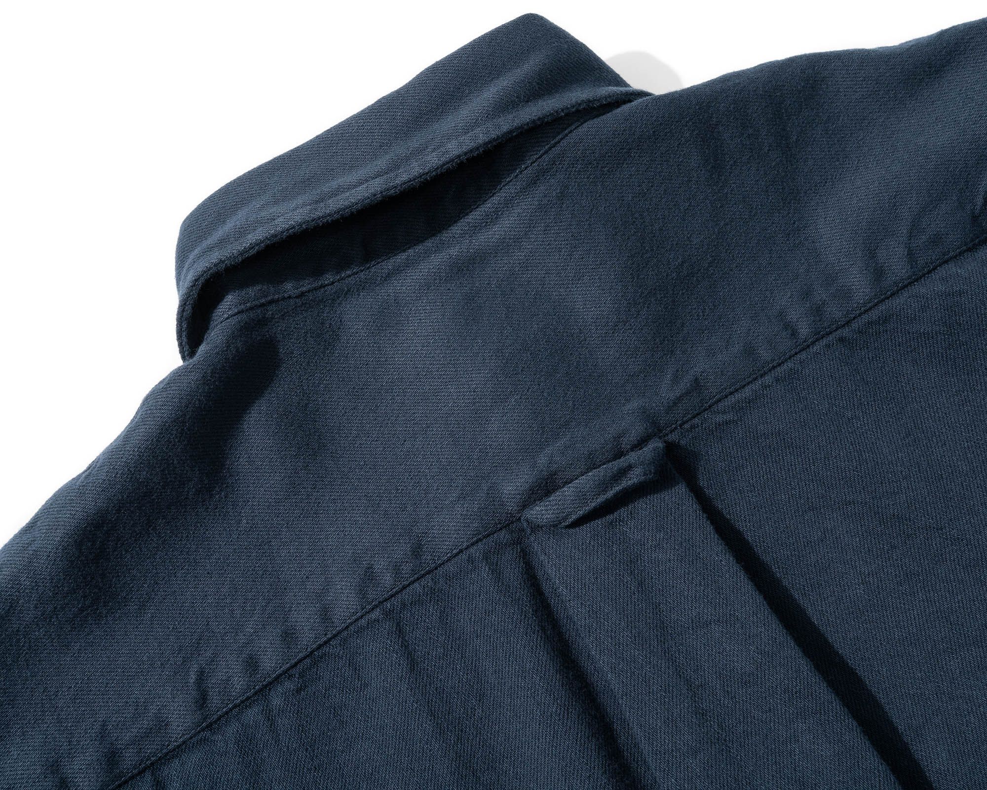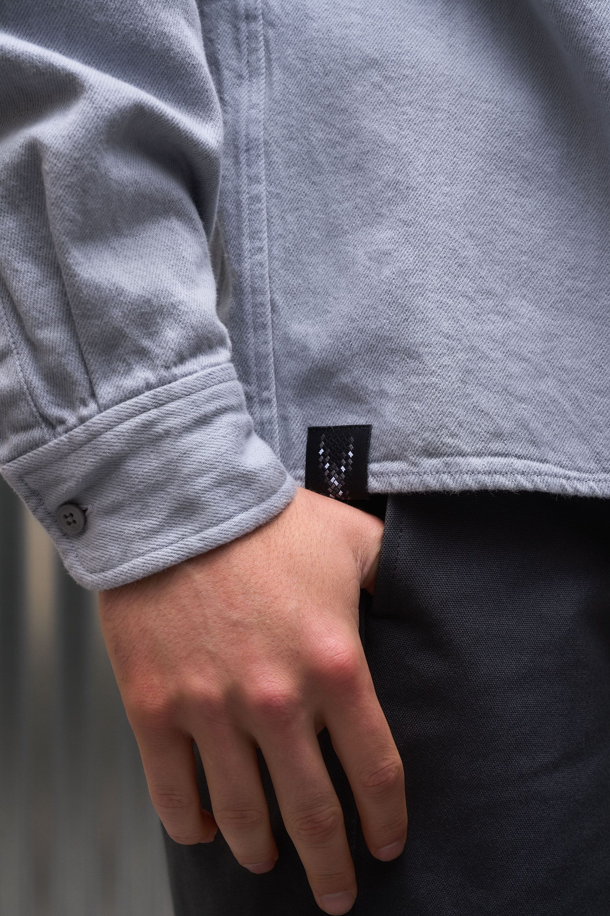 A simple heavyweight and garment dyed overshirt with a split chest construction. Features two low slung and set-in chest pockets and a hidden placket fr…