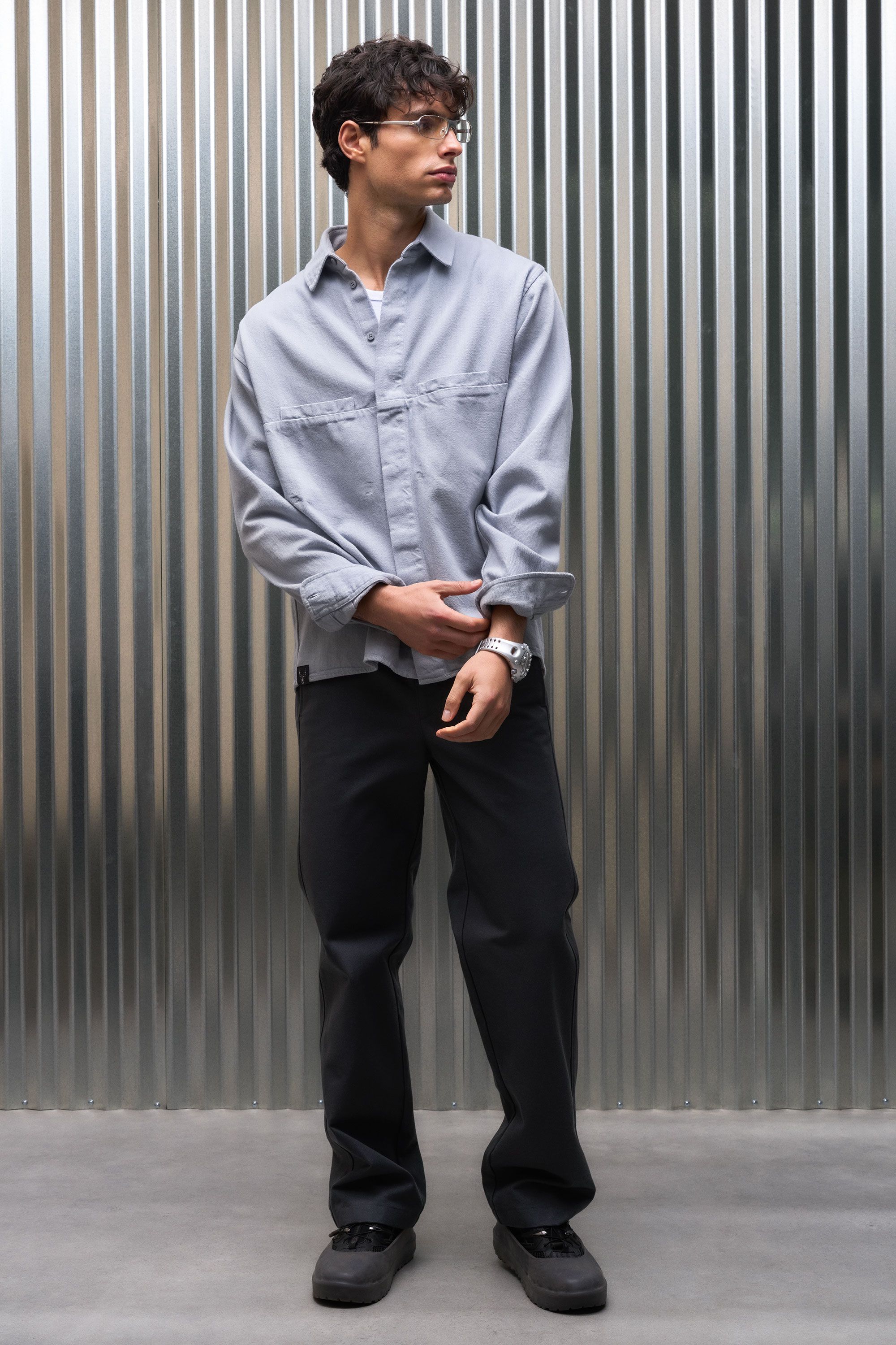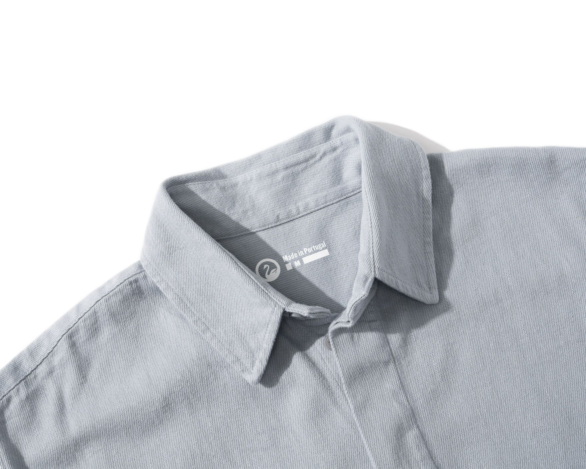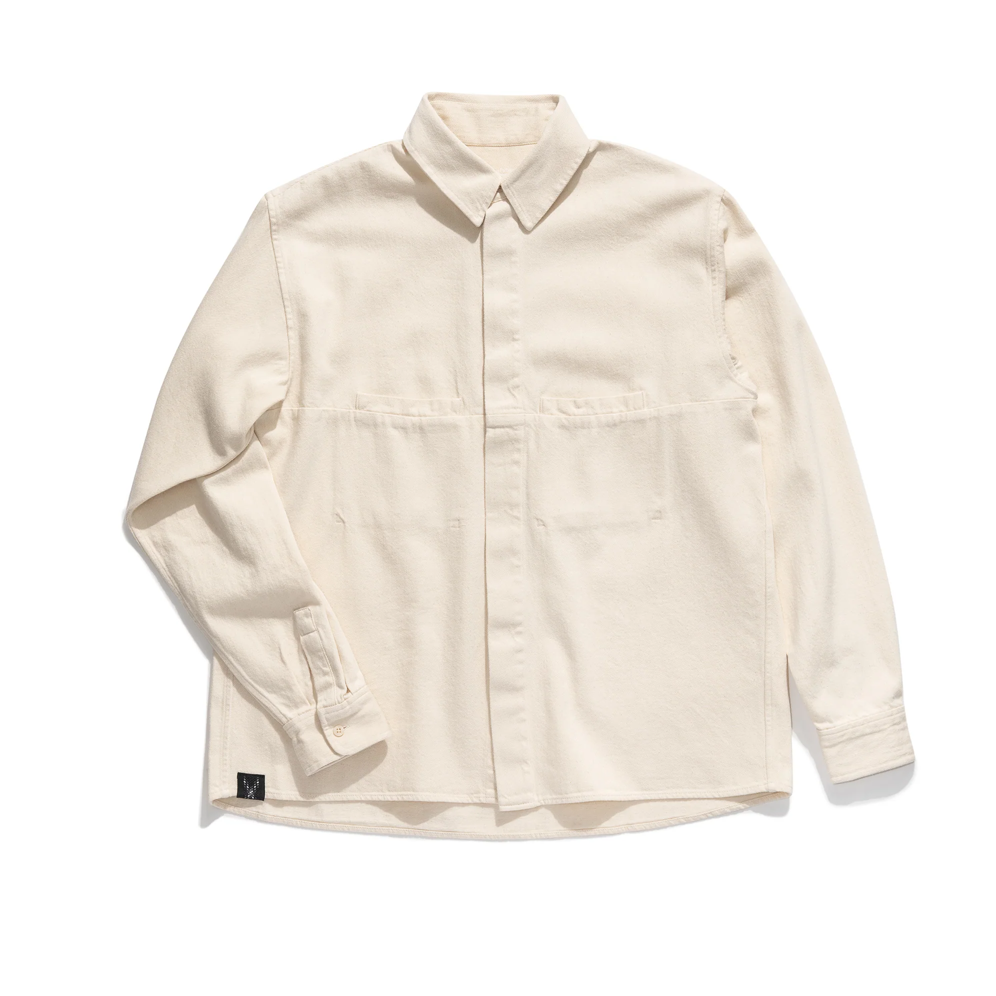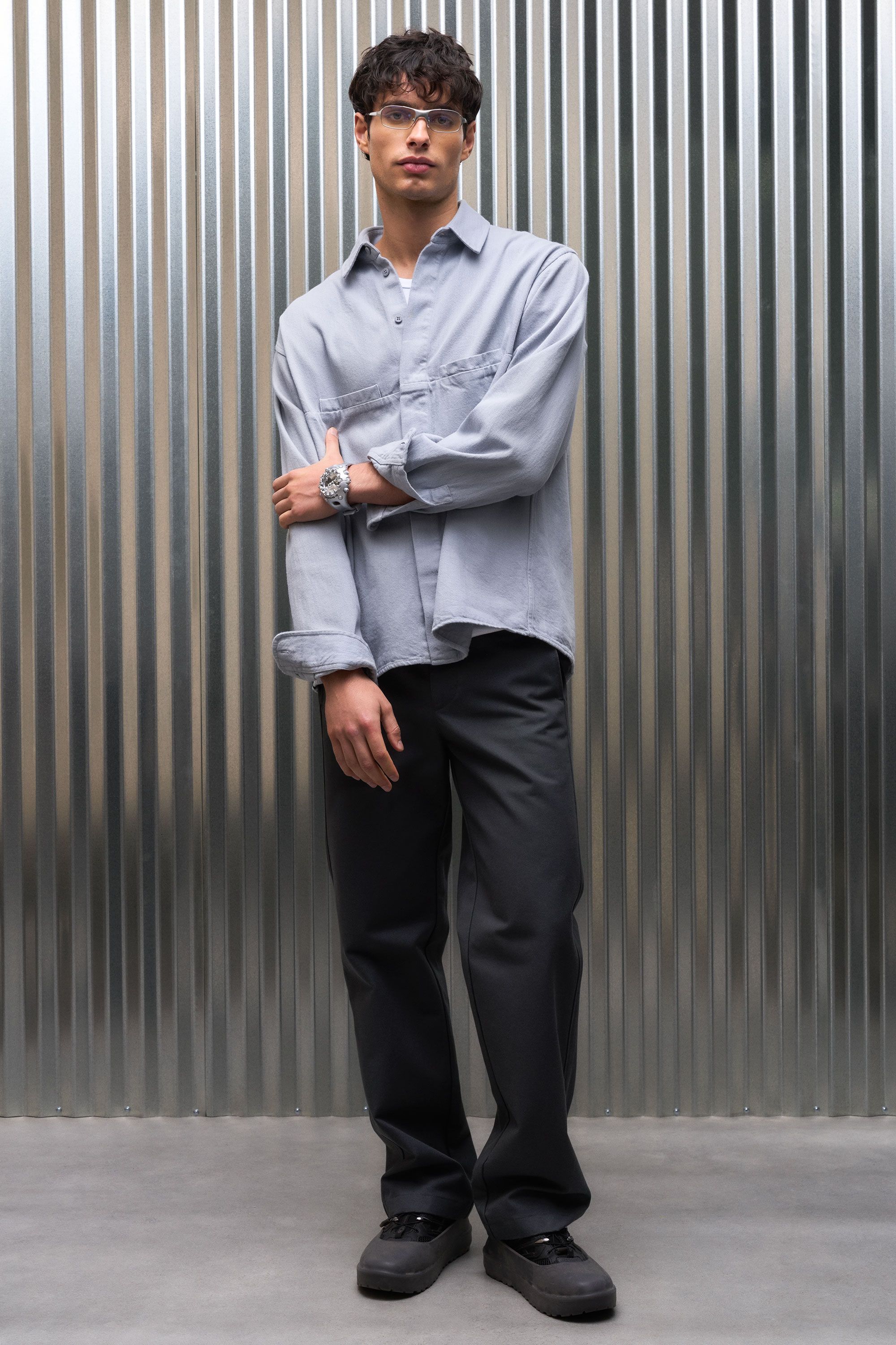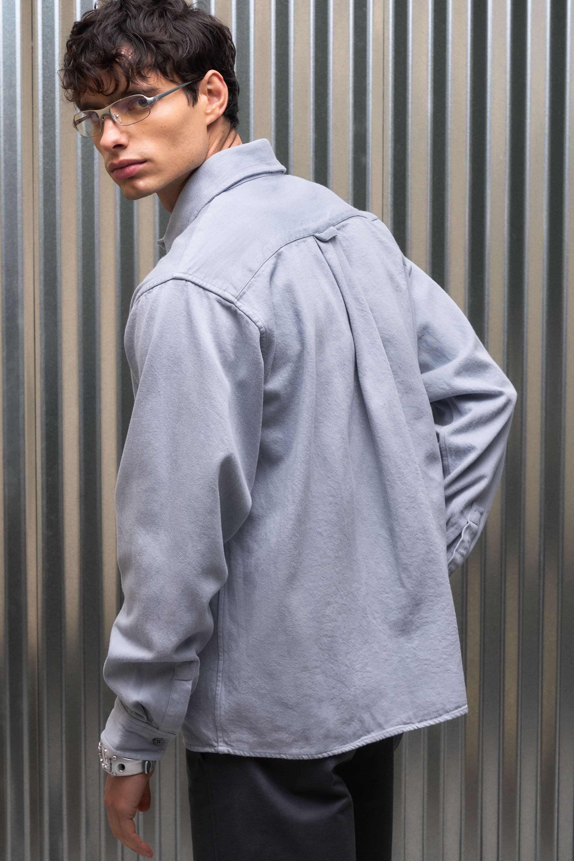 A simple heavyweight and garment dyed overshirt with a split chest construction. Features two low slung and set-in chest pockets and a hidden placket fr…