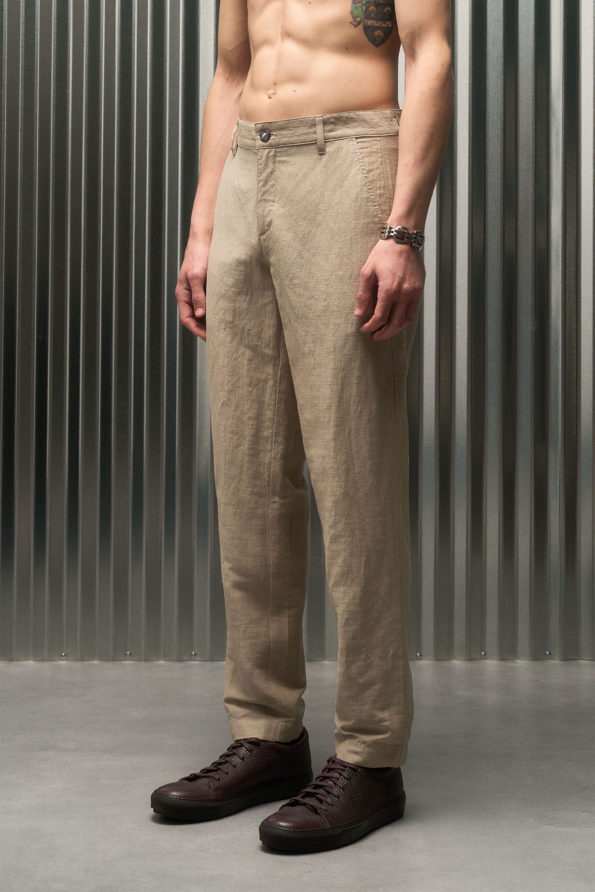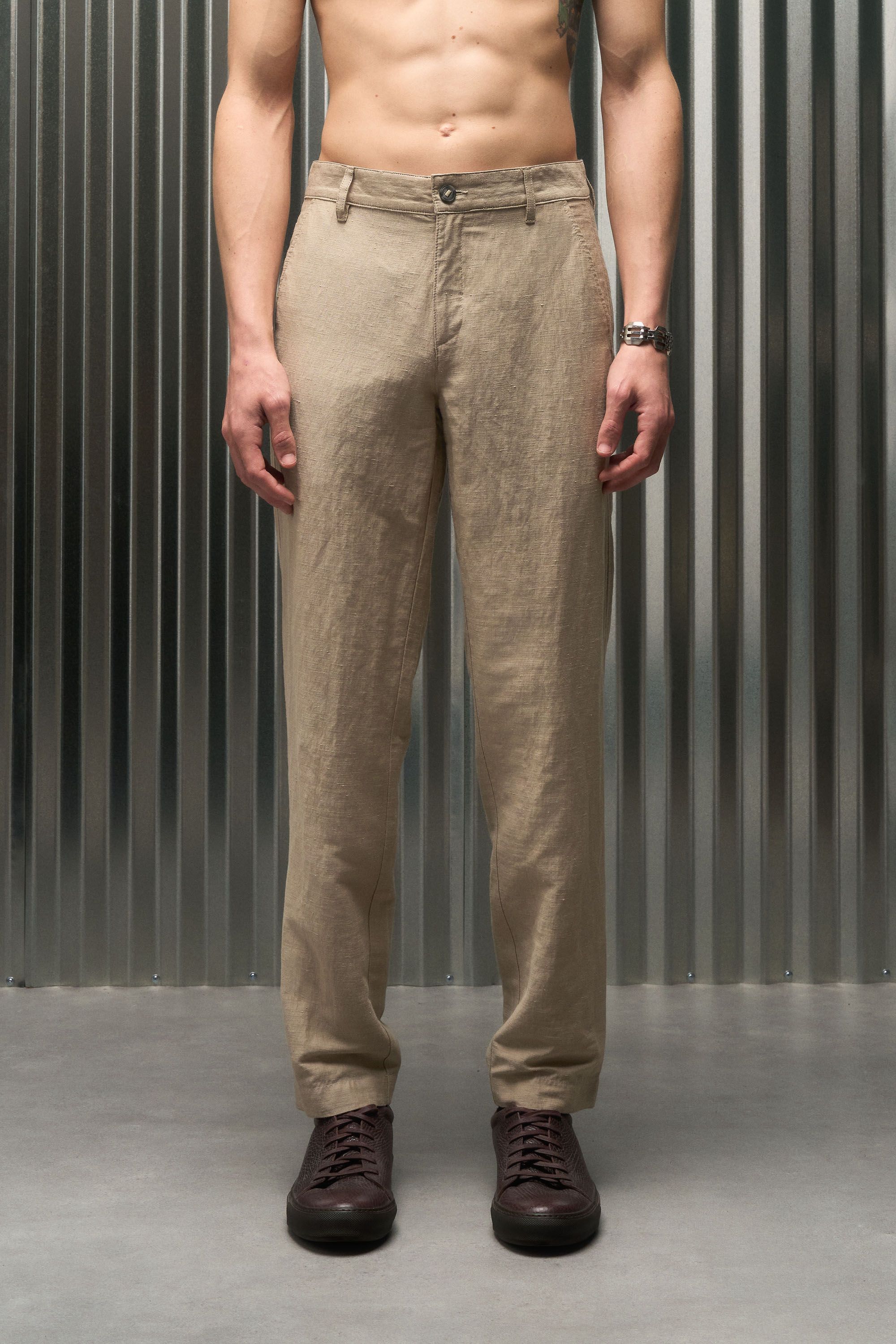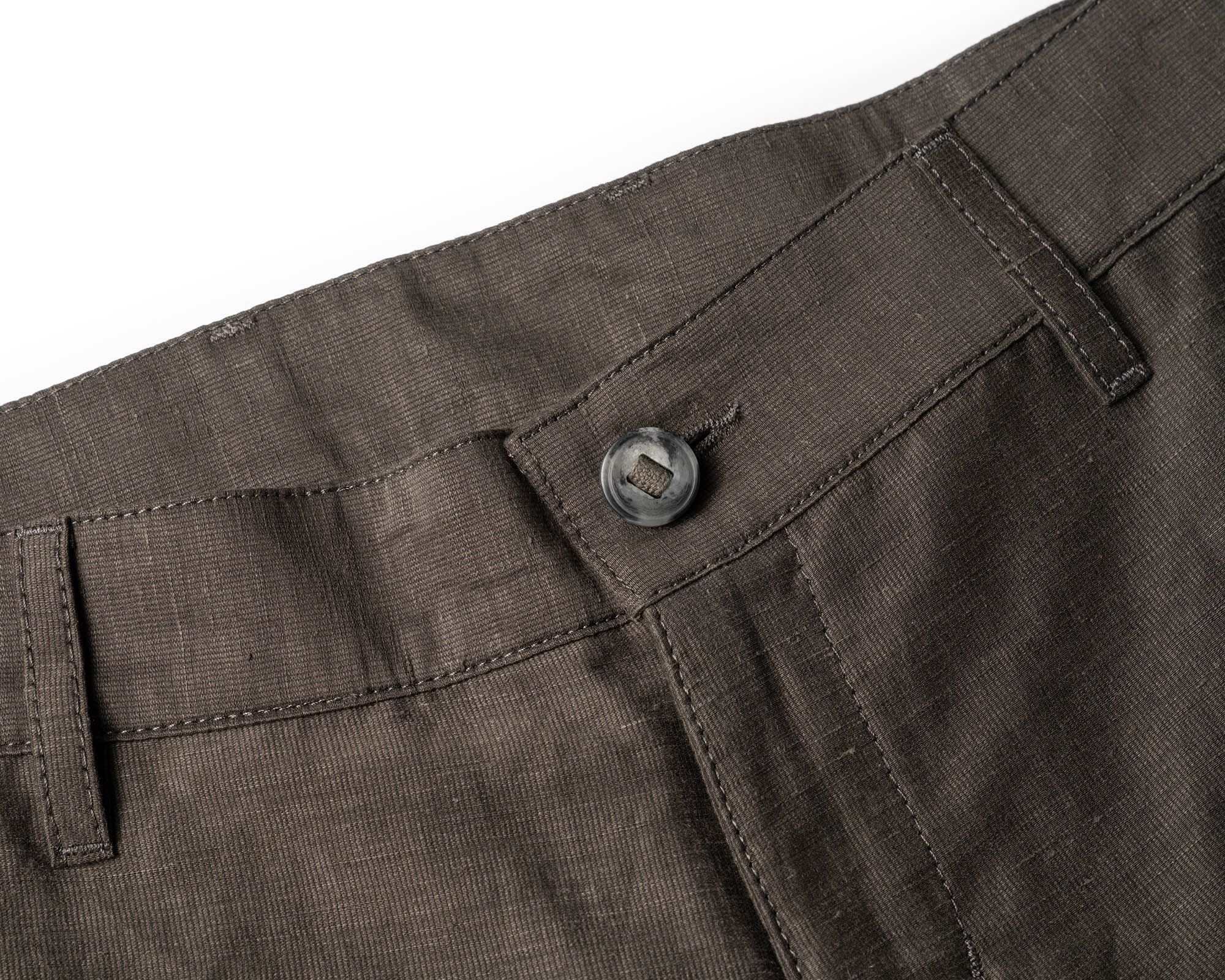 A pant that wears like a short, made from a fabric remarkably open to the air yet opaque to the eye. Linen’s dry touch and beautiful aging character mee…