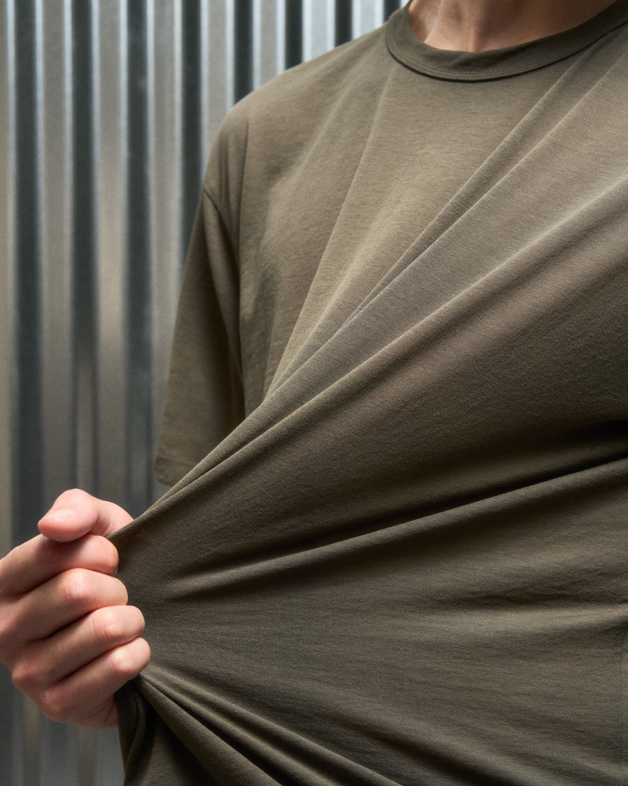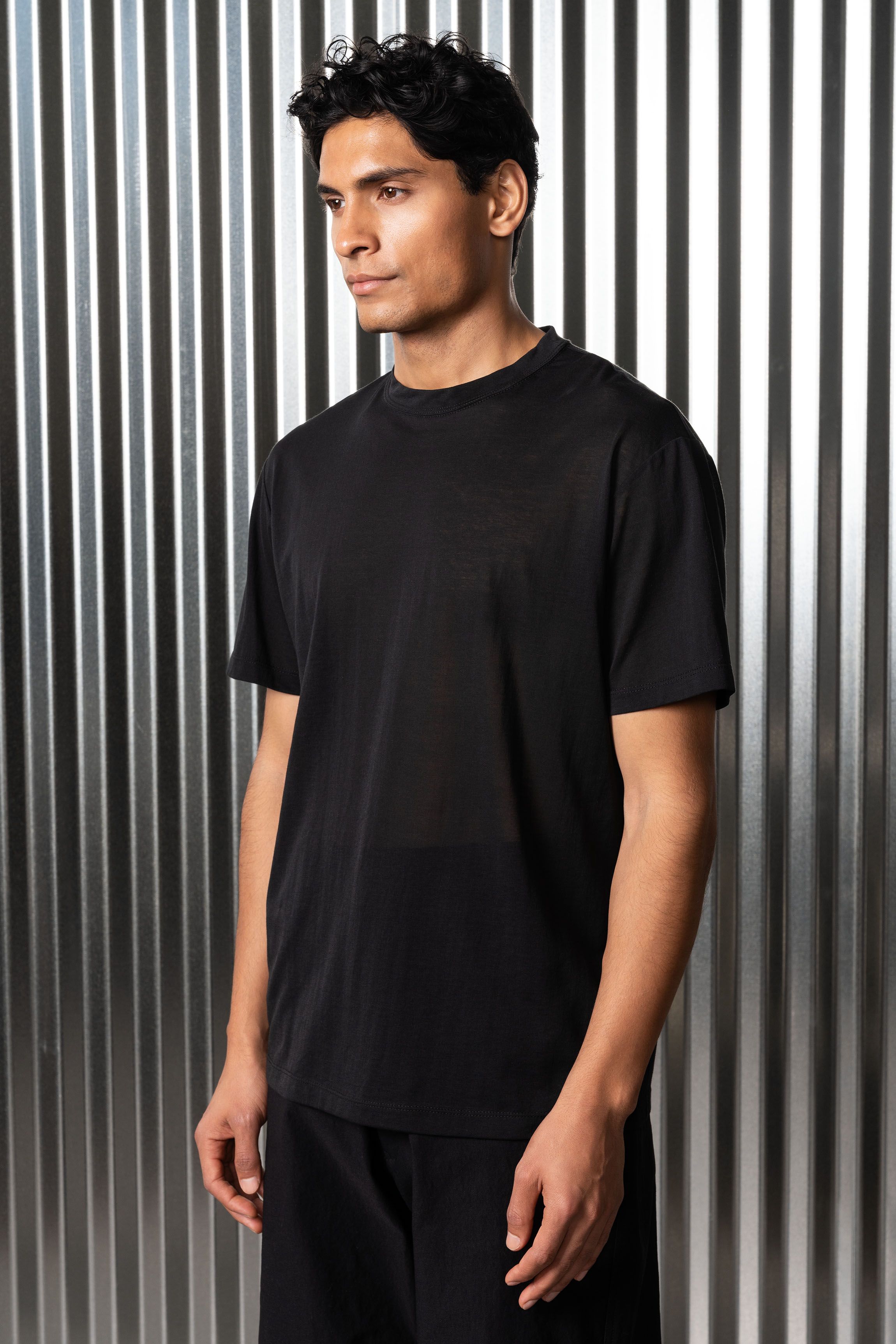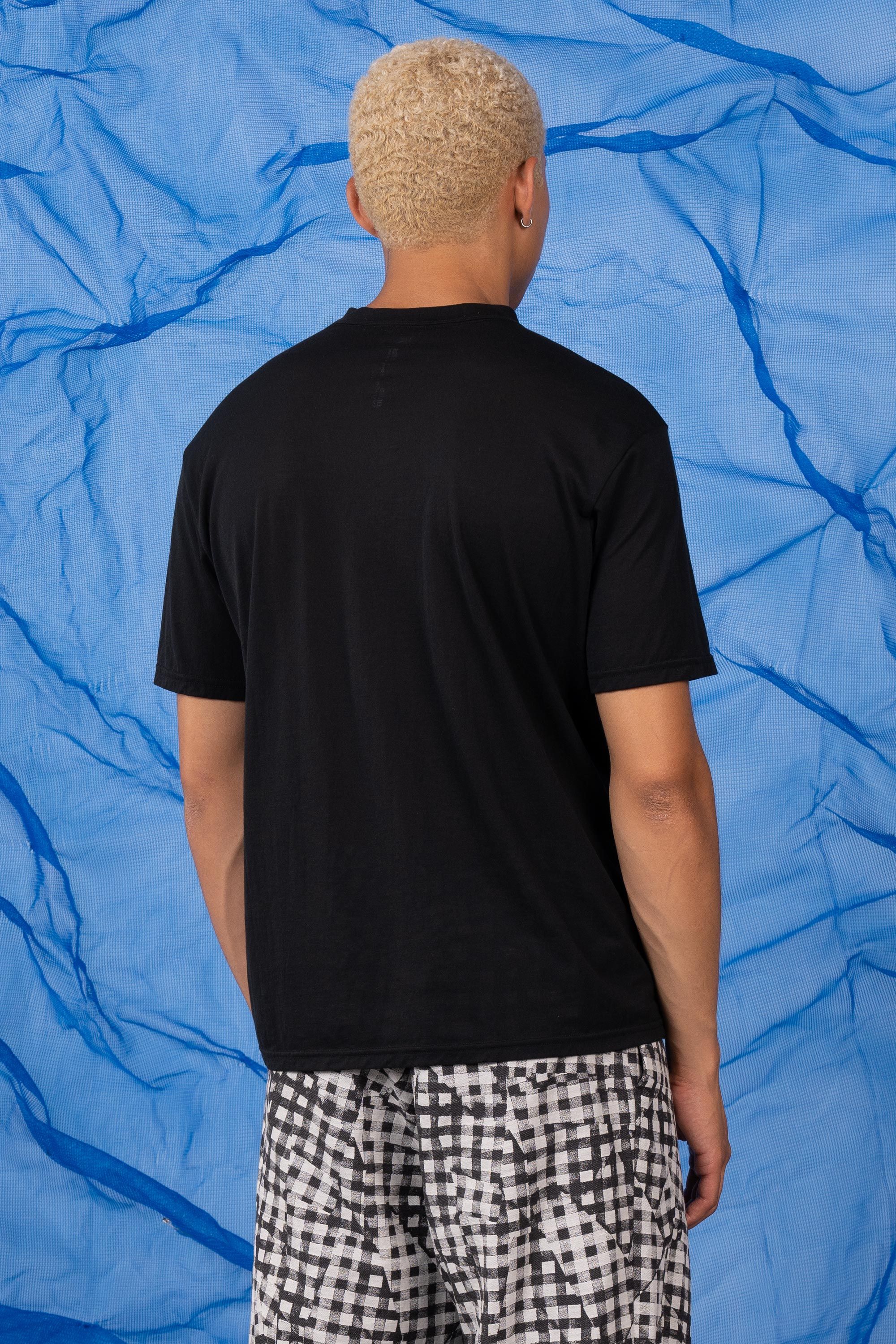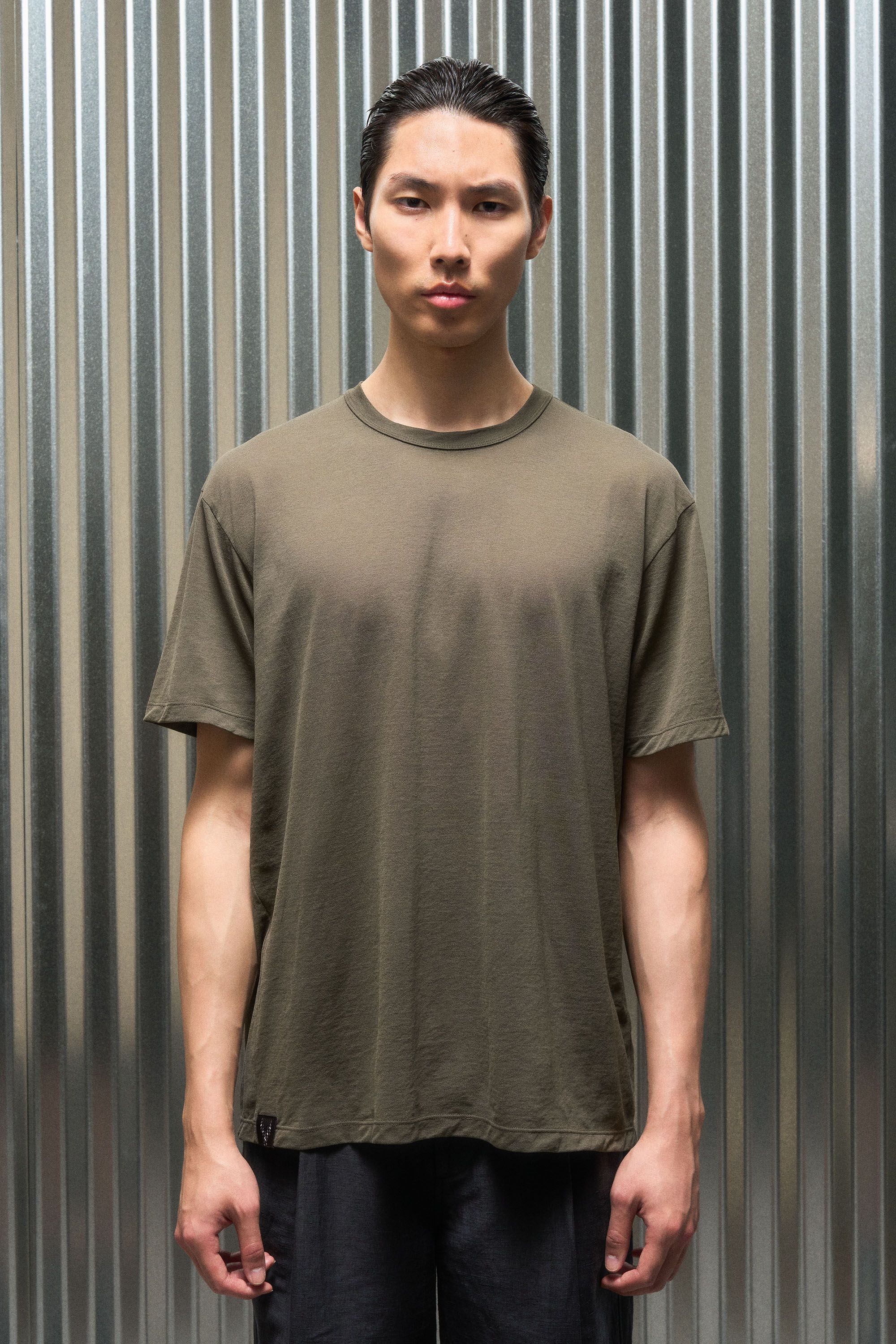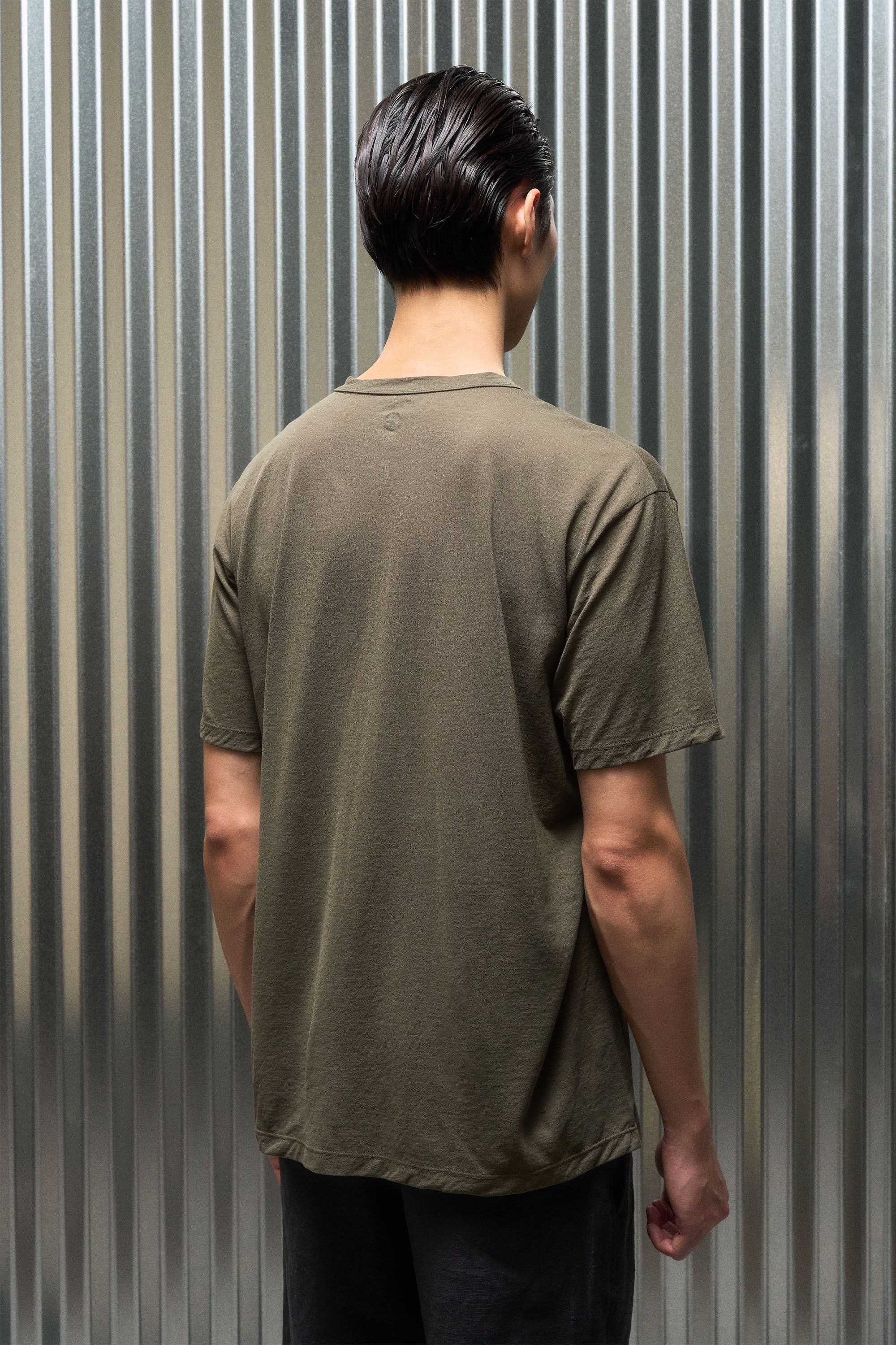 A t-shirt contemplating nothingness. Cotton is wrapped around a nylon filament core and enzyme cleaned to create a hyper-light cotton jersey that combin…