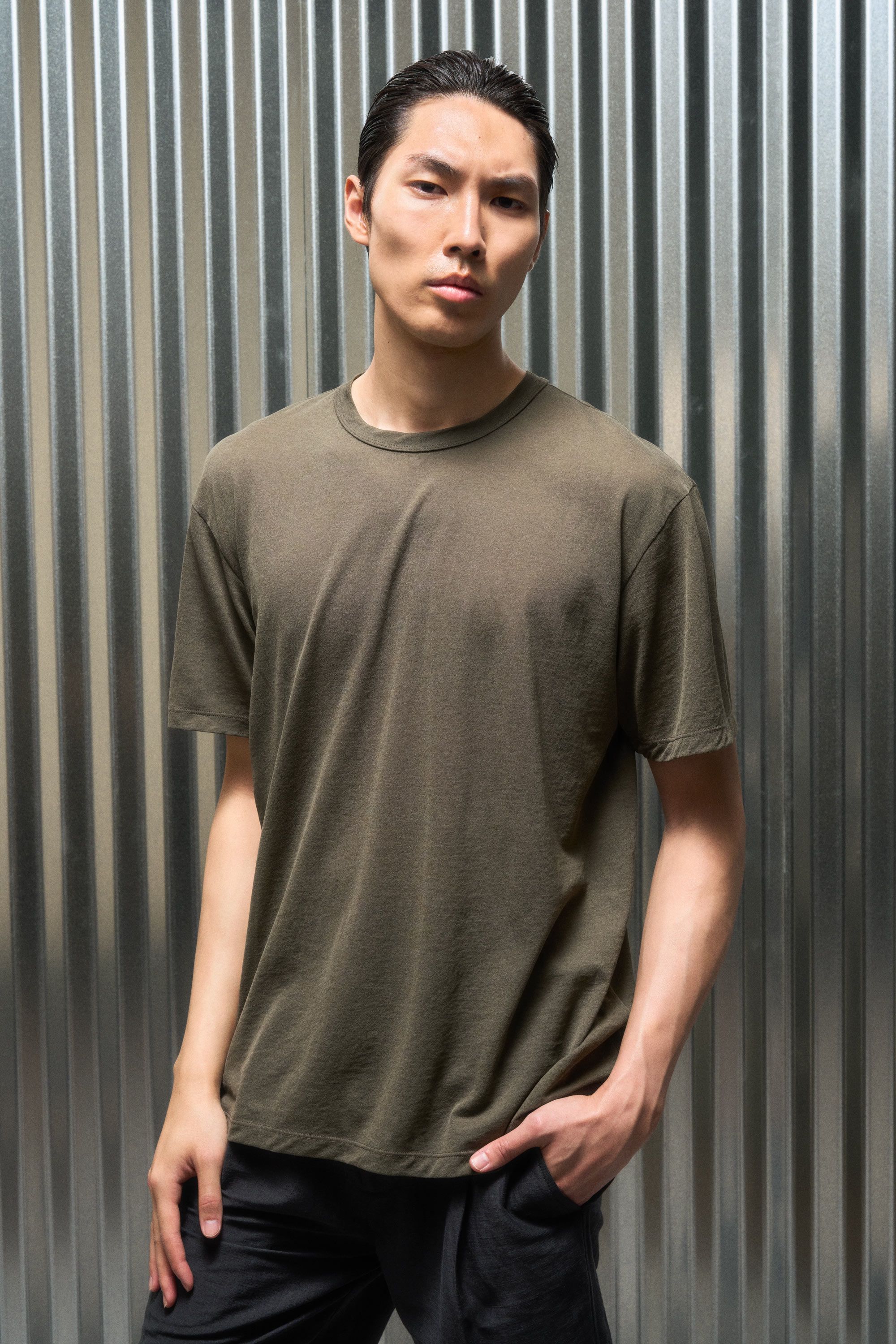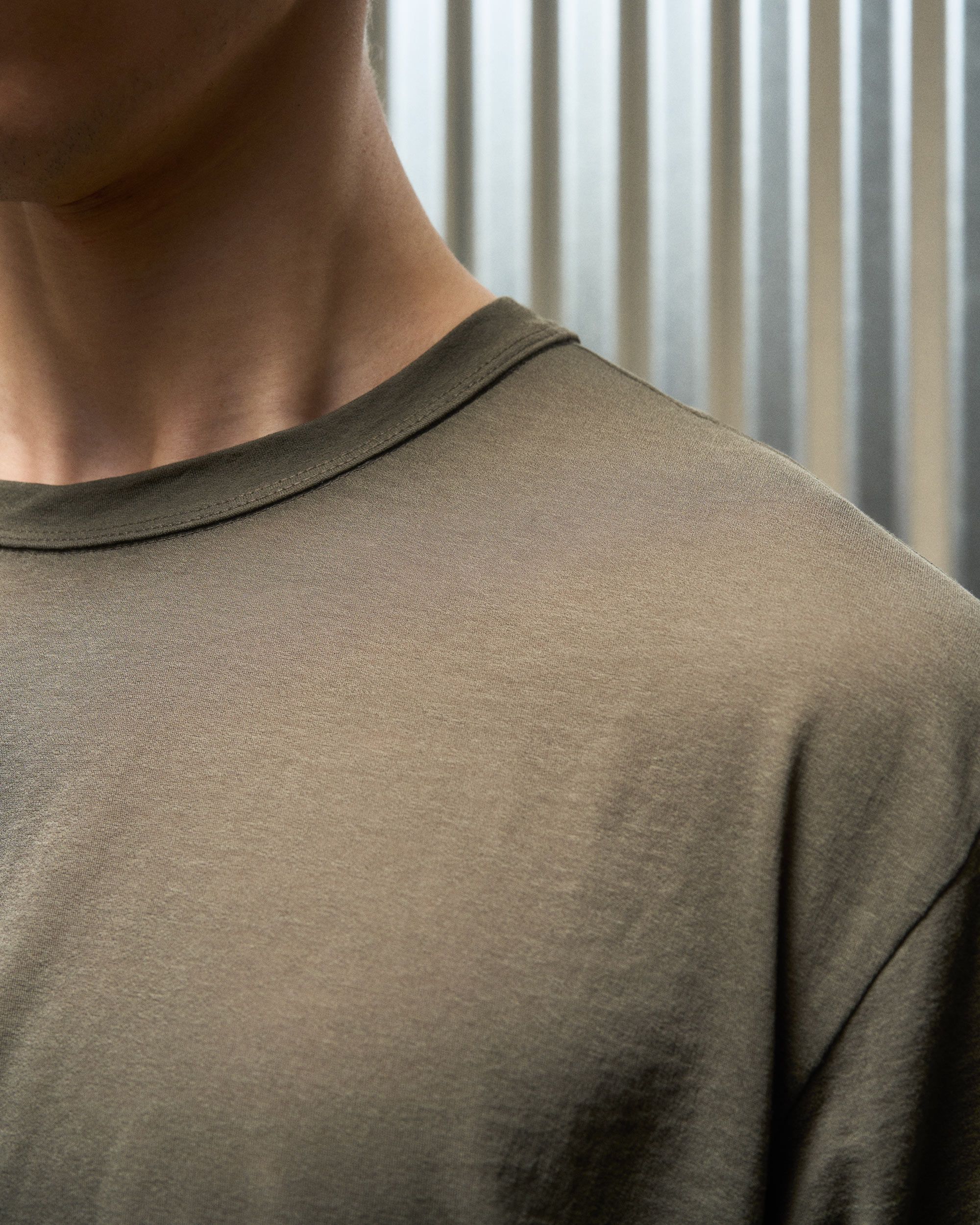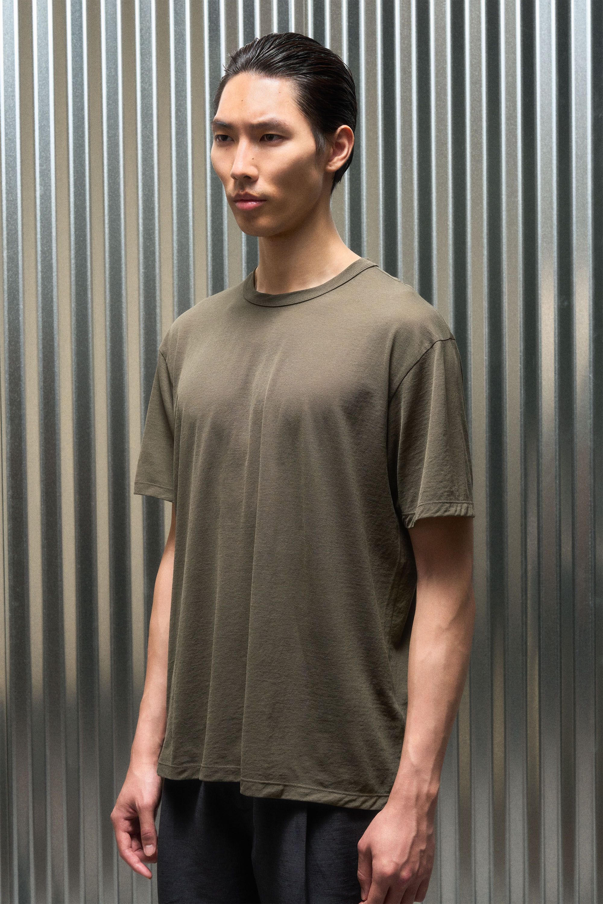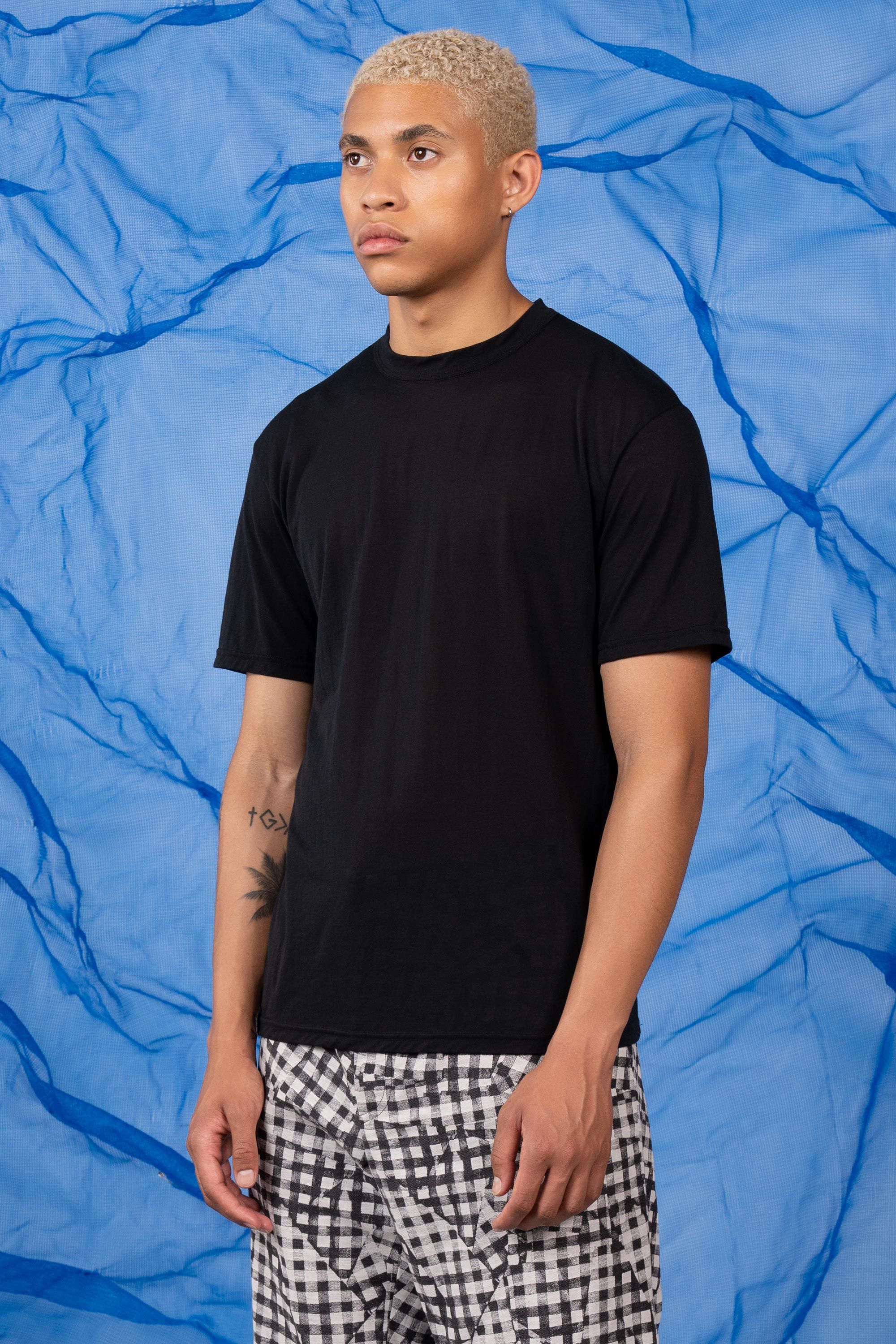 A t-shirt contemplating nothingness. Cotton is wrapped around a nylon filament core and enzyme cleaned to create a hyper-light cotton jersey that combin…