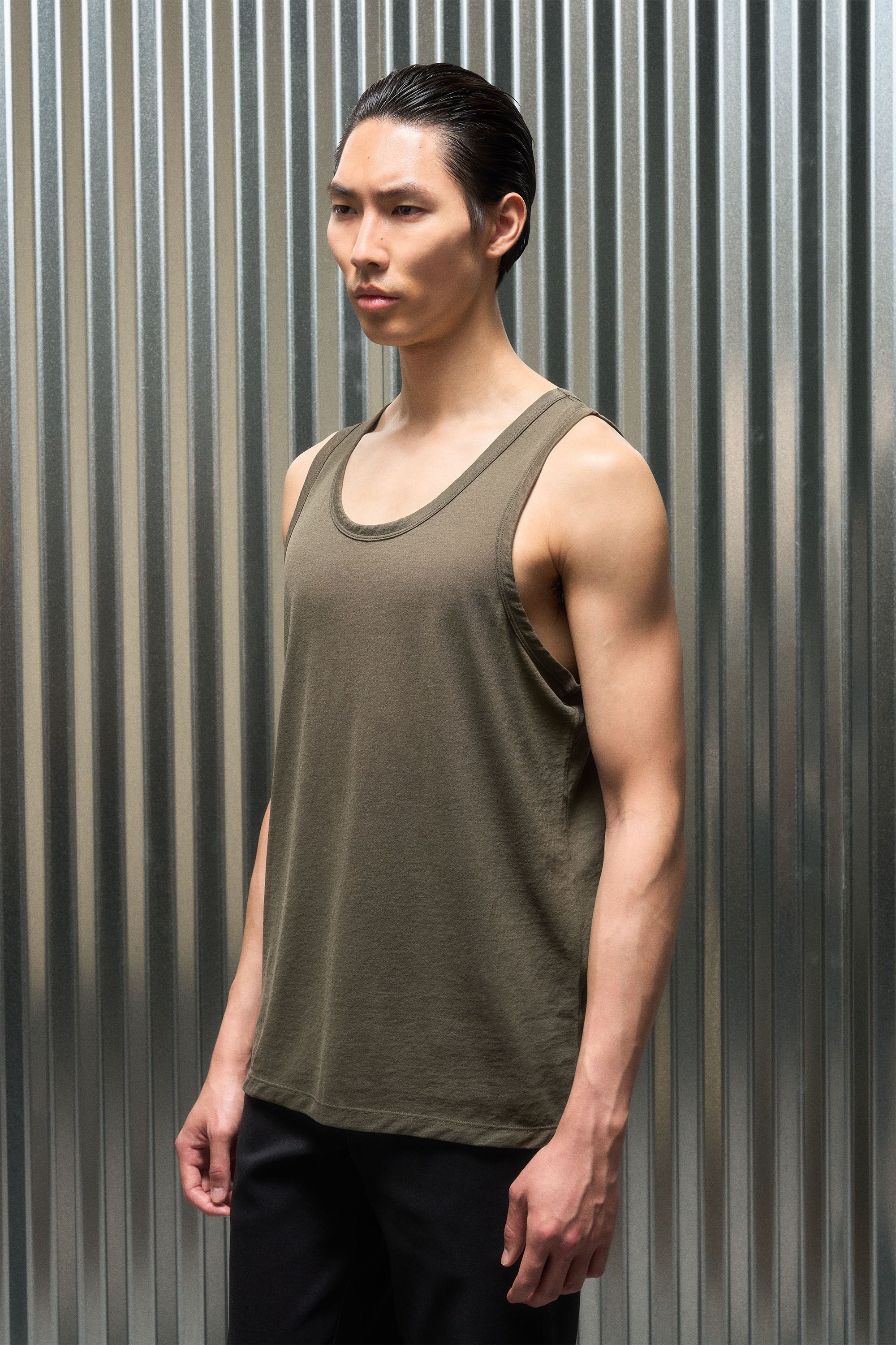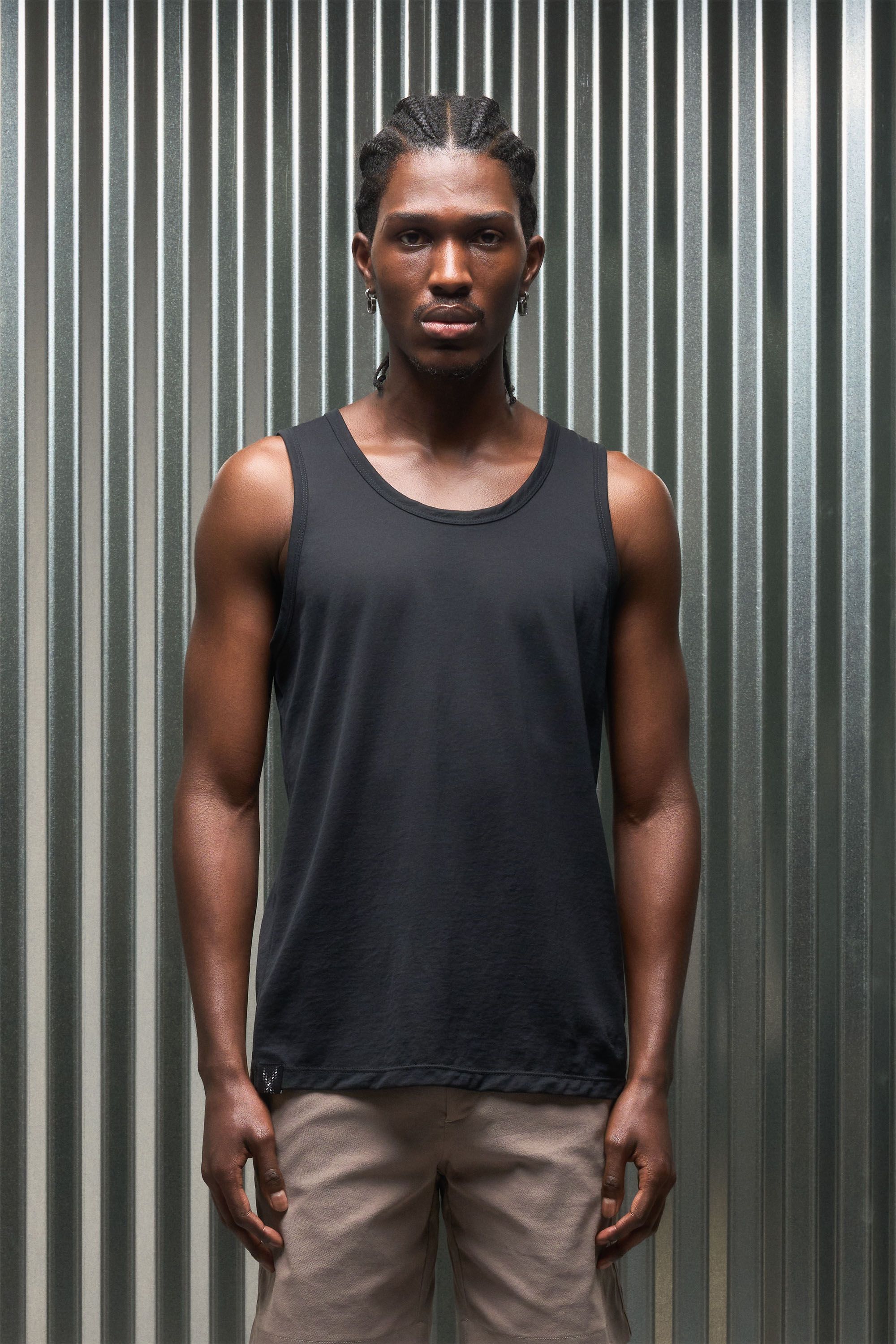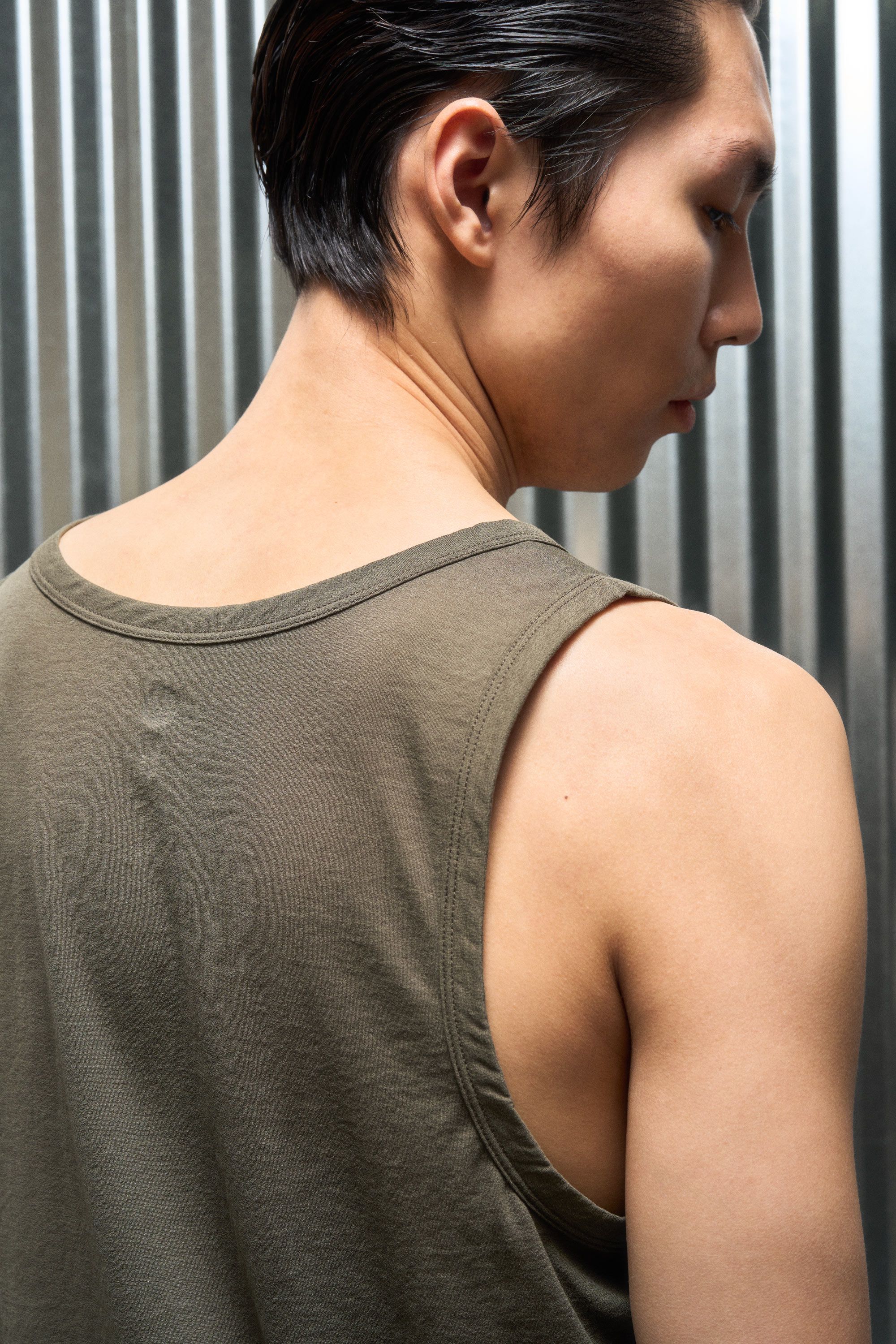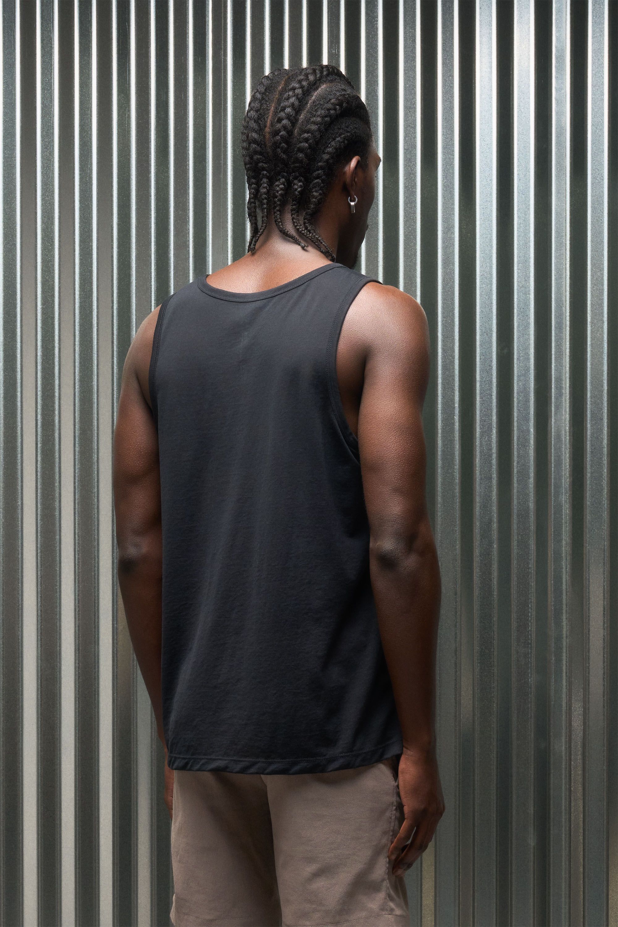 A loose cut tank top contemplating nothingness. Cotton is wrapped around a nylon filament core and enzyme cleaned to create a hyper-light cotton jersey …