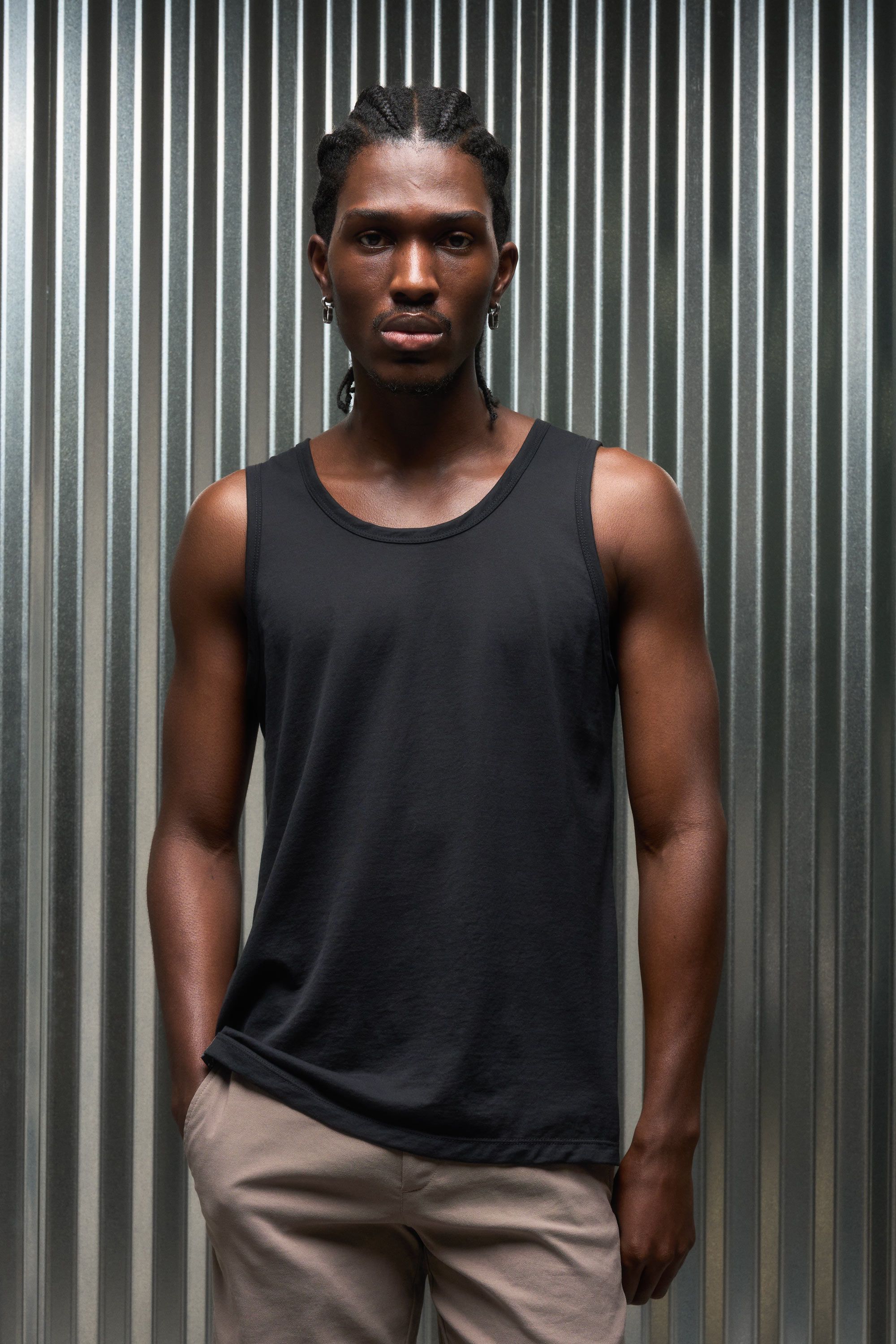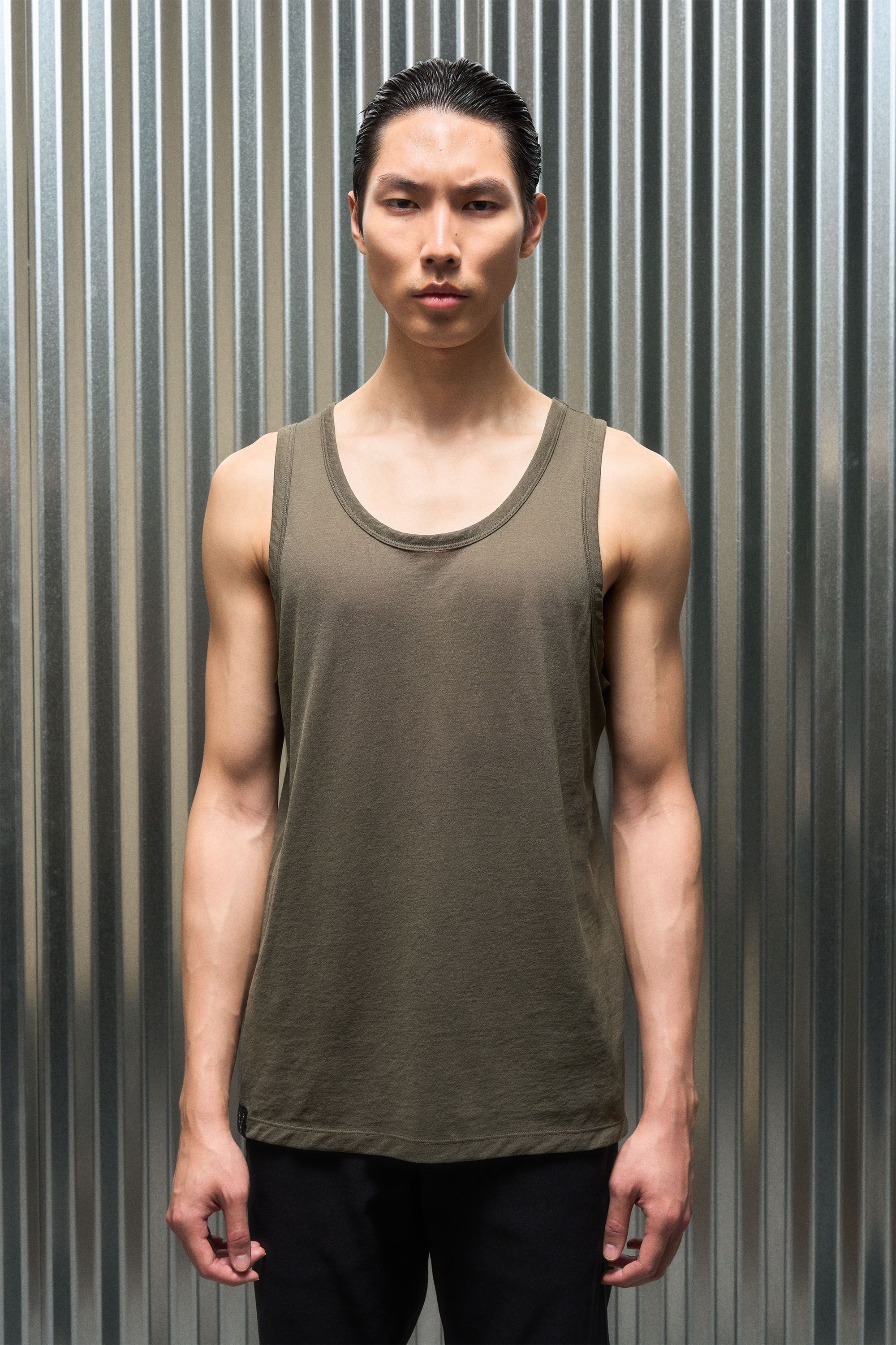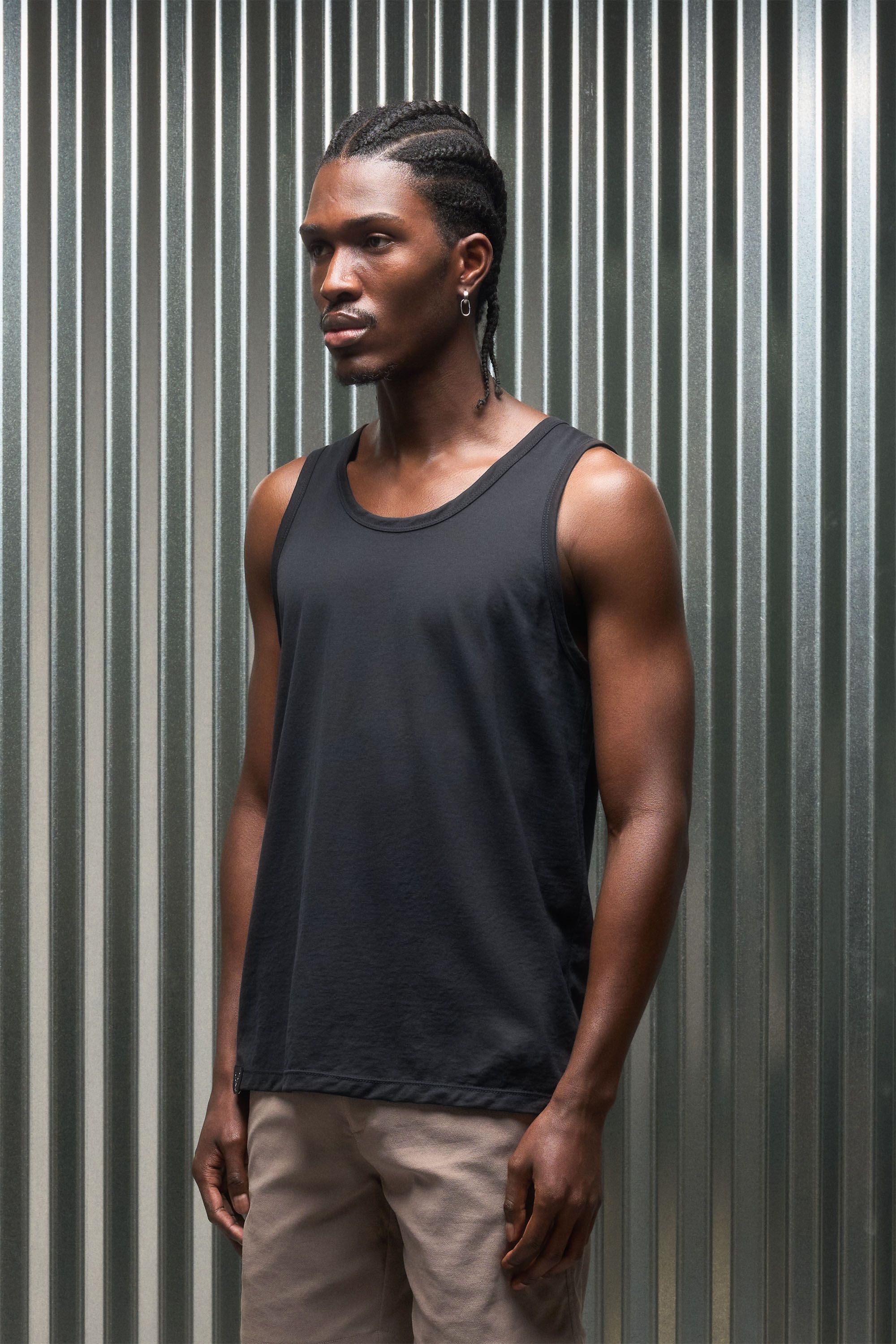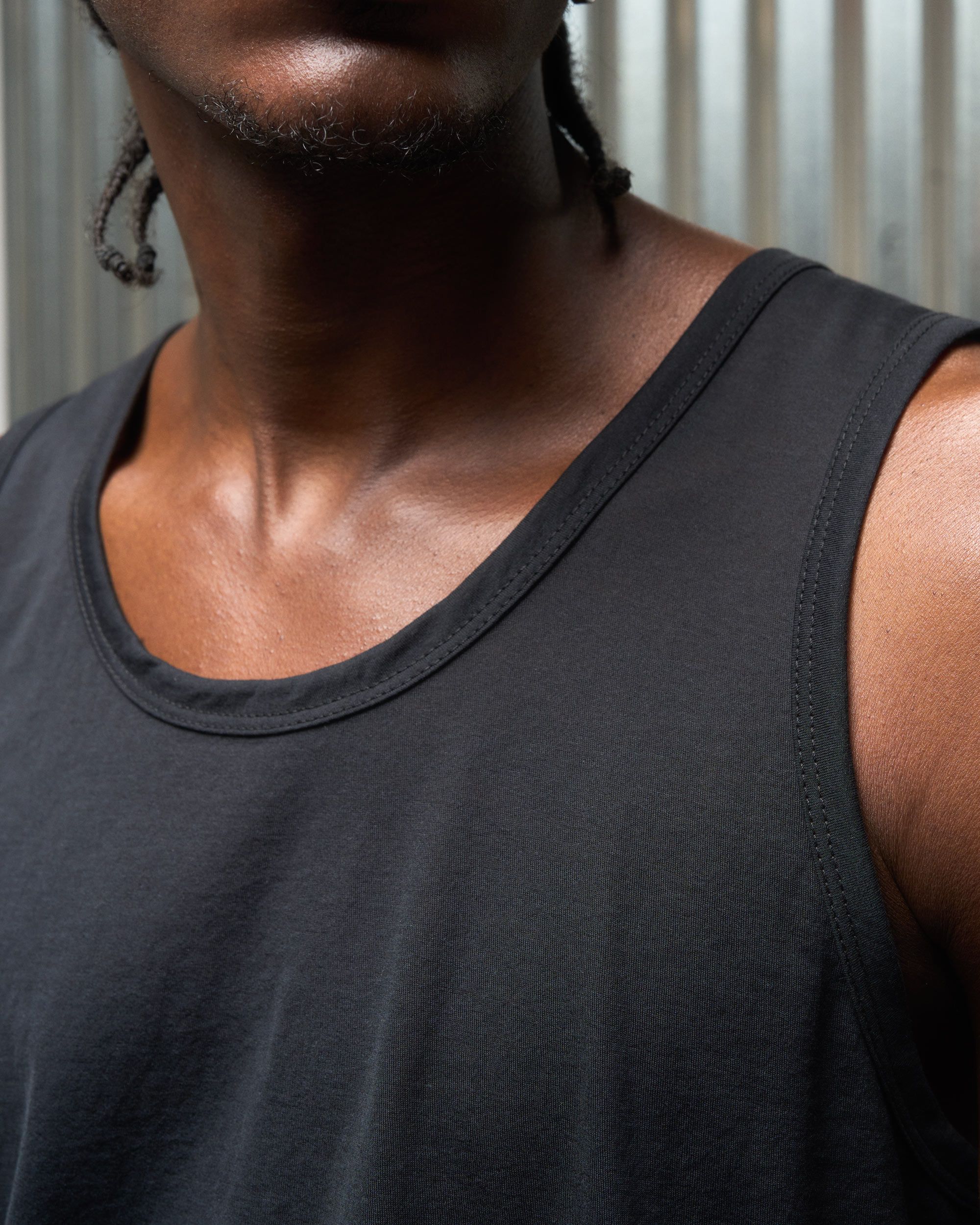 A loose cut tank top contemplating nothingness. Cotton is wrapped around a nylon filament core and enzyme cleaned to create a hyper-light cotton jersey …