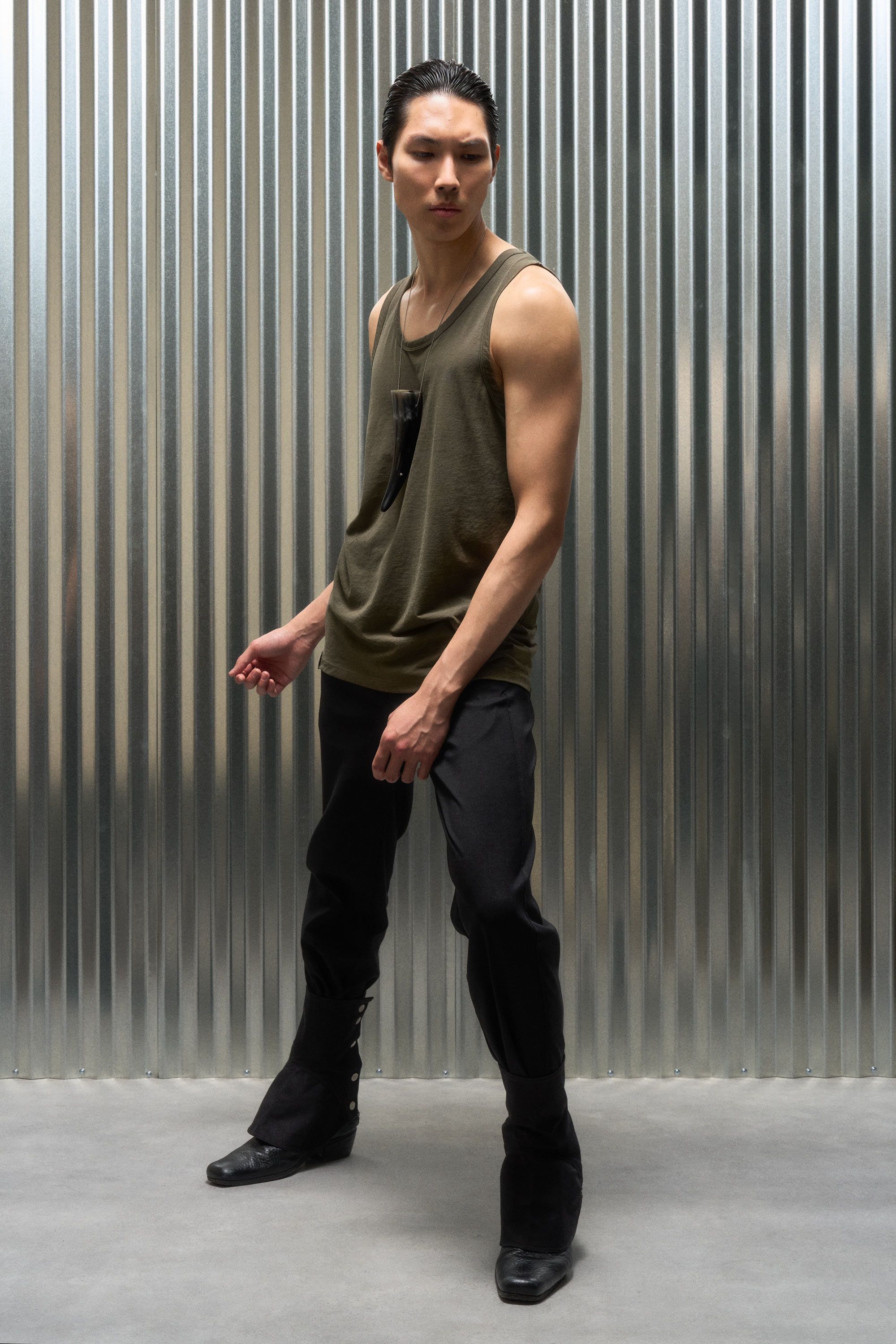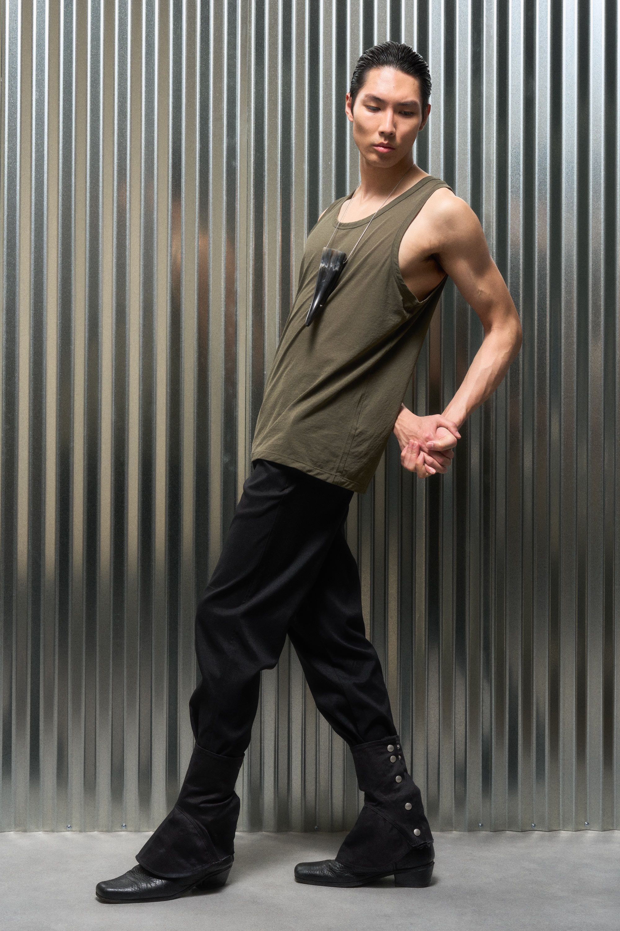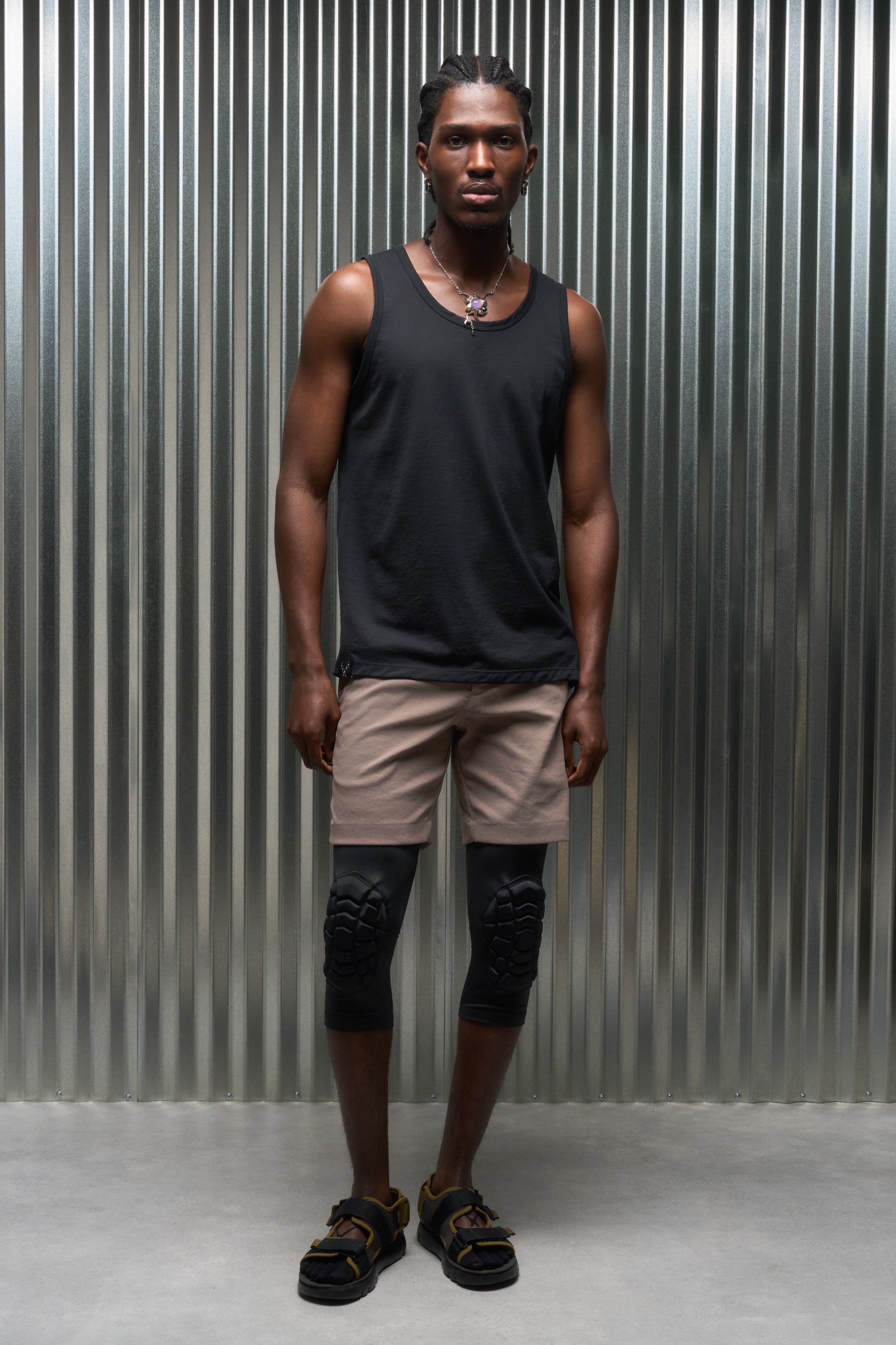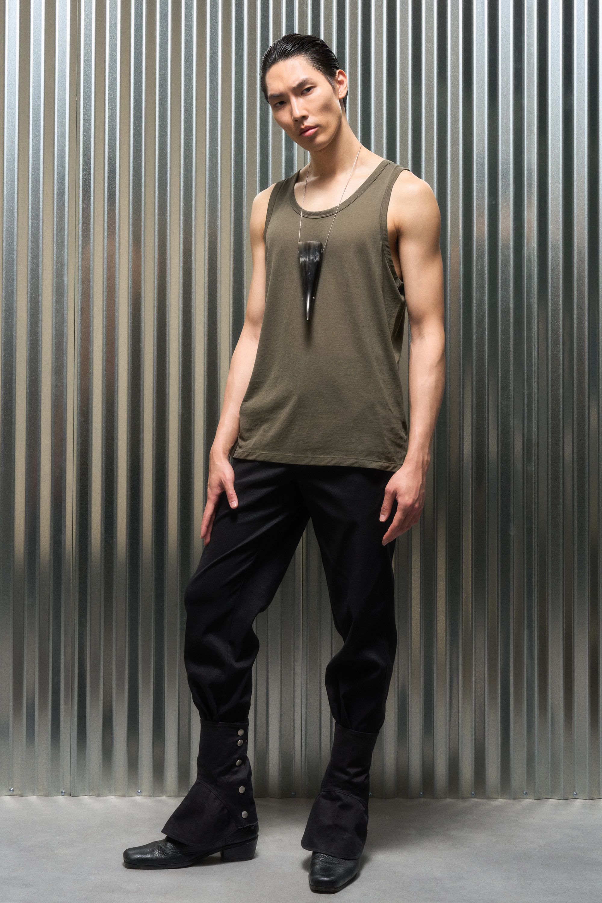 A loose cut tank top contemplating nothingness. Cotton is wrapped around a nylon filament core and enzyme cleaned to create a hyper-light cotton jersey …